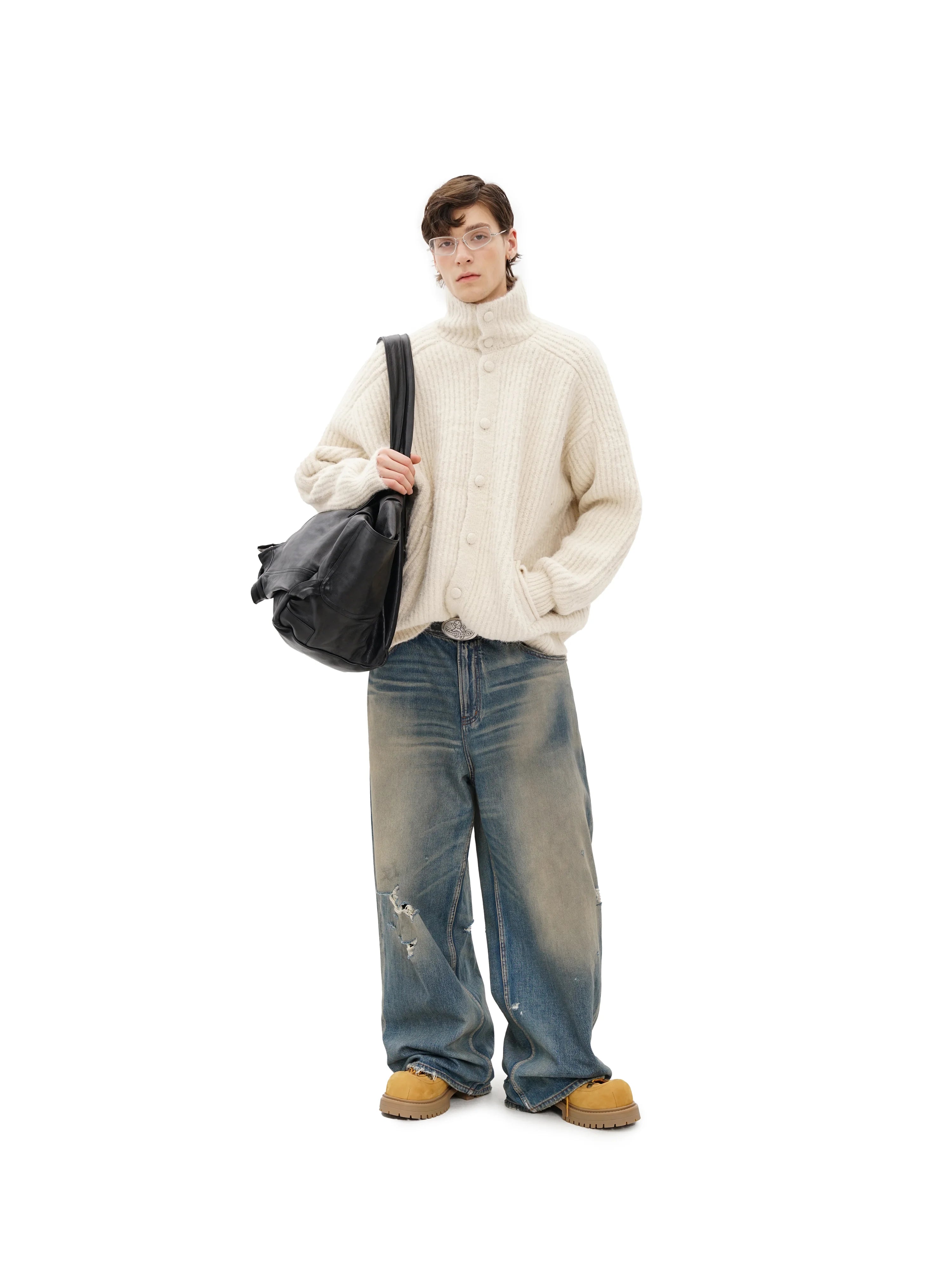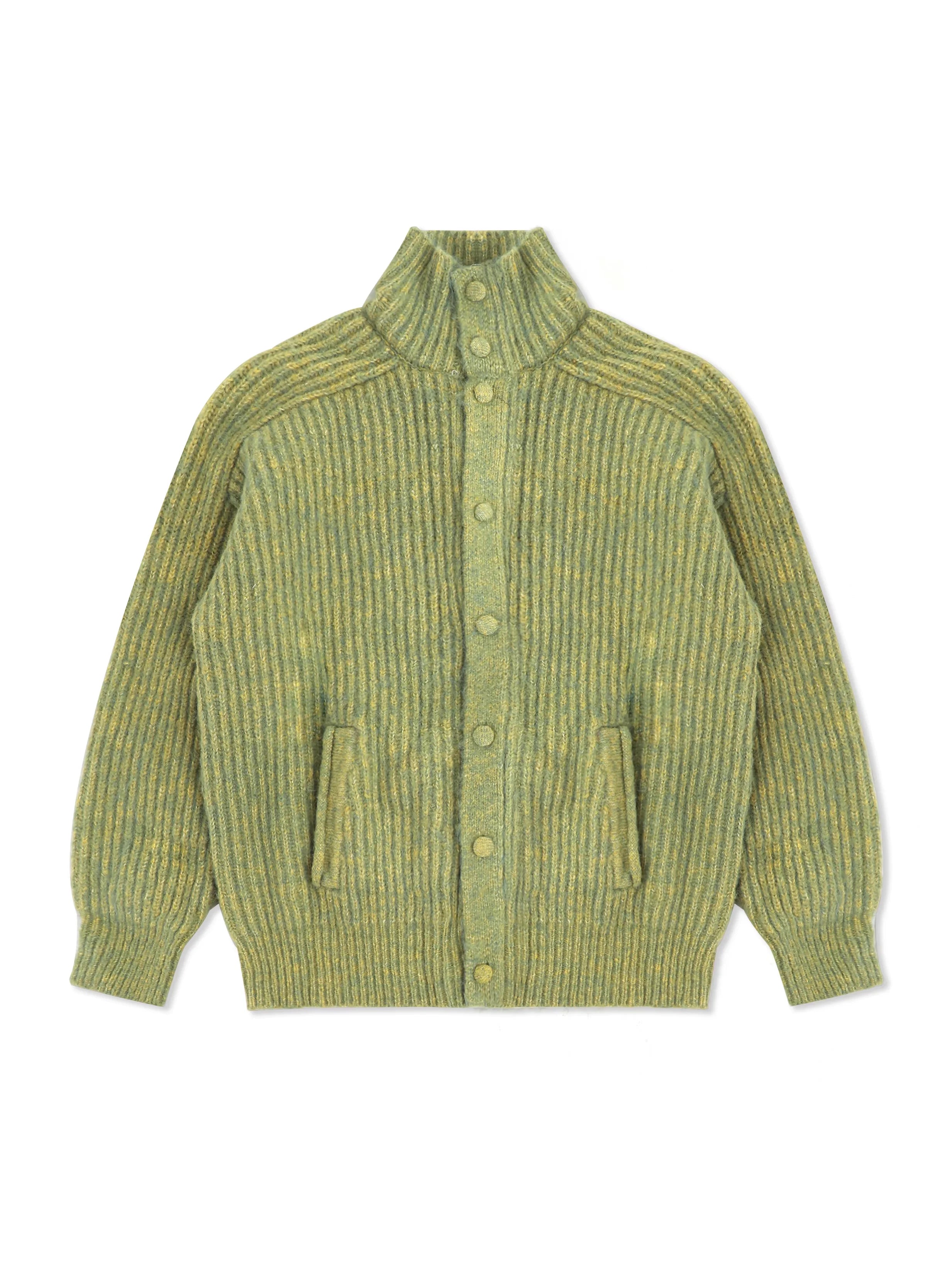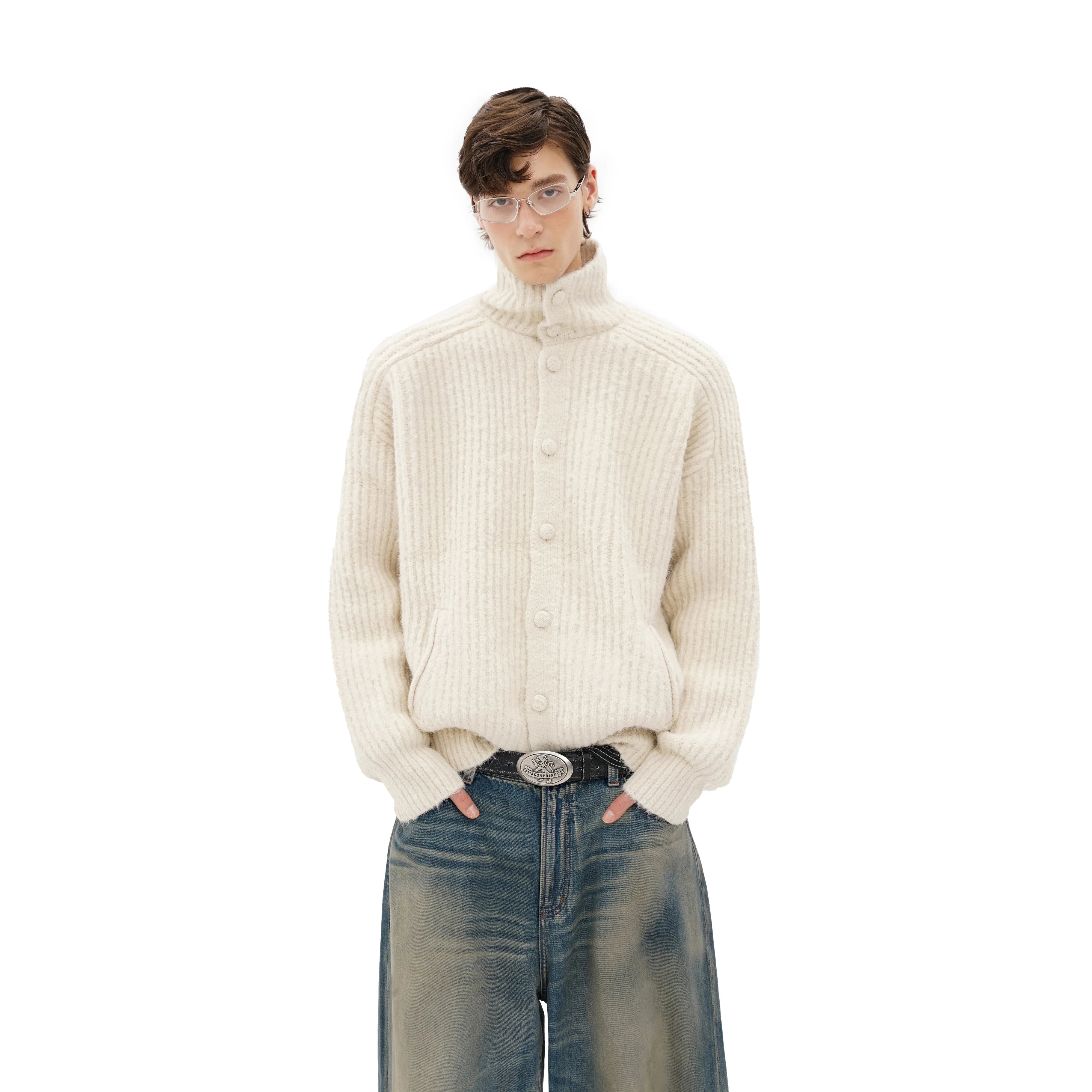 This men's ribbed knit cardigan is crafted from thick, textured wool, providing thermal warmth and comfort for colder seasons. Featuring a high turtleneck collar and large fabric-covered buttons down the front, it blends nostalgic charm with modern functionality. The design includes front pockets for convenience, while the relaxed fit pairs well with casual or vintage-inspired outfits. Ideal for layering, this stylish cardigan offers both practicality and timeless appeal.