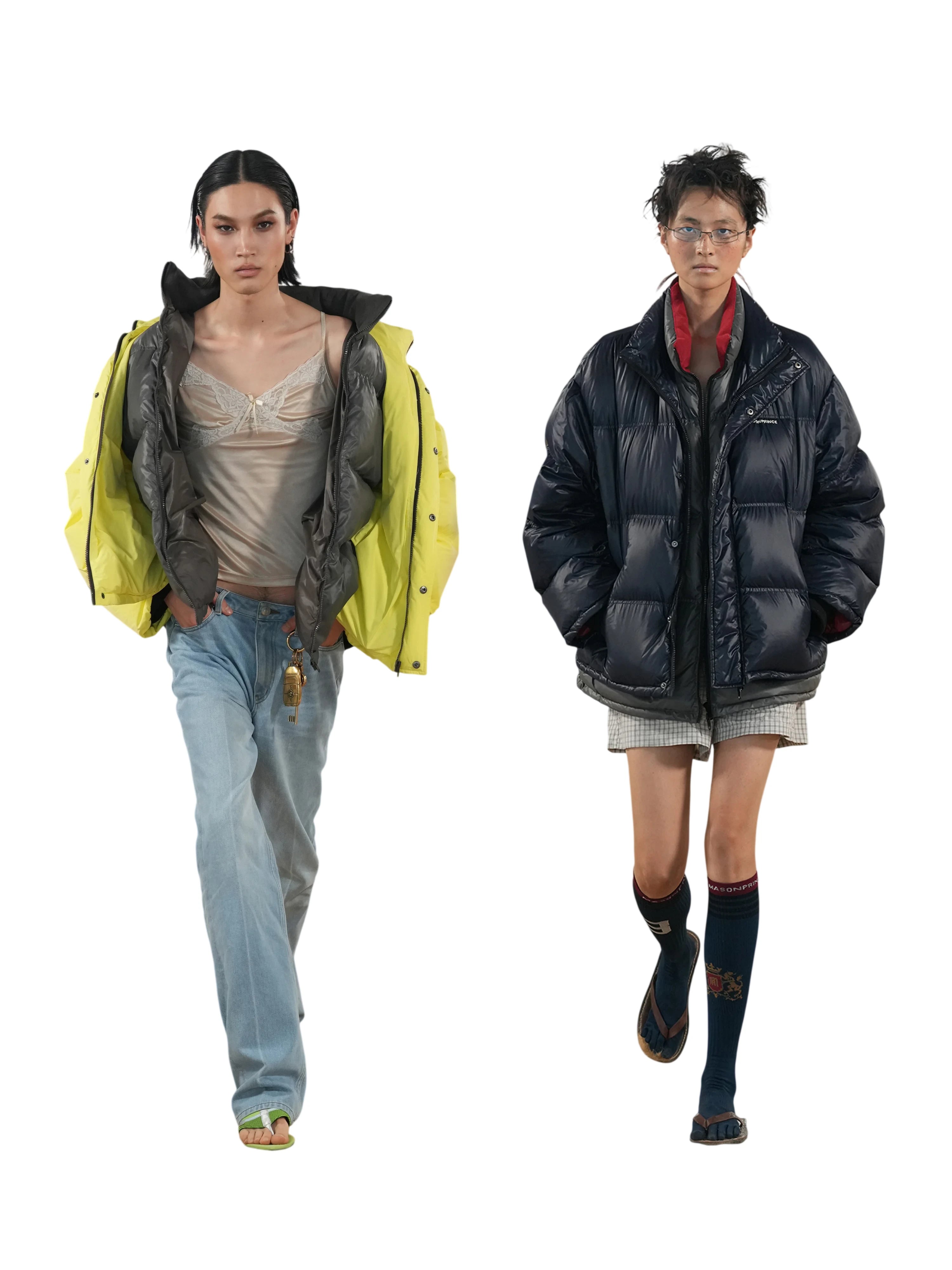 This two-piece colorblock down jacket features a contemporary oversized silhouette with a high collar and zip-up front, offering both warmth and style. Designed with a glossy navy finish accented by red and grey lining, the jacket adds a bold touch to any winter outfit. The unique design includes subtle chest branding and a playful "Mom's Afraid I'm Cold" motif for added personality. Worn by a female model, it combines effortlessly with casual layers like sweatshirts and athletic shorts for a versatile streetwear look.