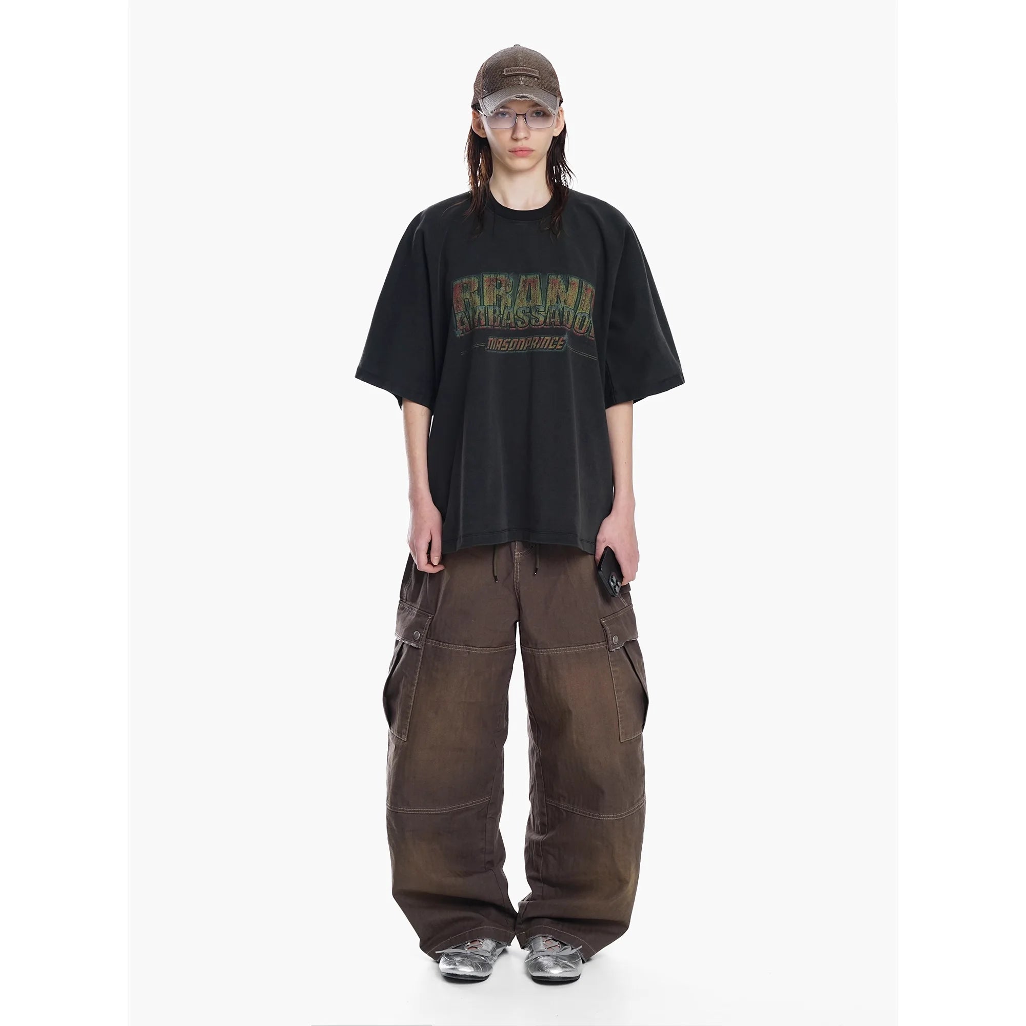 This men's two-piece set features a raglan sleeve A-line short t-shirt designed with vintage inspiration. The top showcases bold graphic text, enhancing its retro streetwear appeal. Paired with comfortable brown cargo pants, the outfit delivers a casual, utilitarian look complemented by rugged details. A perfect choice for modern urban style with a grunge edge.