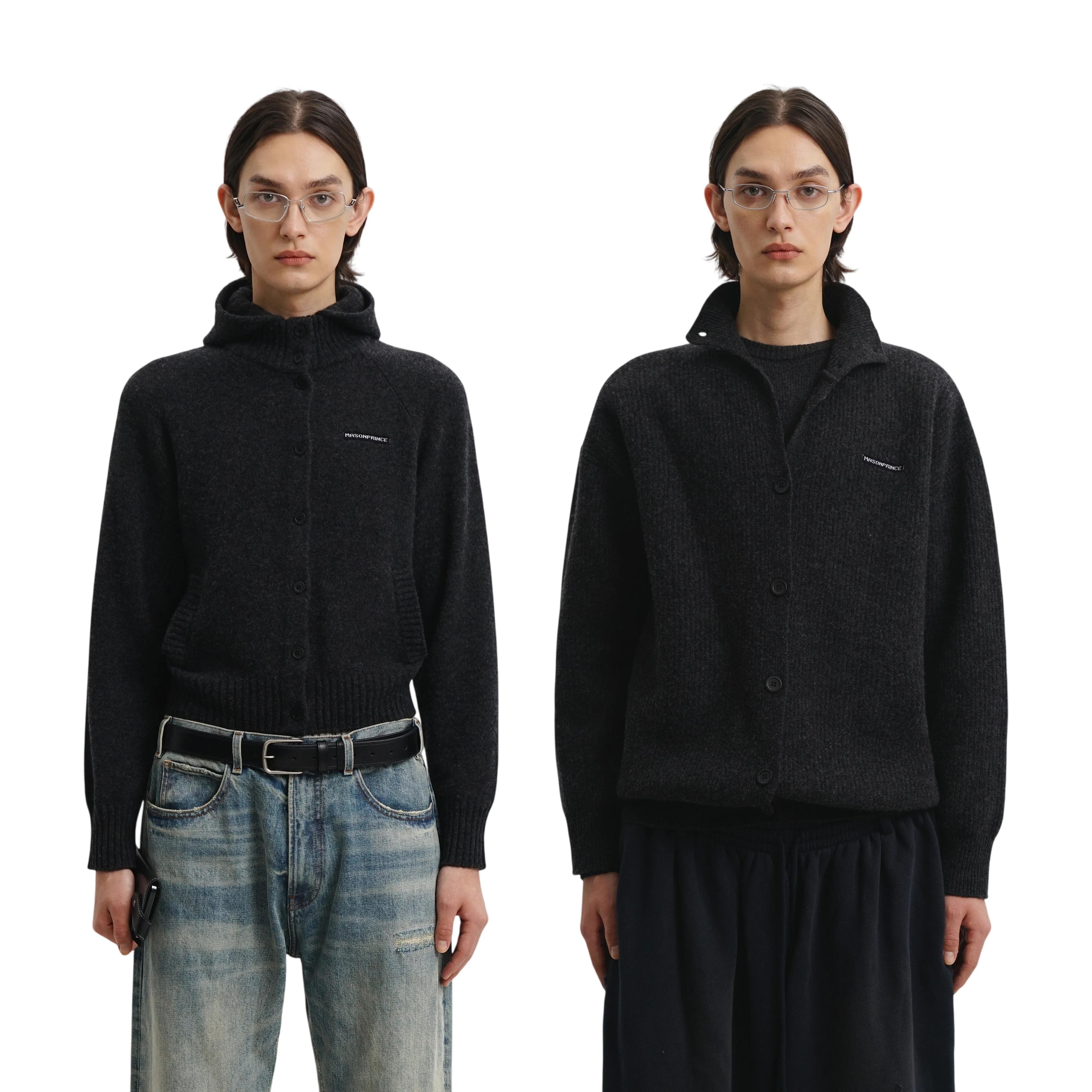 This full wool cardigan from the Family Series offers versatile styling in a universal fit. Featured in a dark charcoal hue, it presents two distinct looks: a casual option with the hood up paired with light blue distressed jeans, and a more refined layered outfit with the collar folded down over a crew-neck sweater and loose black trousers. Understated branding on the left chest and minimal styling with clear-frame glasses complete the look. Designed for men seeking both comfort and style.