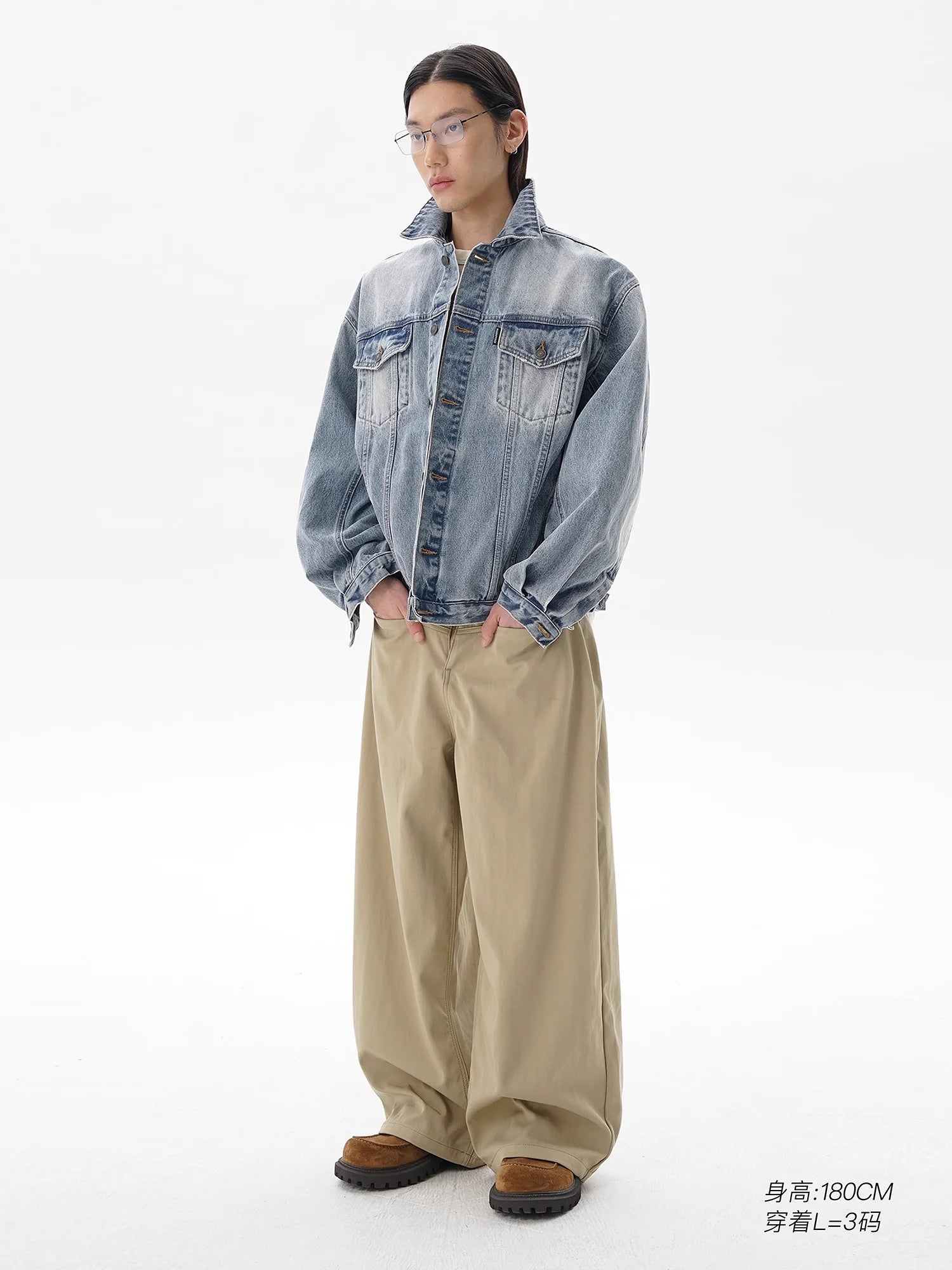This men's light blue denim jacket features a vintage-inspired, eco-washed finish with a slightly oversized silhouette. Designed with a button-up front and sturdy metal buttons, it includes two flap chest pockets with button closures and practical side welt pockets. Prominent vertical seams on the front add modern structure to its classic design. Worn here with a beige graphic t-shirt and loose-fitting tan trousers, it delivers a casually contemporary look.