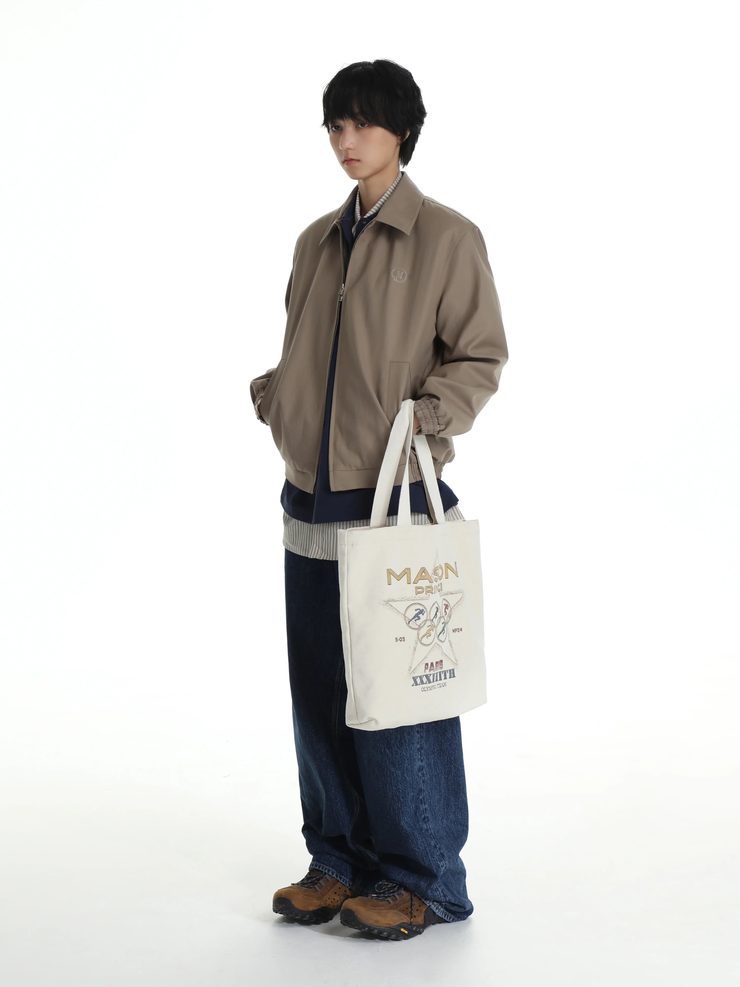 This men's vintage-style jacket features a structured lapel design with built-in shoulder pads for a defined silhouette. Crafted in a light brown tone, it includes a zip-up front and two vertical welt pockets for a clean, understated look. Subtle embroidered detailing on the left chest adds a touch of refined branding. Elasticized cuffs and hem provide a secure, comfortable fit, making this jacket a versatile choice for casual or elevated everyday wear.