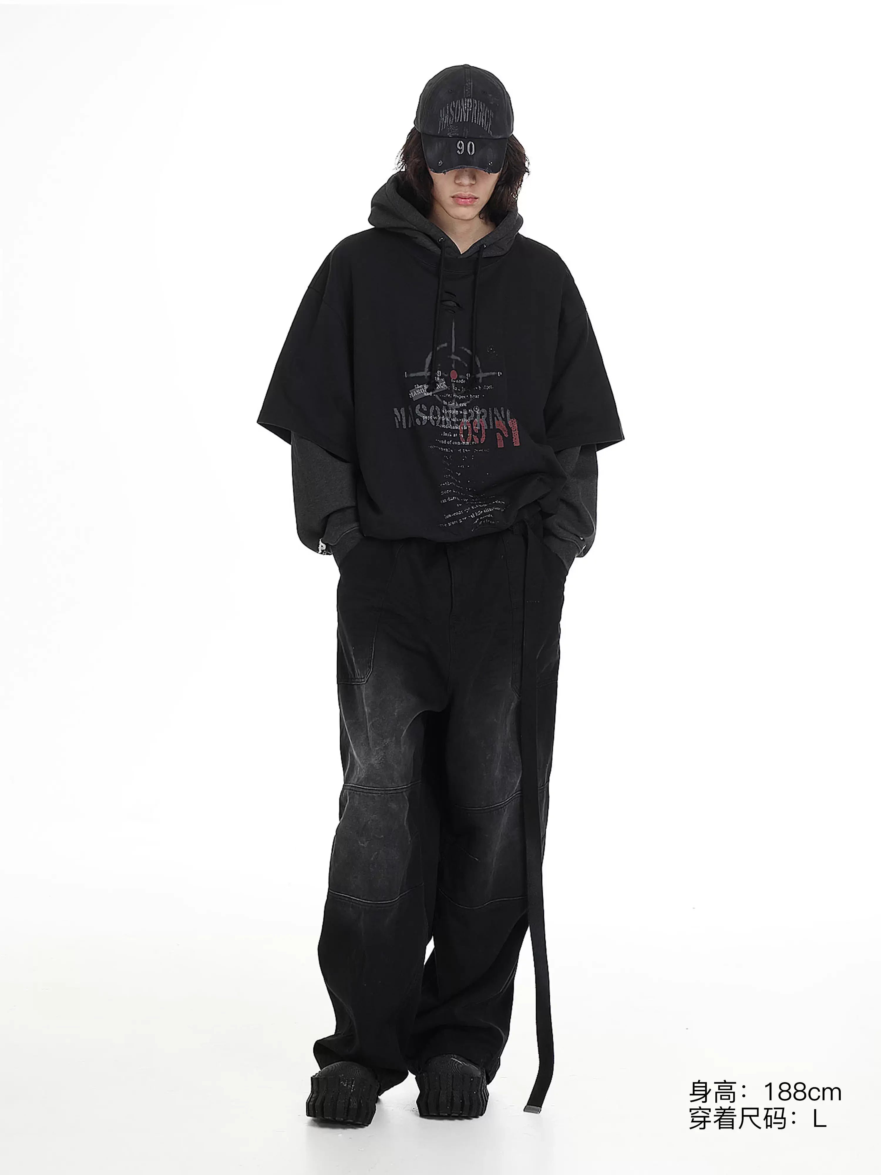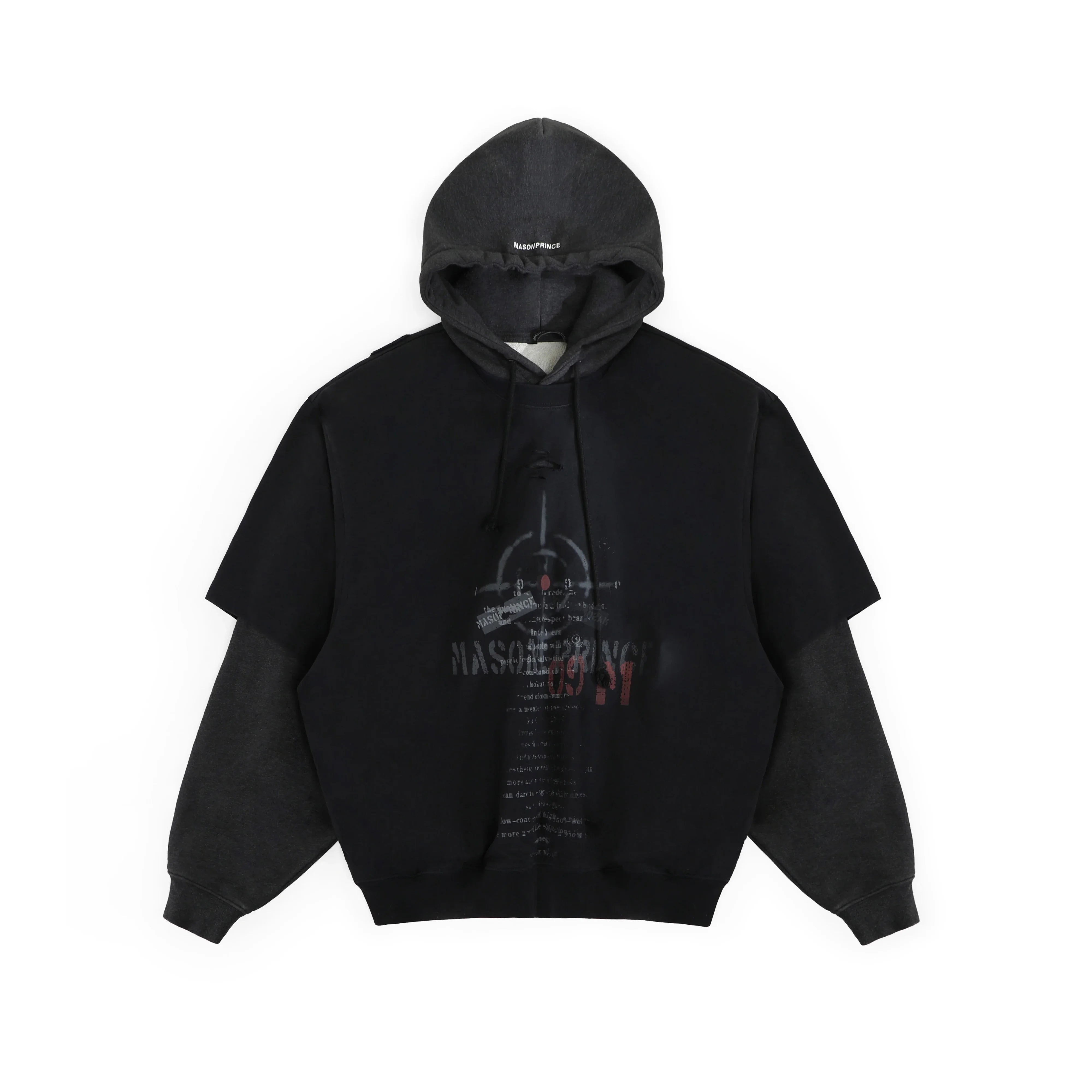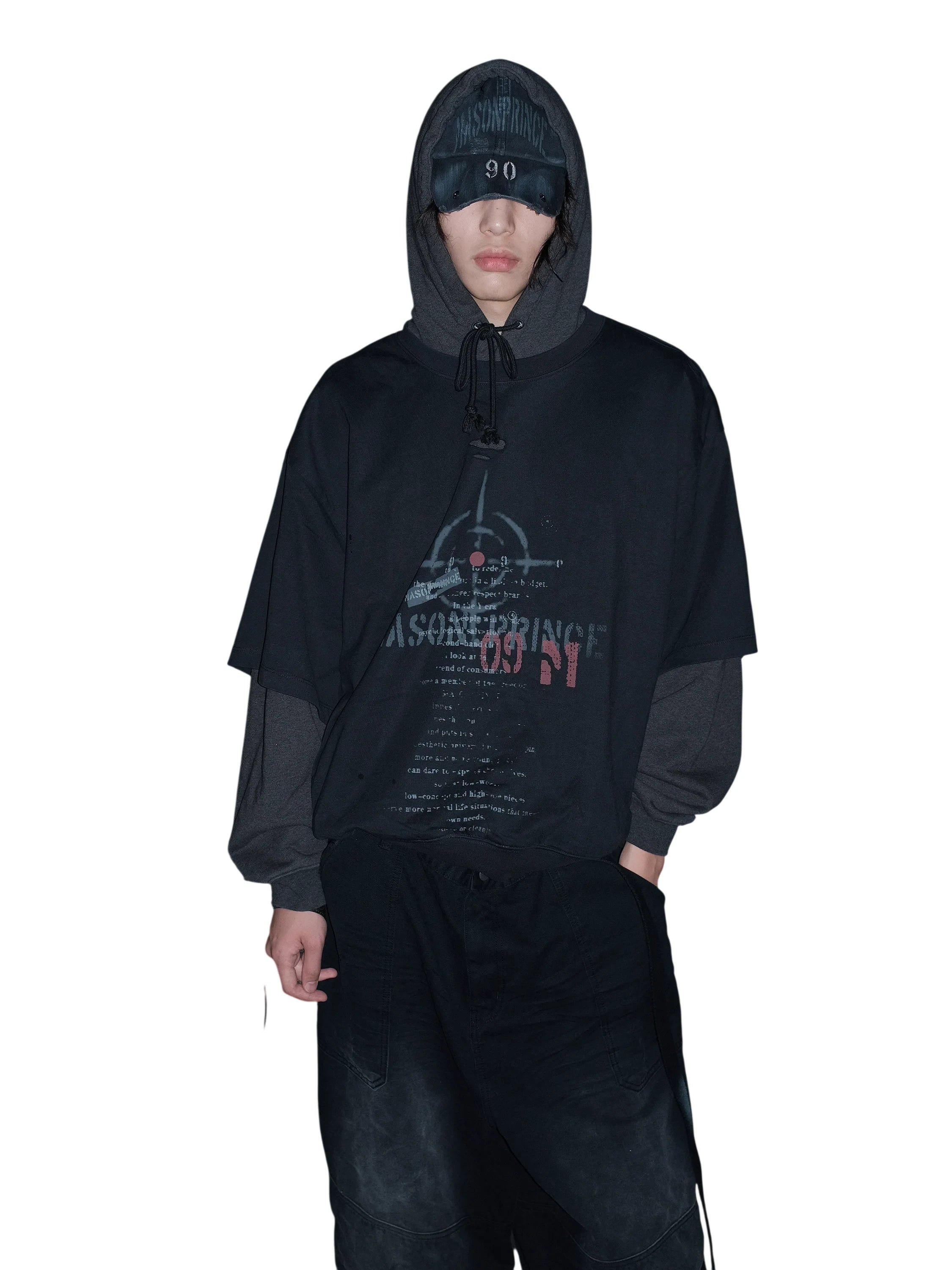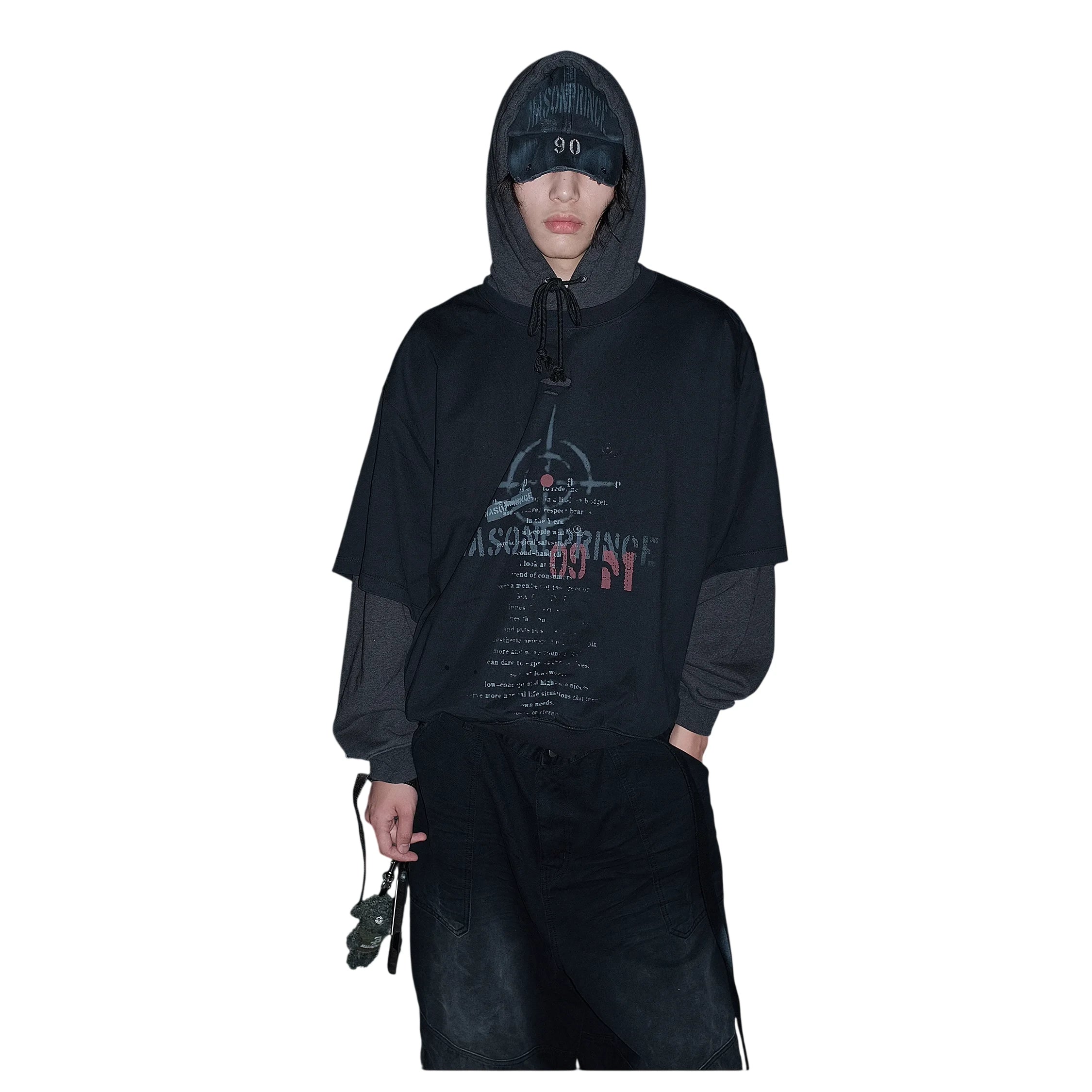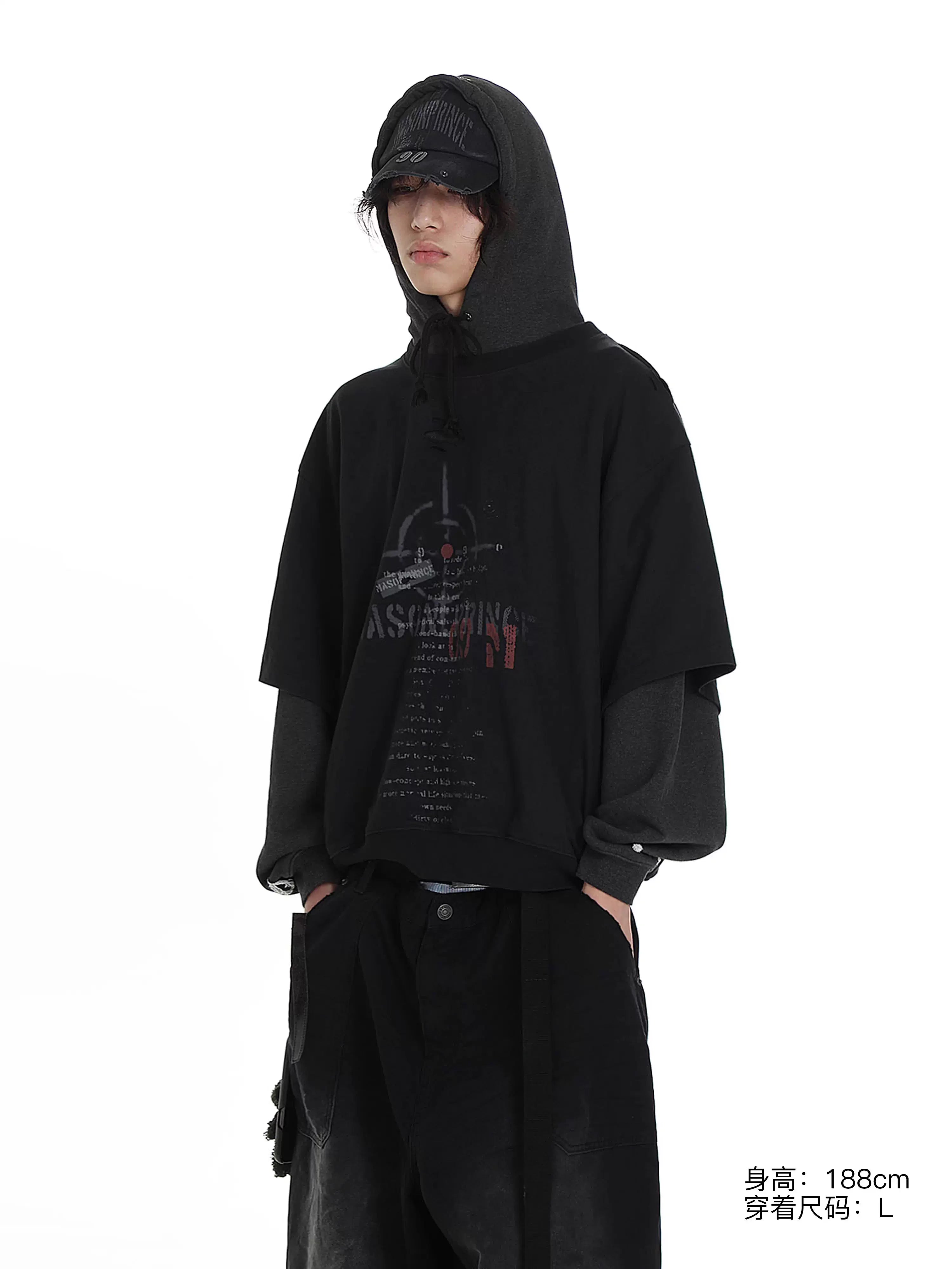 This men's vintage-style sweatshirt features a fashionable double-layered design with a black oversized T-shirt overlaying a gray hooded long sleeve. The top layer showcases an eye-catching crosshair graphic with bold text and red-white detailing. The inner hoodie adds warmth and depth to the look, complete with a drawstring hood. Perfect for streetwear enthusiasts, this piece offers an edgy, urban aesthetic ideal for casual outings.