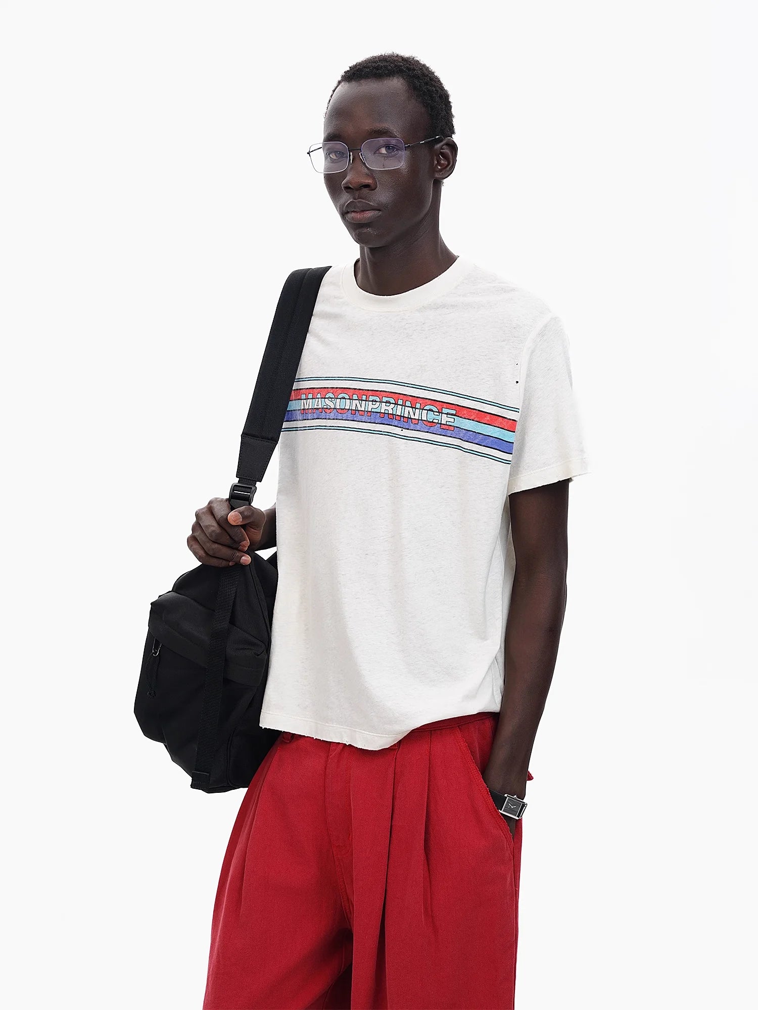 This men's short-sleeve tee combines breathable linen-cotton fabric with a vintage washed finish for a comfortable and effortlessly cool look. Featuring bold horizontal red, blue, and black stripes across the chest, it offers timeless style perfect for casual summer days. Ideal for pairing with shorts or jeans, this versatile tee is a must-have for laid-back wardrobes.