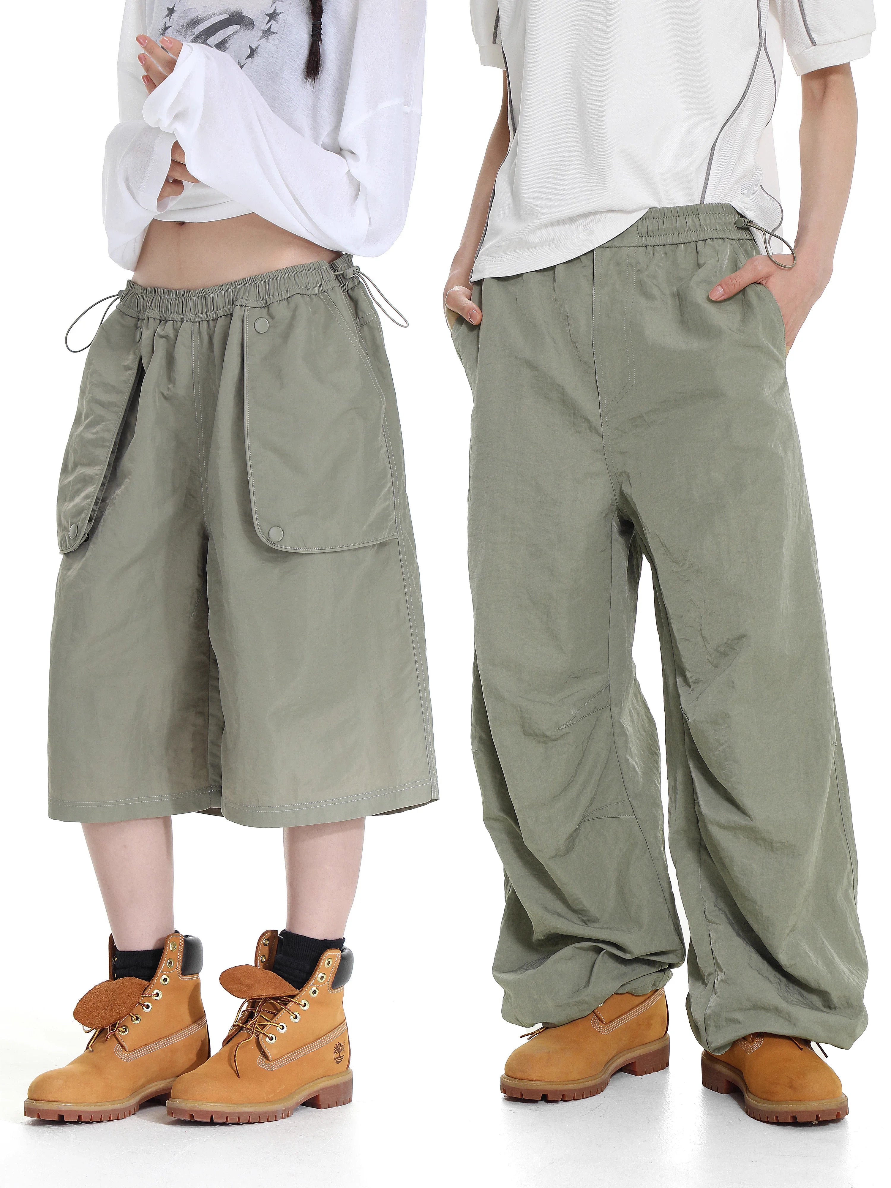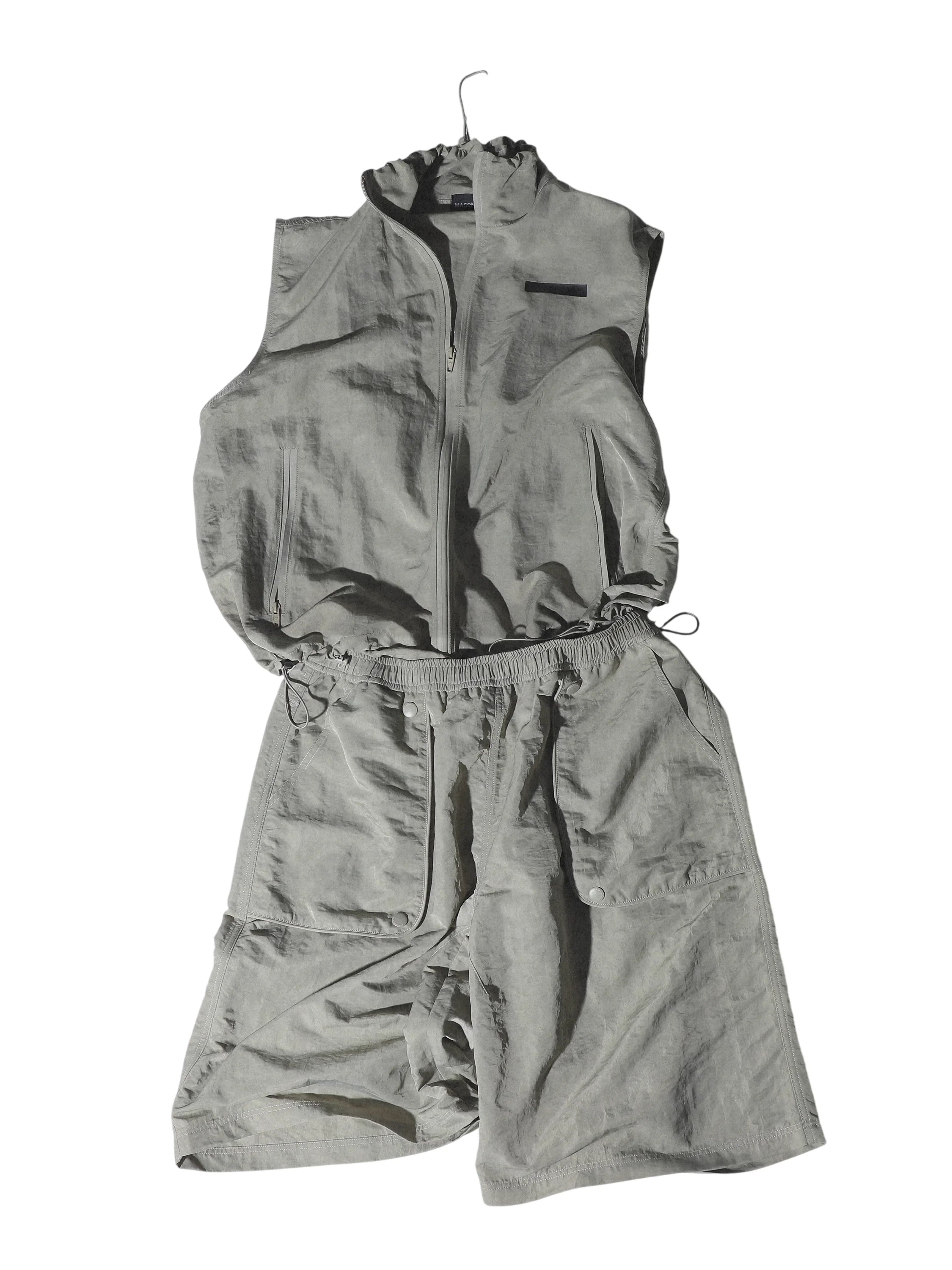 This outdoor-ready set features a sleeveless zip-up vest and matching cargo shorts made from lightweight, waterproof nylon with a subtly crinkled finish. The vest includes a high drawstring collar, center zipper closure, and zippered side pockets for secure storage. The knee-length shorts are designed with an elastic drawstring waistband, side pockets, and flap cargo pockets with snap closures for added utility. Ideal for warm-weather activities, this unisex set offers a functional and modern athleisure style.