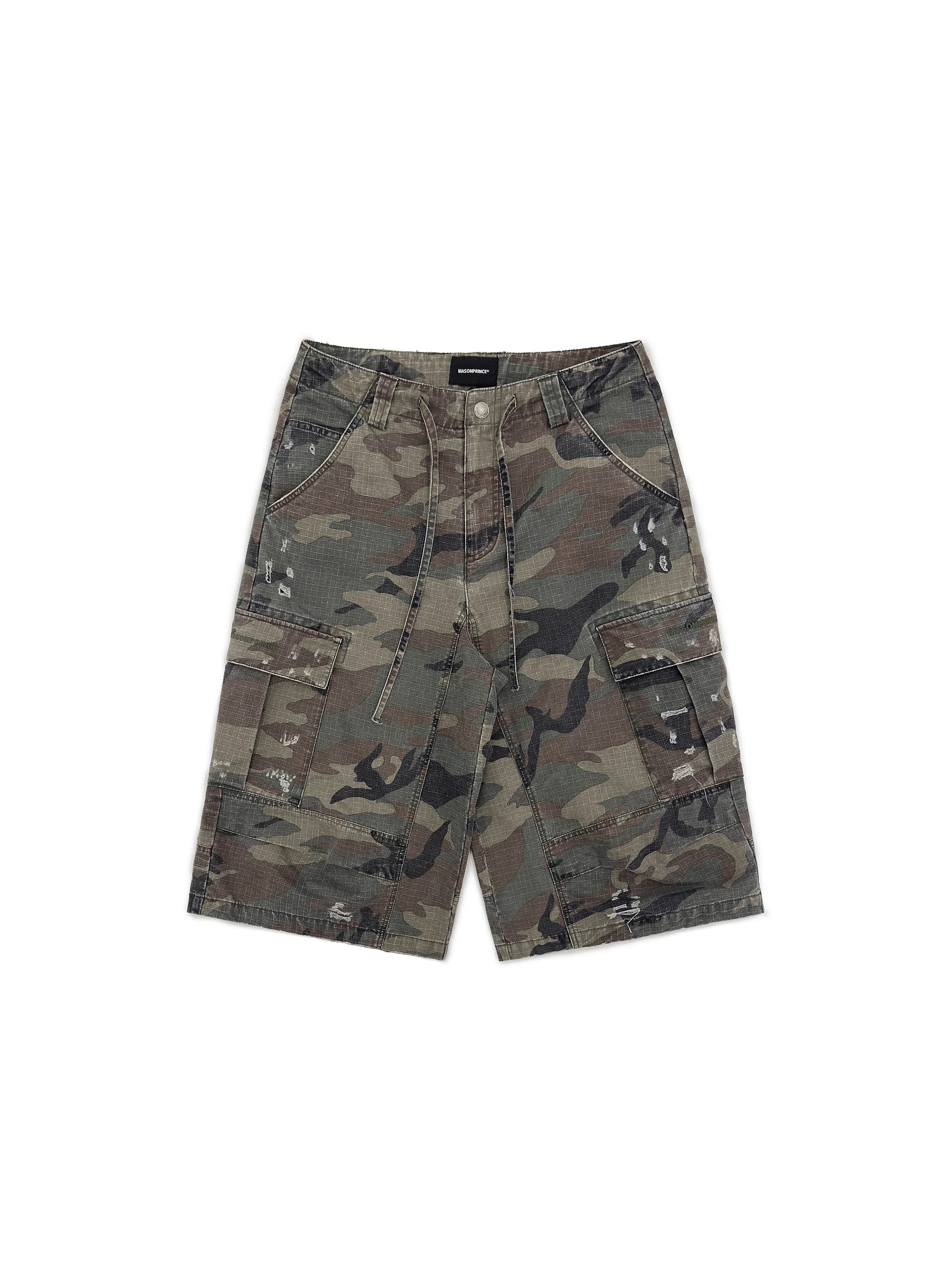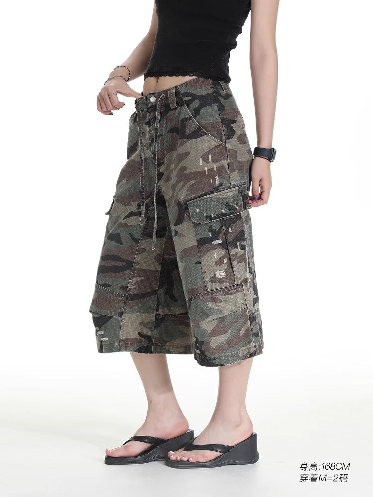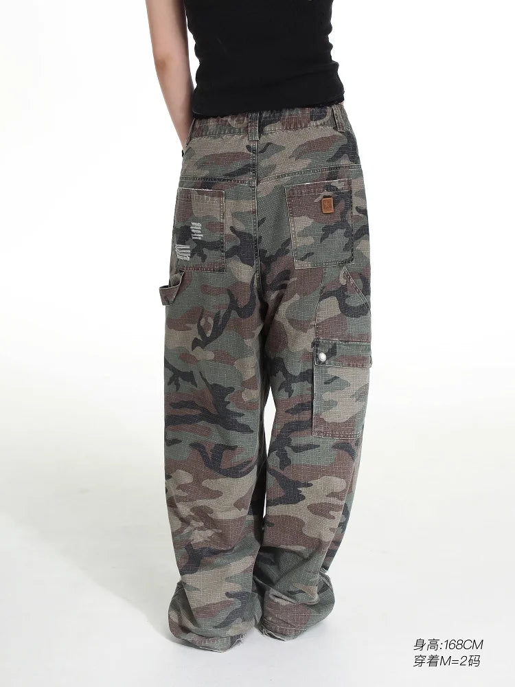 These women's camouflage cargo pants blend rugged outdoor style with everyday wearability. Designed in a classic green and brown woodland camo pattern, they feature a relaxed, straight-leg silhouette with a drawstring waistband for adjustable comfort. Available in two versatile styles—cropped mid-calf length and full-length floor-sweeping cut—both variations are crafted from durable fabric and include multiple utility pockets for functionality. Subtle distressed details add a touch of street-ready character, making these pants ideal for casual and workwear looks alike.