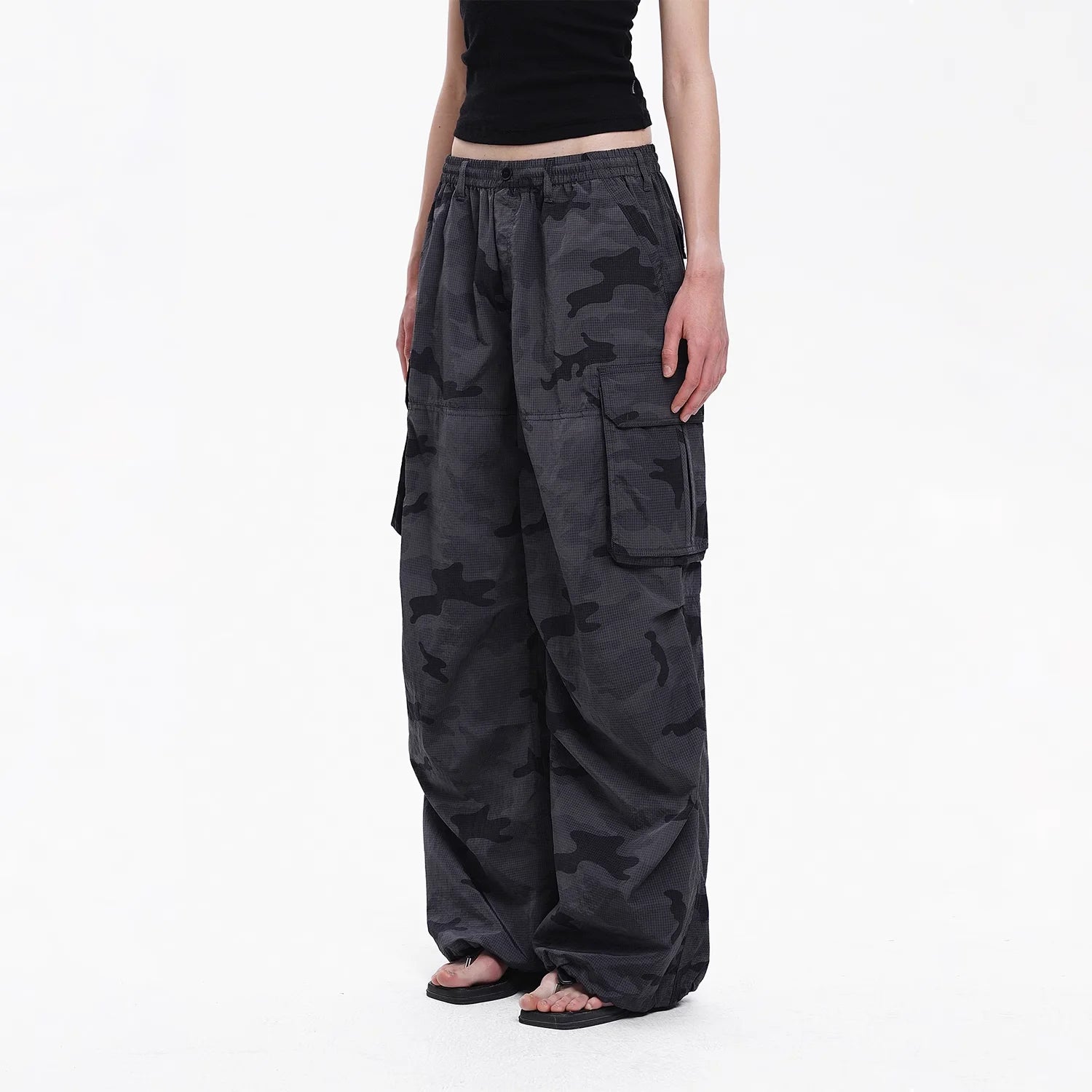 Step into relaxed utility style with these women's camouflage parachute pants. Featuring a dark grey camo print, these lightweight cargo pants are designed with a drawstring waistband for adjustable comfort and a highly baggy fit for a laid-back look.