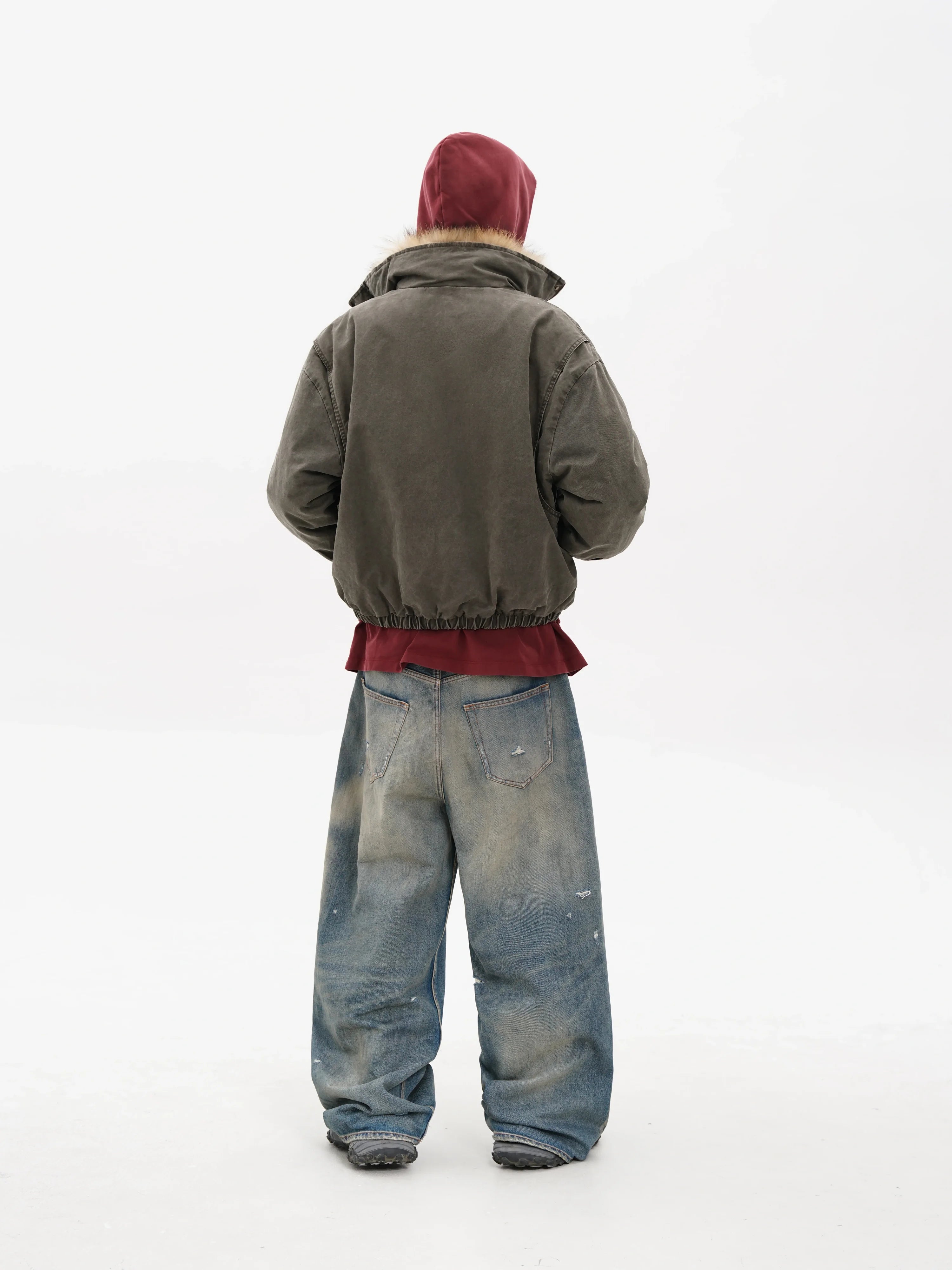 The jacket's highlight is its oversized real fur trim, wrapping around the collar or hood in luxurious tones of tan, brown, and grey for rich texture and enhanced warmth. A small leather patch on the chest adds a distinctive detail. Perfectly suited for cold-weather outings or outdoor adventures.