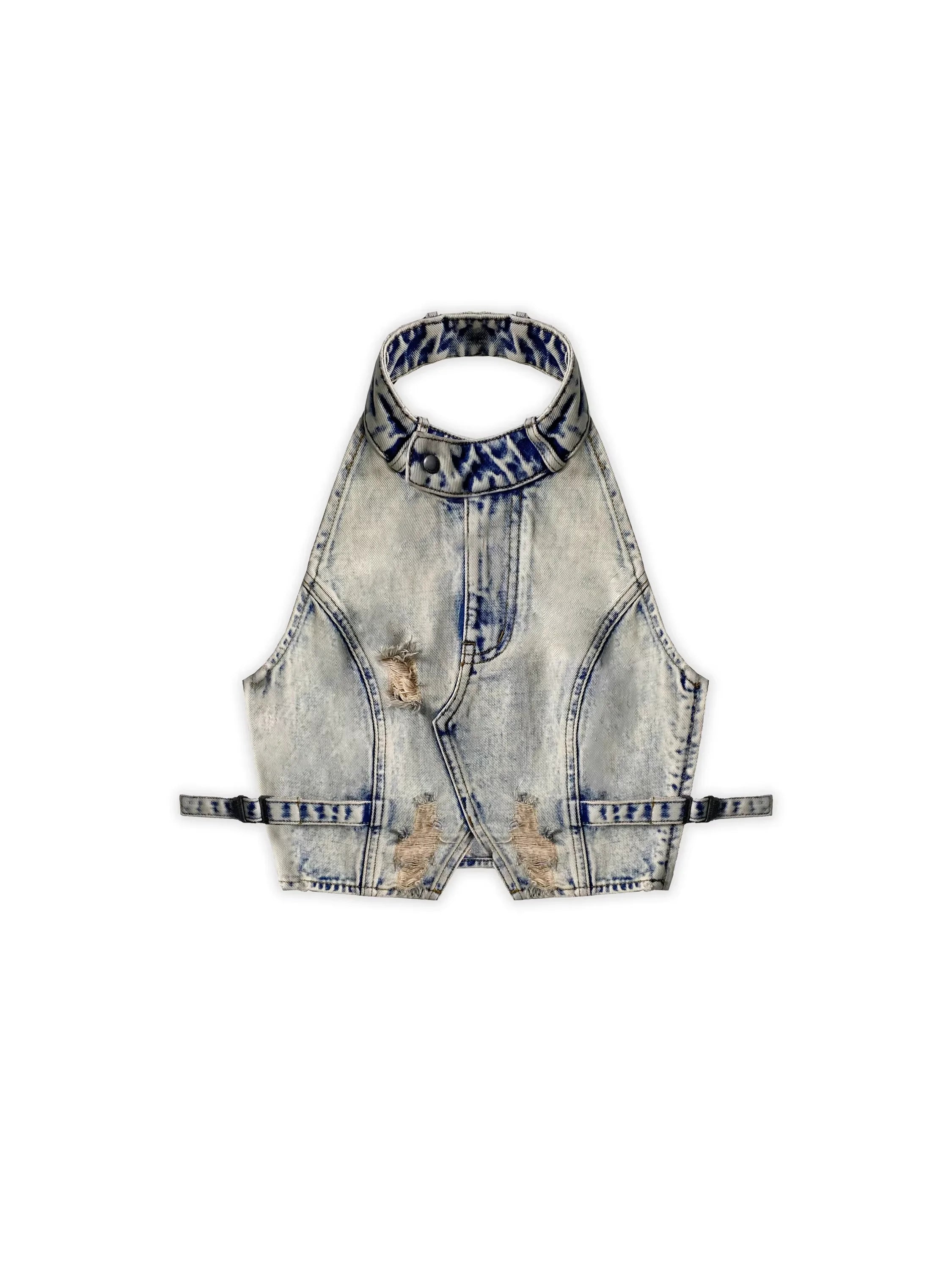 Make a bold fashion statement with this stylish two-piece denim set for women. Featuring a light snow-wash finish, the sleeveless halter crop top is designed with a high neckline, frayed edges, faux pocket details, and exposed seams for a structured fit. The matching high-waisted mini skirt includes a front zipper, faux slit pockets, and raw hems with subtle front slits on both legs, adding an edgy touch to the ensemble. Perfect for warm-weather outings, this set combines modern streetwear flair with casual summer comfort.