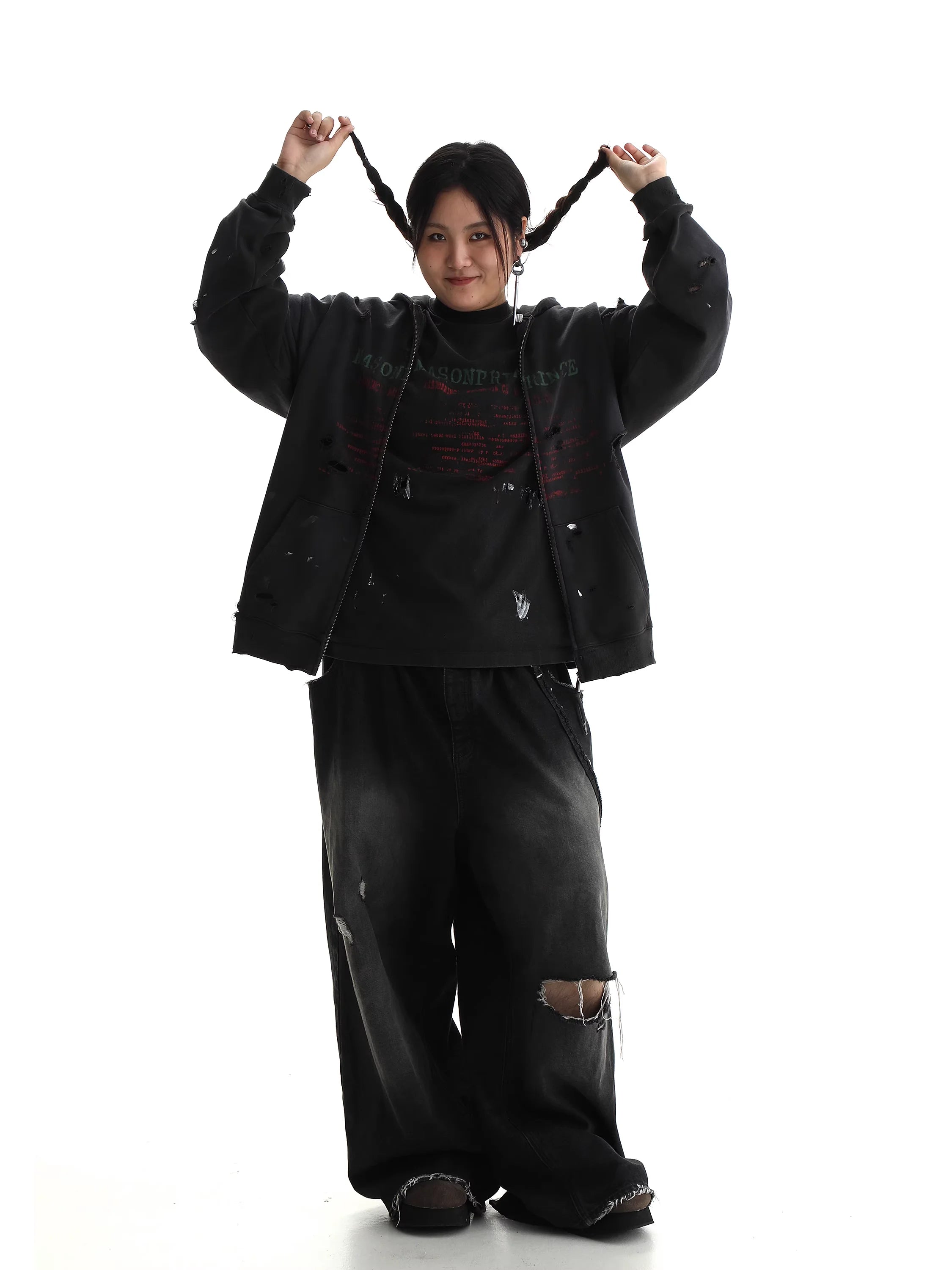 Embrace a bold streetwear vibe with this women's distressed zip-up hoodie jacket, perfect for early autumn layering. Crafted in a loose, oversized fit, this black hoodie features edgy distressing details, including holes and a faded red and green graphic on the front for a grunge-inspired look. Paired effortlessly with similarly styled pieces, this jacket adds an urban, rock-inspired edge to your wardrobe.
