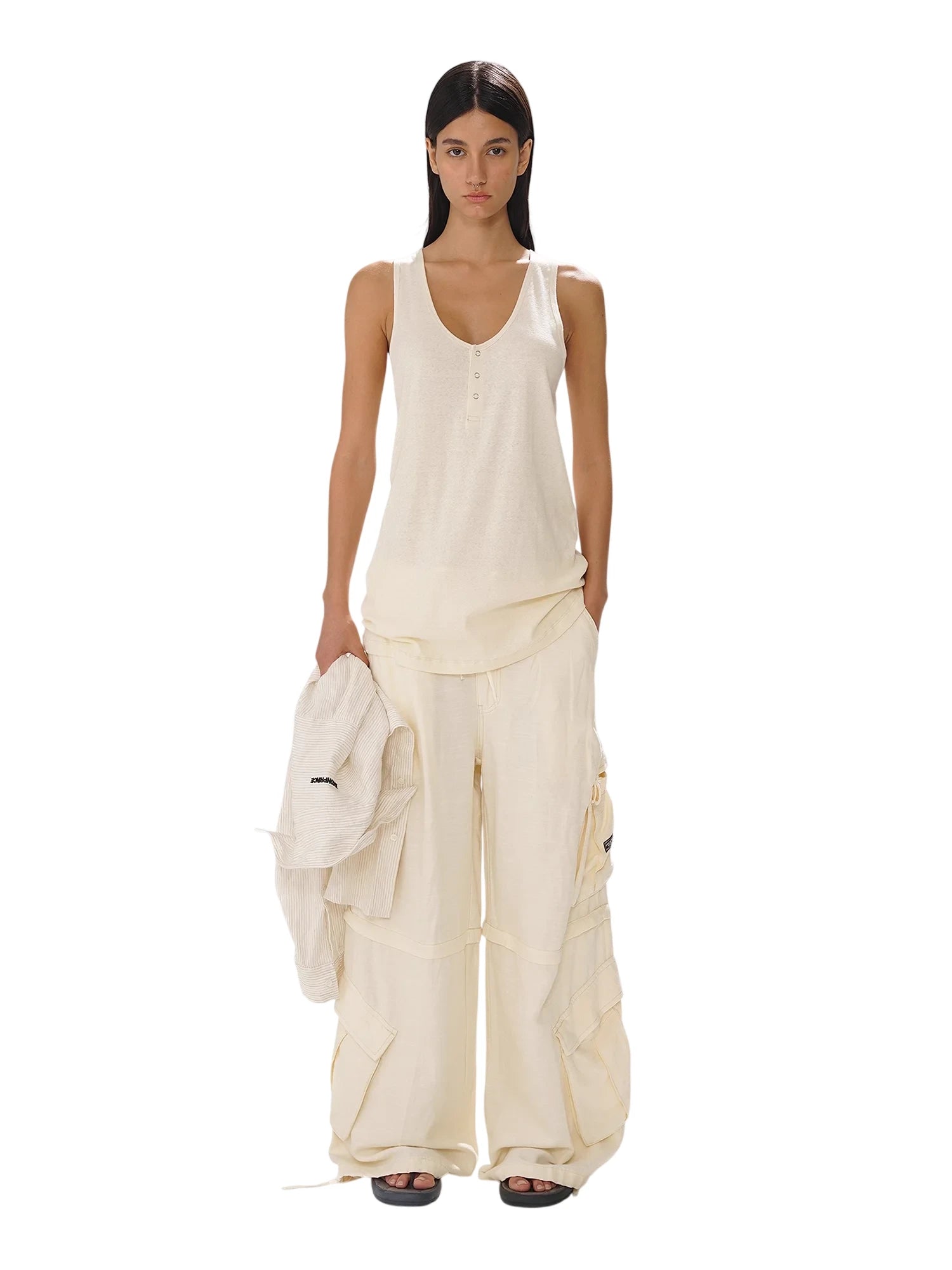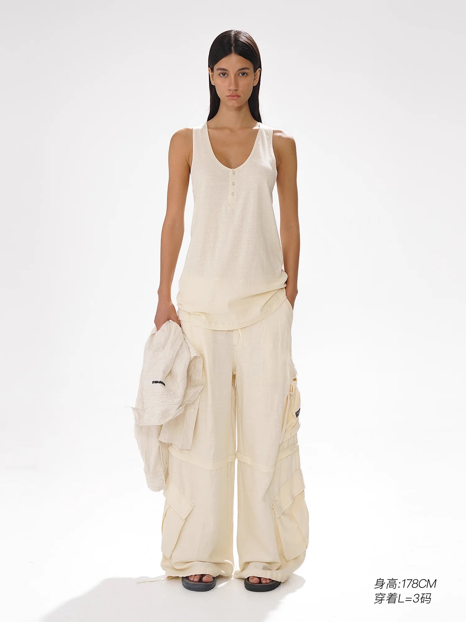 Available in neutral shades including ivory, taupe, olive green, and black, this vest combines natural hues with a relaxed silhouette, ideal for layering throughout the seasons. Its breathable, lightweight material ensures ease of wear and movement, making it a chic and functional wardrobe essential.
