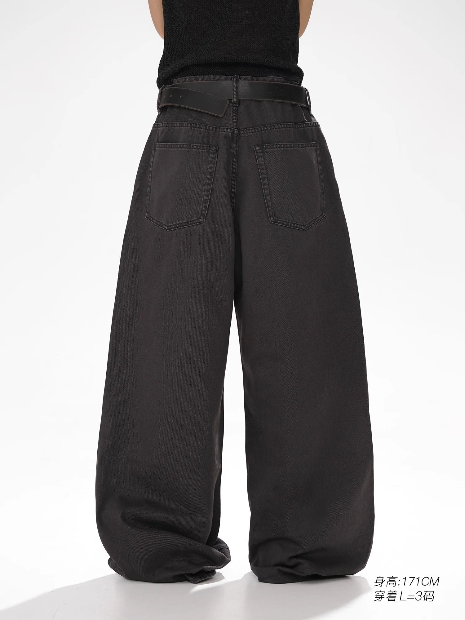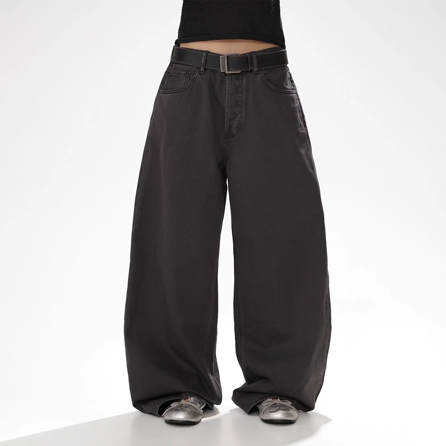 These women's grey straight-leg jeans offer a relaxed, wide-leg silhouette with a modern, eco-washed finish. Designed with a high-rise waist for a flattering fit, they feature classic five-pocket styling and a comfortable, baggy cut that drapes effortlessly over footwear. The look is completed with a coordinating black belt featuring a rectangular metal buckle, ideal for casual and streetwear-inspired outfits.
