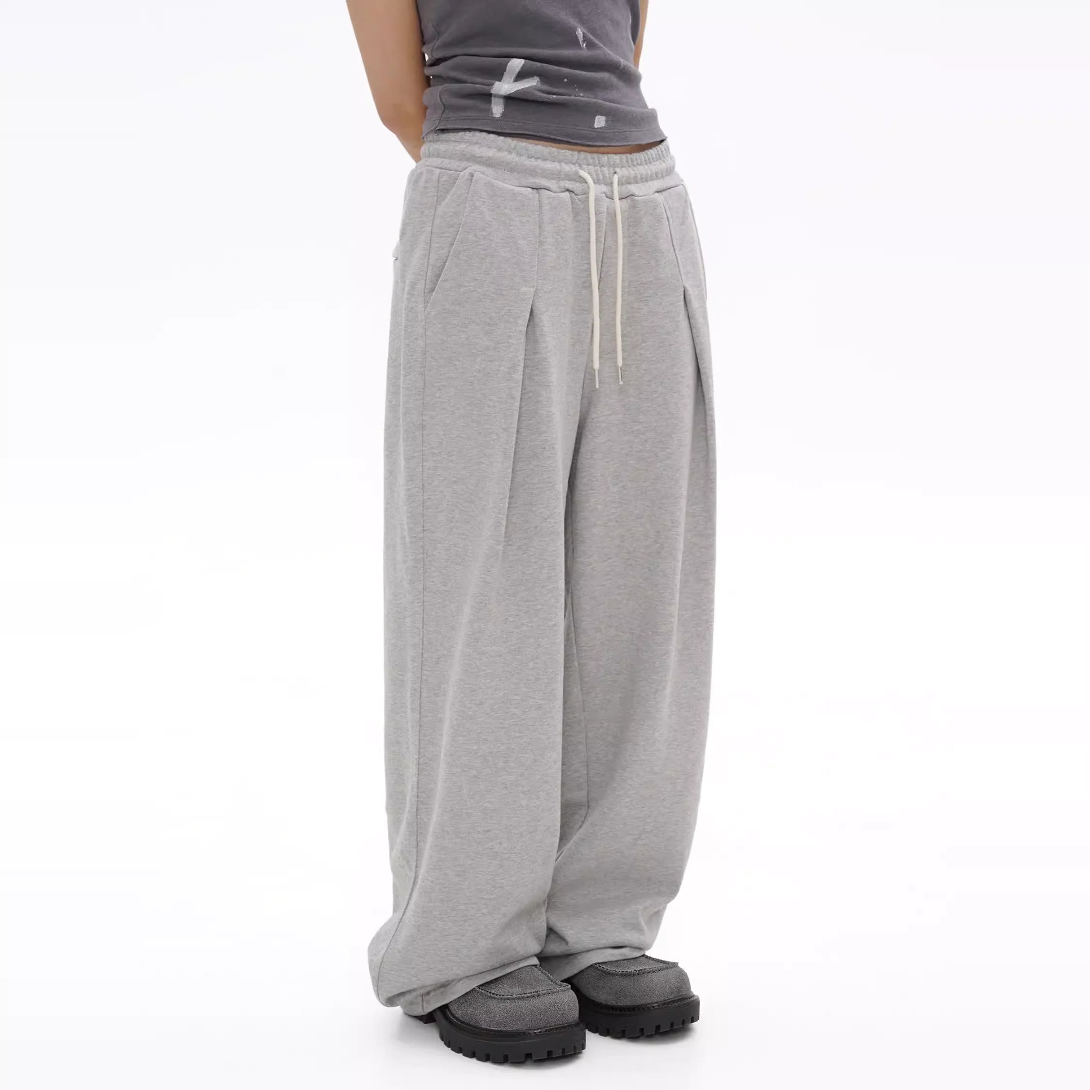 Elevate your casual wardrobe with these women's high waist knit sweatpants, perfect for autumn and winter wear. Featuring a comfortable elastic waistband with an adjustable off-white drawstring, these full-length pants offer a relaxed, oversized fit for all-day ease. The double pleated front adds a subtle touch of sophistication, while roomy side pockets provide practical storage. Crafted in a soft gray knit fabric, the wide-leg silhouette drapes effortlessly for a laid-back yet polished look.