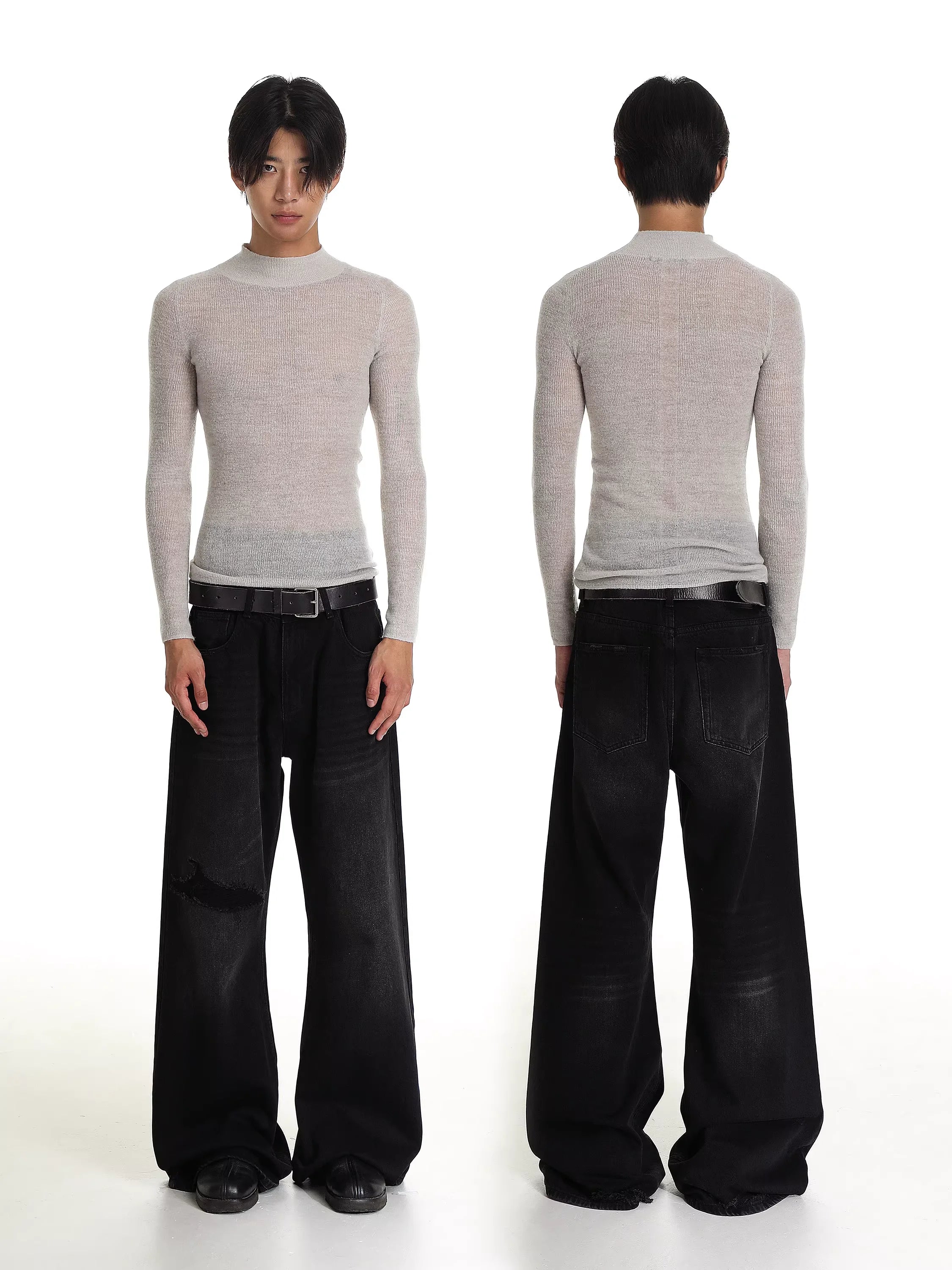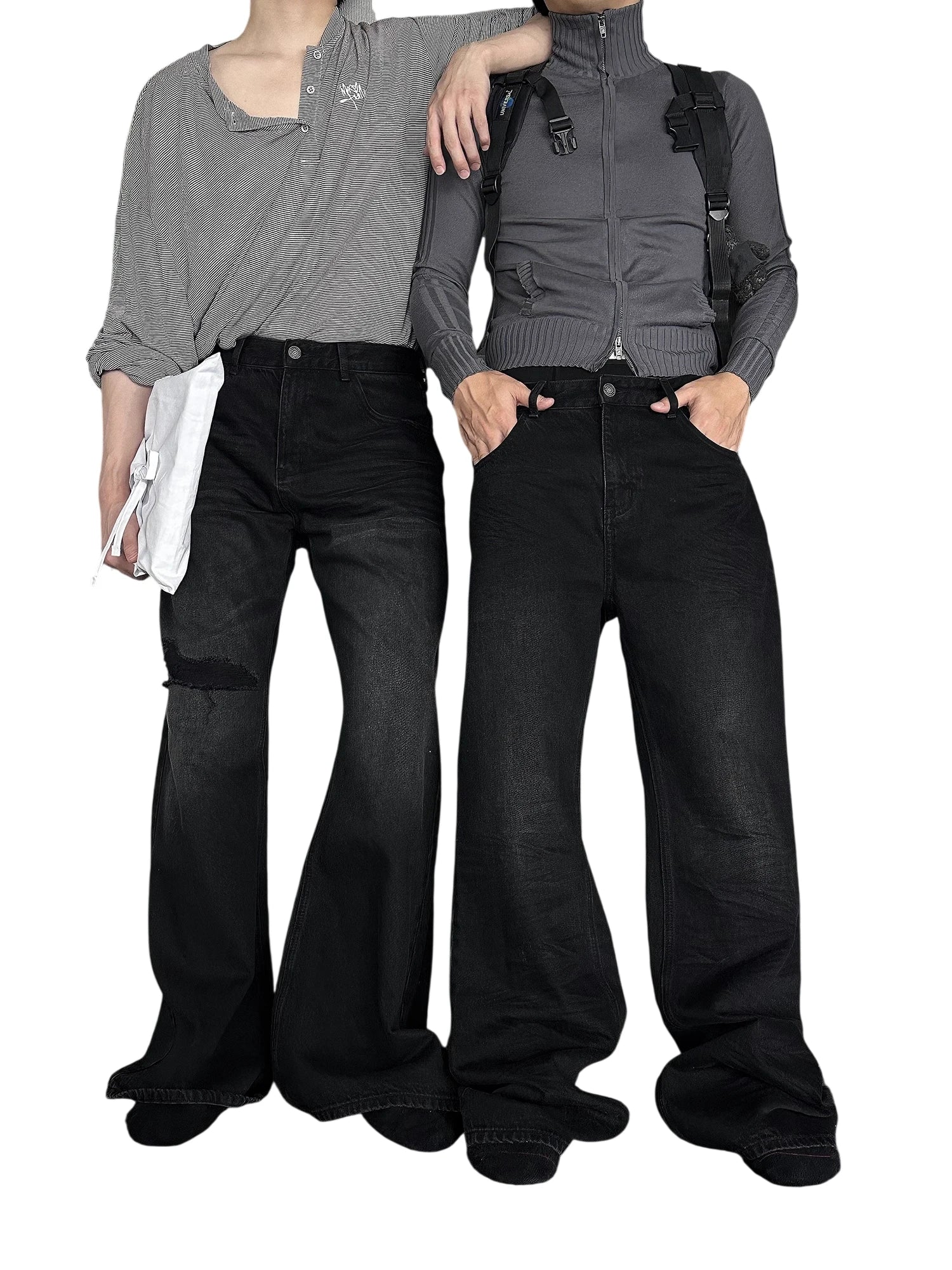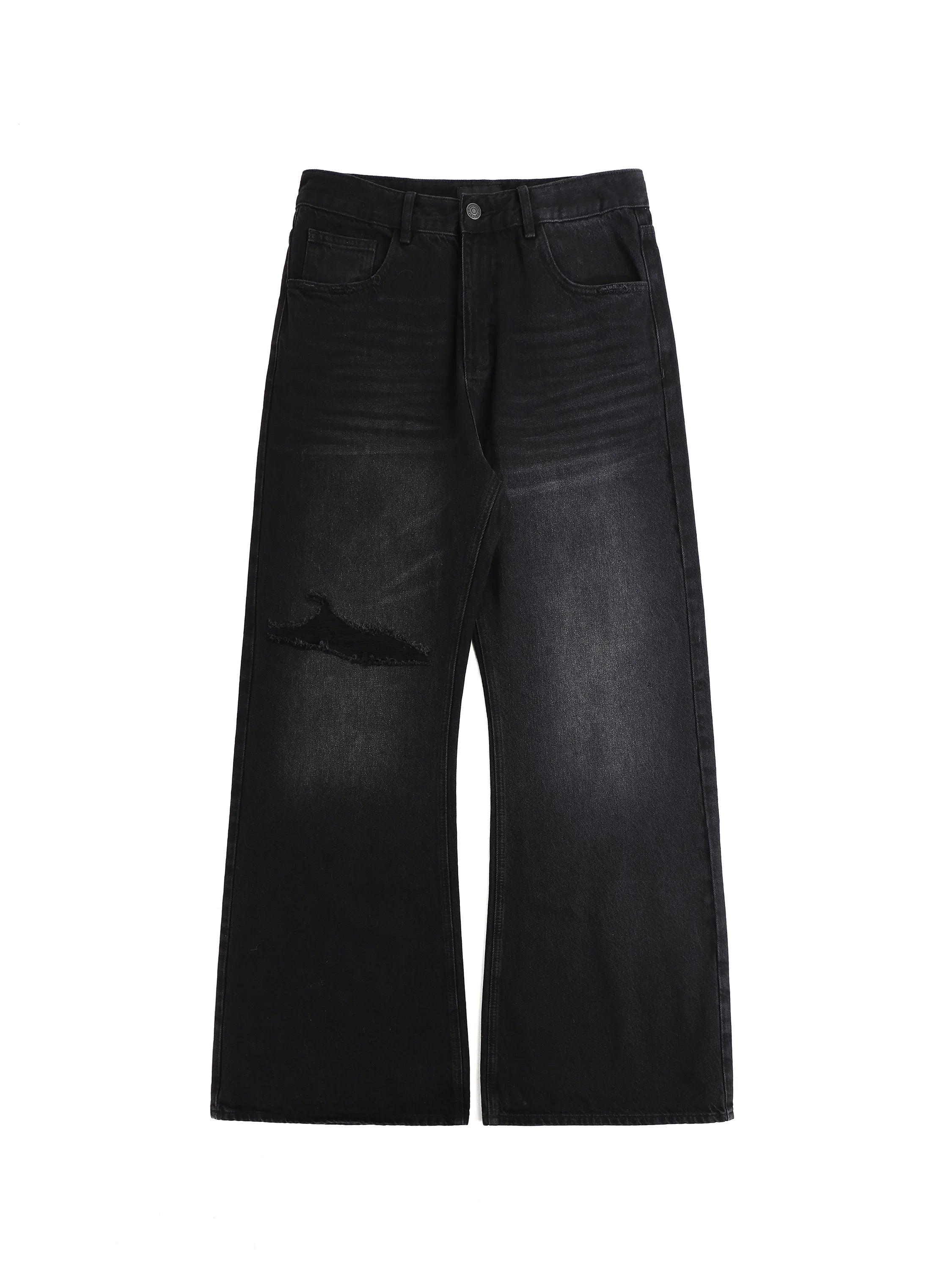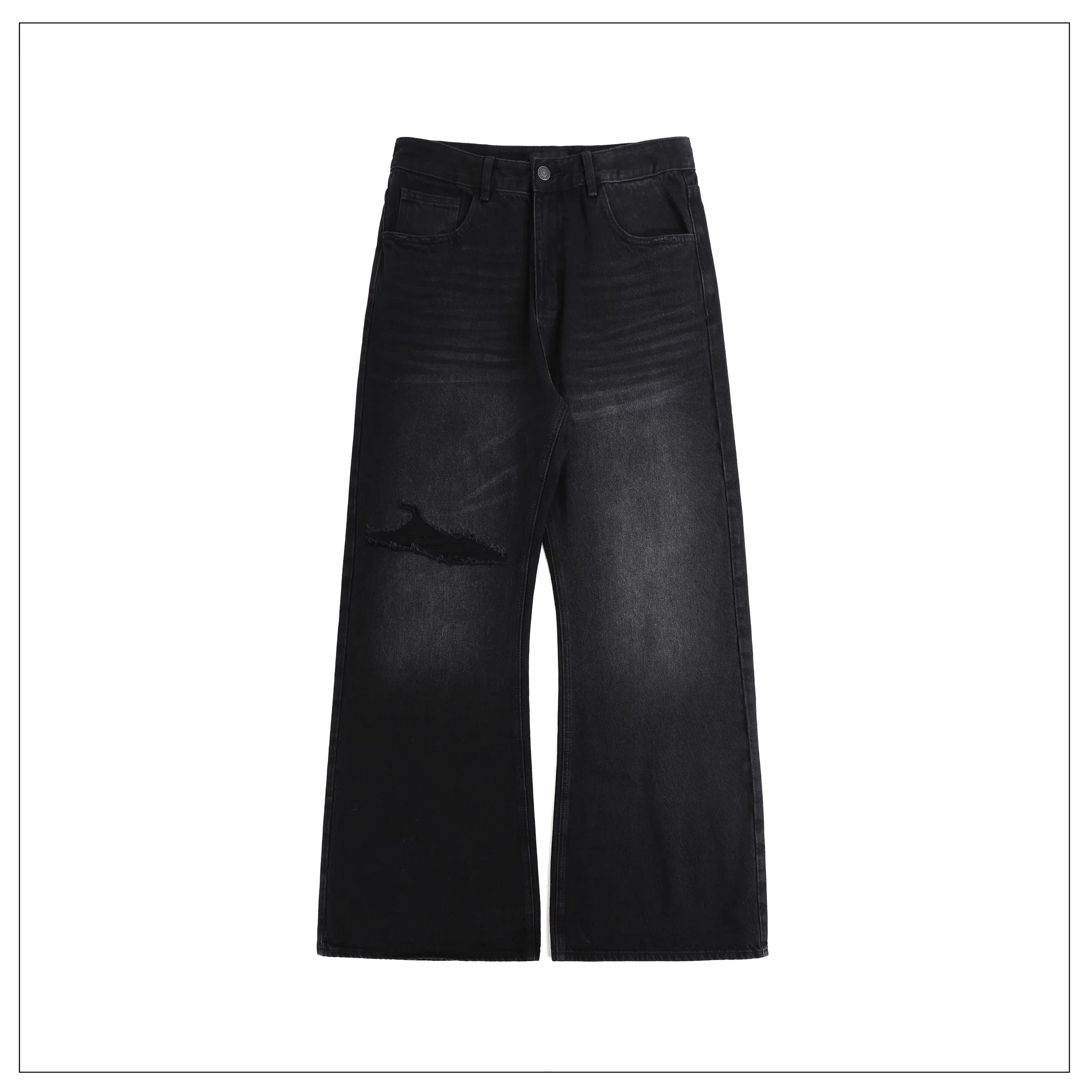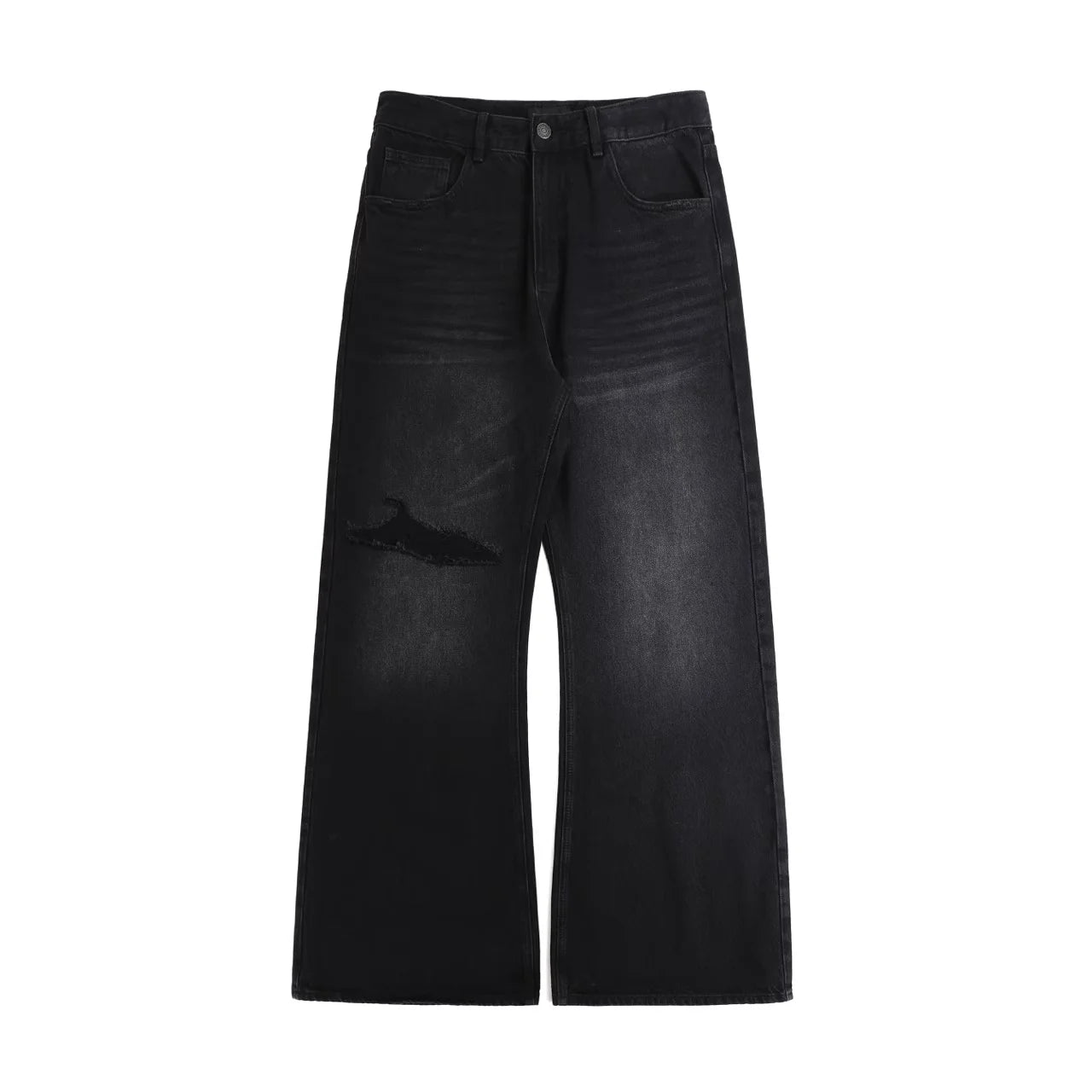 Elevate your casual wardrobe with these women's high waist flared jeans. Designed with a wide-leg silhouette and relaxed fit, these jeans offer both comfort and contemporary style. The flared hem adds a retro-inspired touch, while the faux distressed detailing on the left thigh and subtle fading around the knees enhances the vintage look. Complete with a classic five-pocket design, zip fly with button closure, and belt loops, they make a stylish and versatile addition to any outfit.