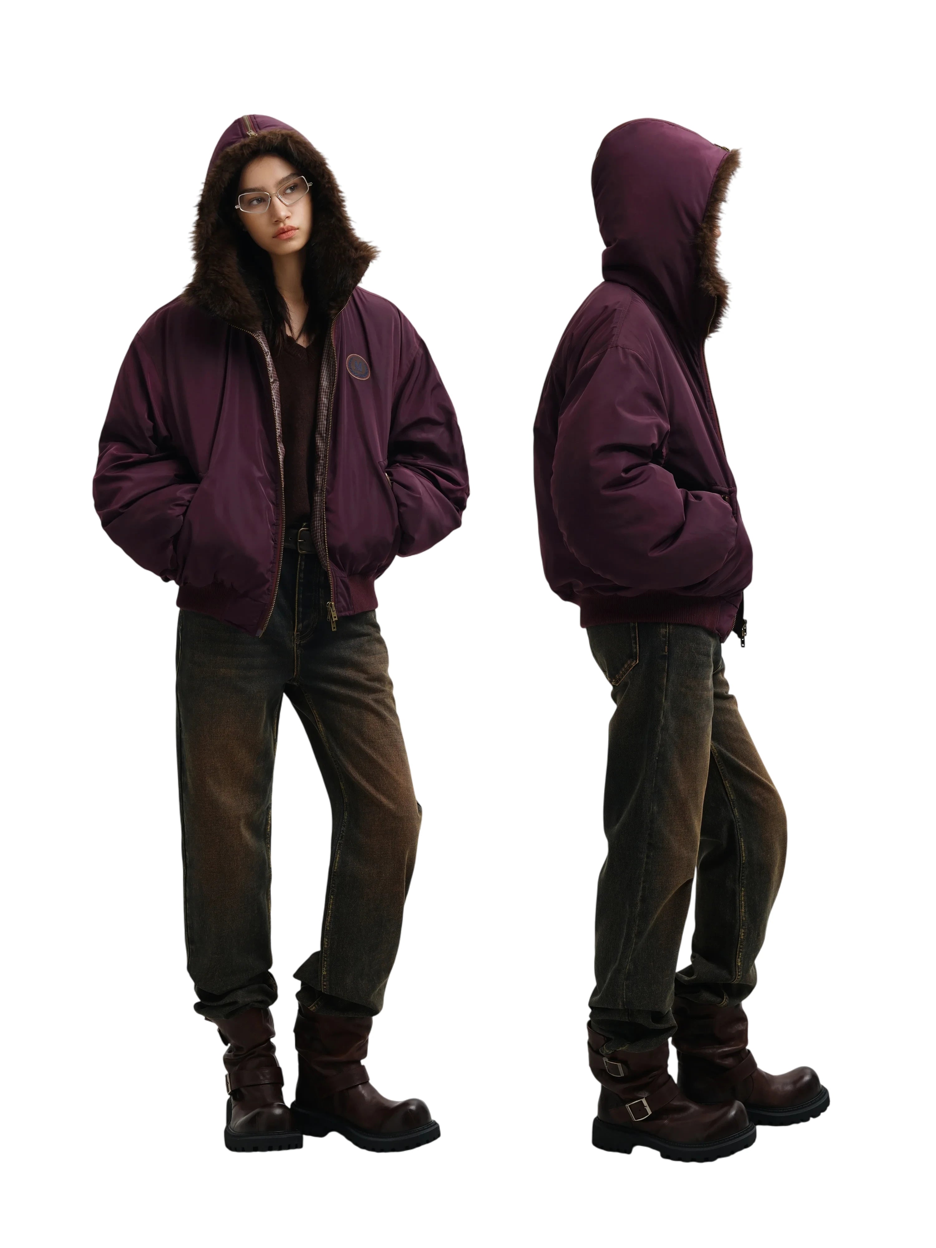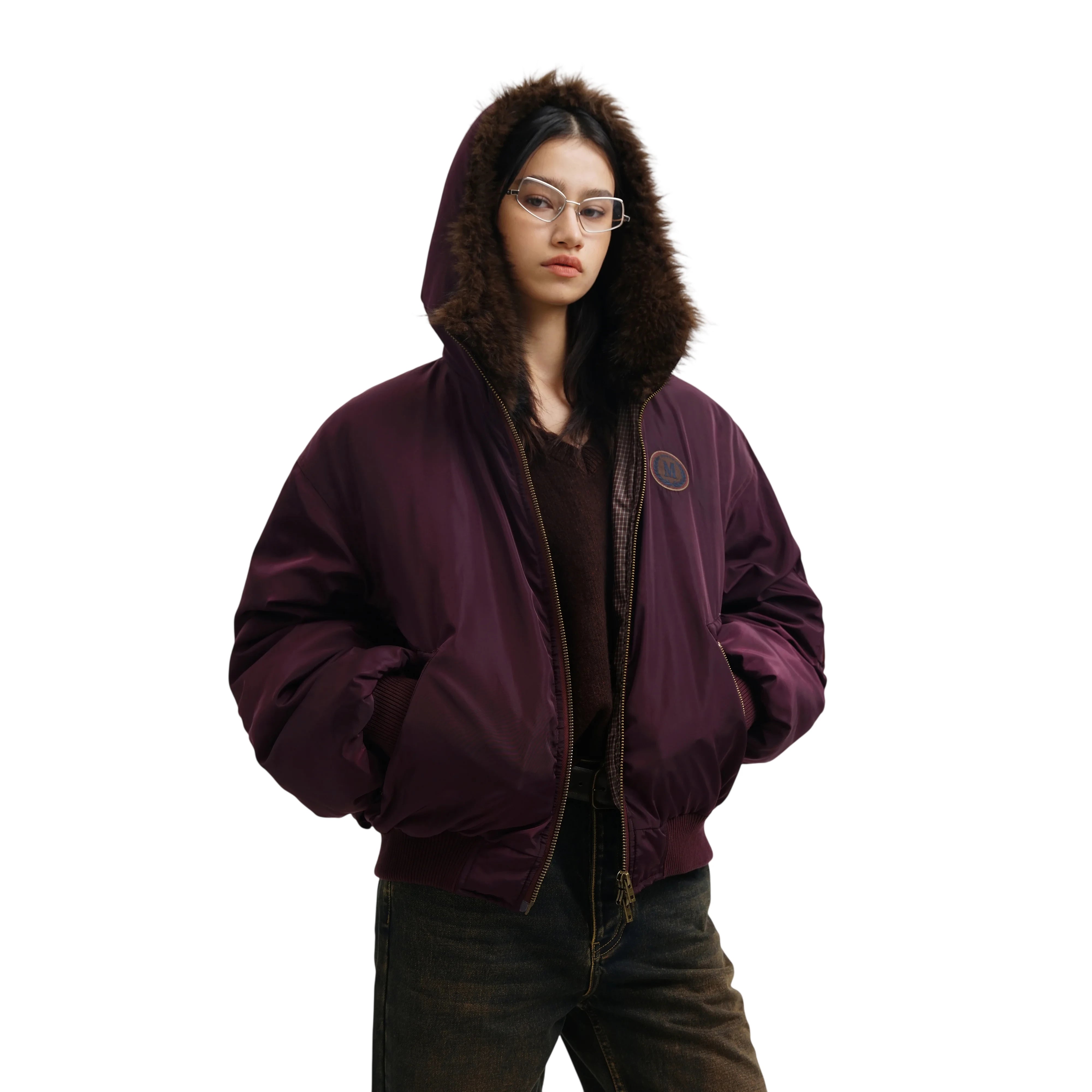 Stay warm and stylish with this women's hooded plaid puffer jacket. Designed in a rich burgundy color, it features a cozy faux fur trim around the hood for added protection against the cold. The jacket offers a relaxed, slightly oversized fit with a thick insulated structure, ribbed cuffs and hem, and a secure zipper closure.