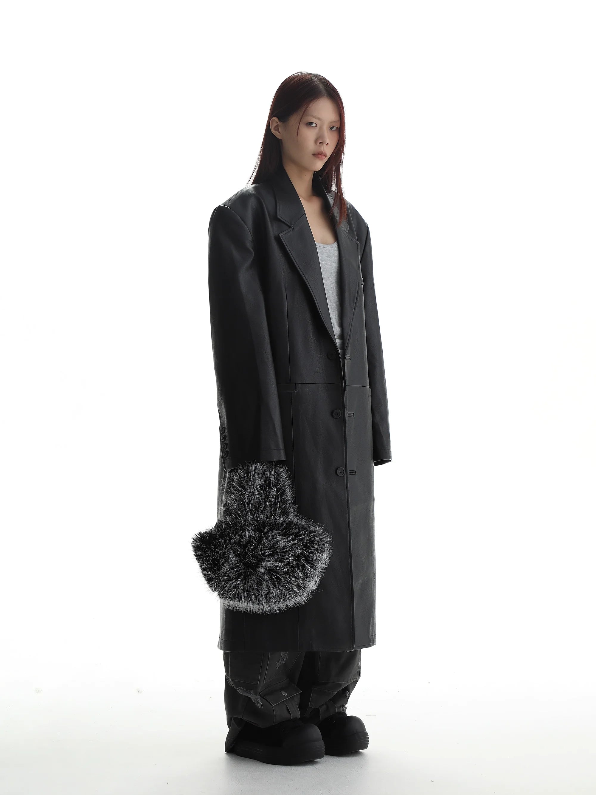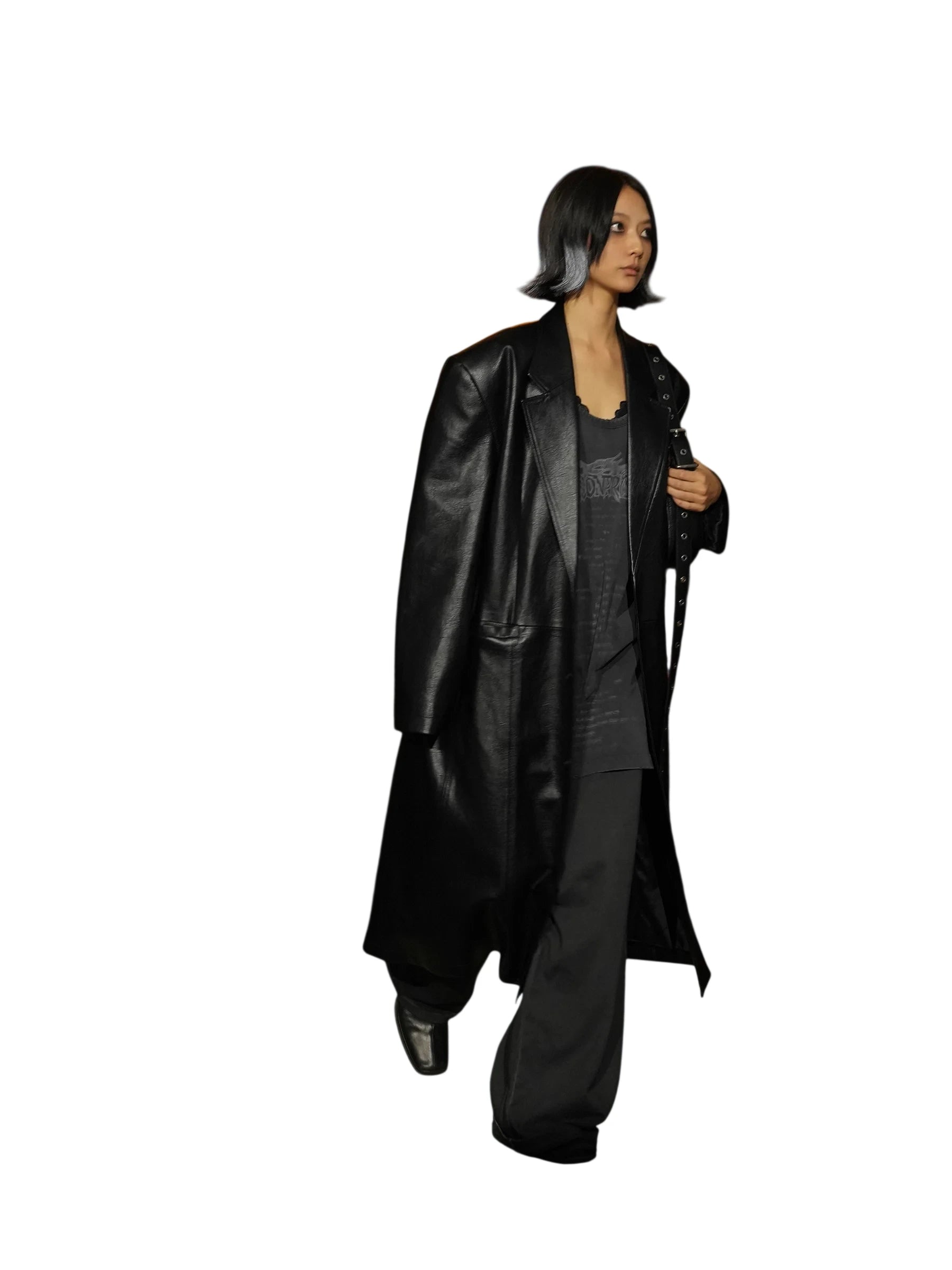 Elevate your wardrobe with this women's long black faux leather trench coat, designed with a modern oversized silhouette and front button closure. Ideal for layering, this casual yet edgy piece creates a striking look when styled with dark-toned separates. The coat's structured design adds sophistication to any outfit, while the rich black faux leather finish offers a bold, urban aesthetic.