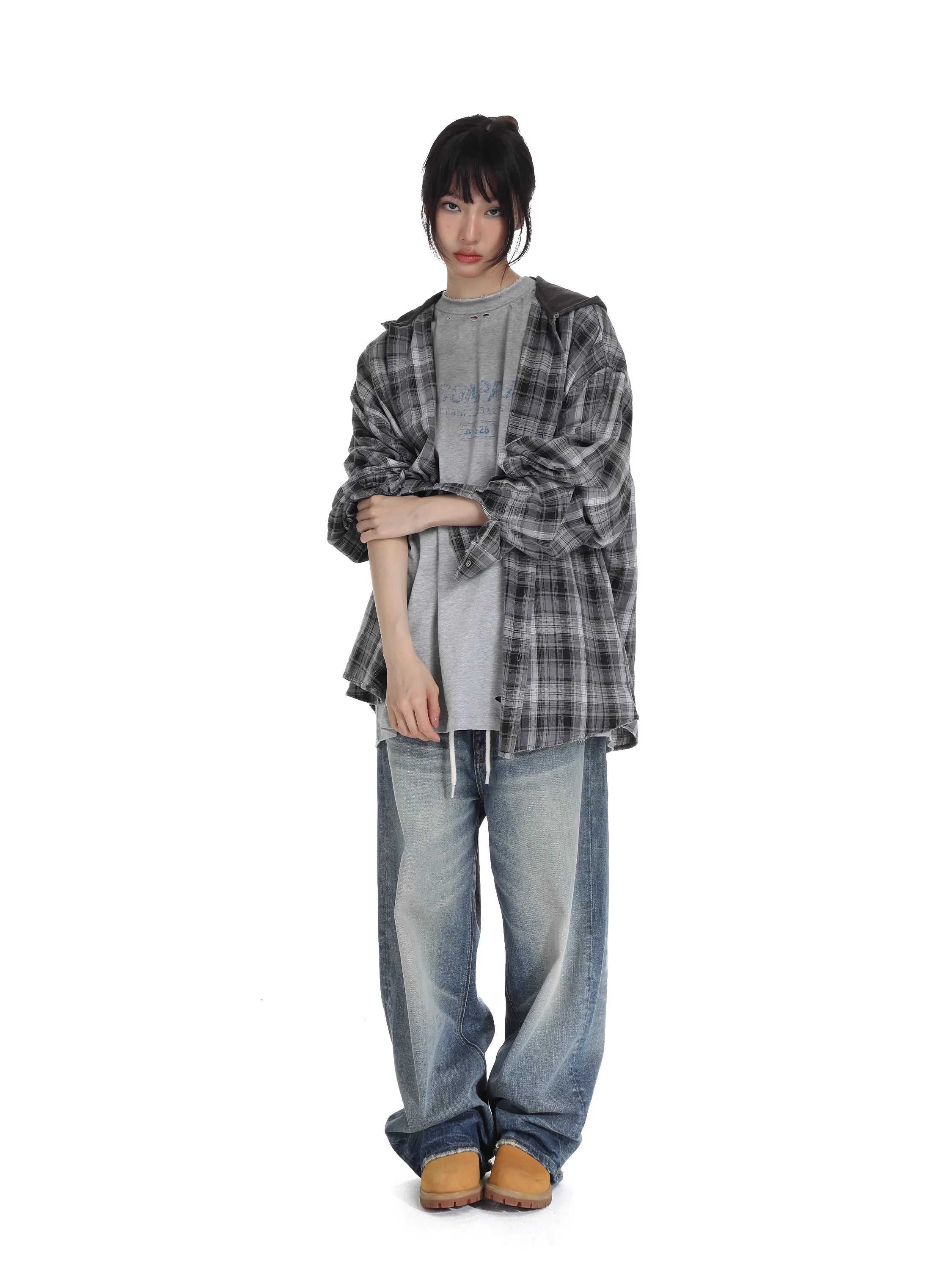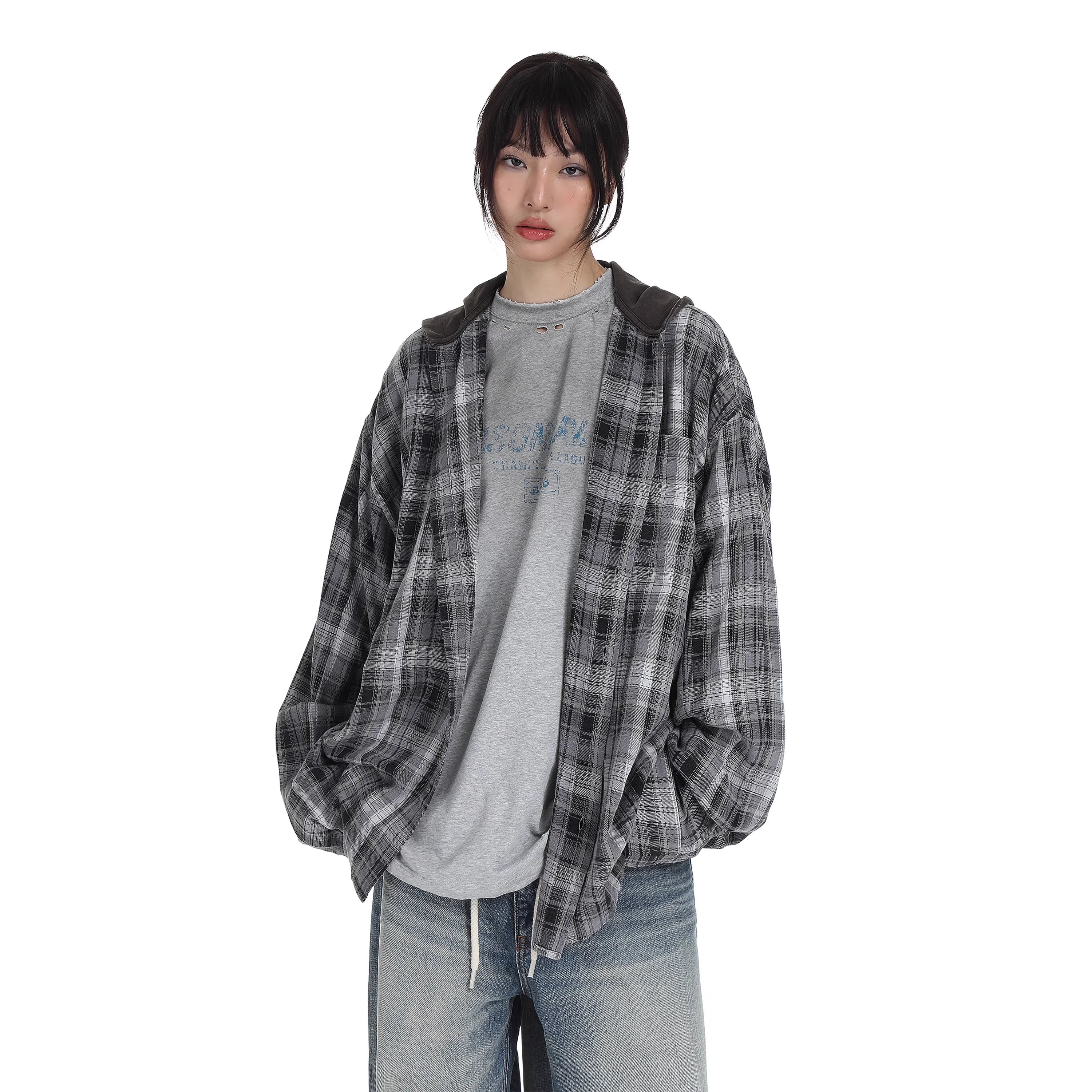 Stay cool and stylish with this women's oversized plaid hooded shirt, perfect for casual summer layering. Featuring a washed, distressed look and a lightweight feel, this long sleeve shirt offers both comfort and built-in sun protection. The relaxed fit and neutral black and grey tones make it easy to pair with your favorite streetwear staples.