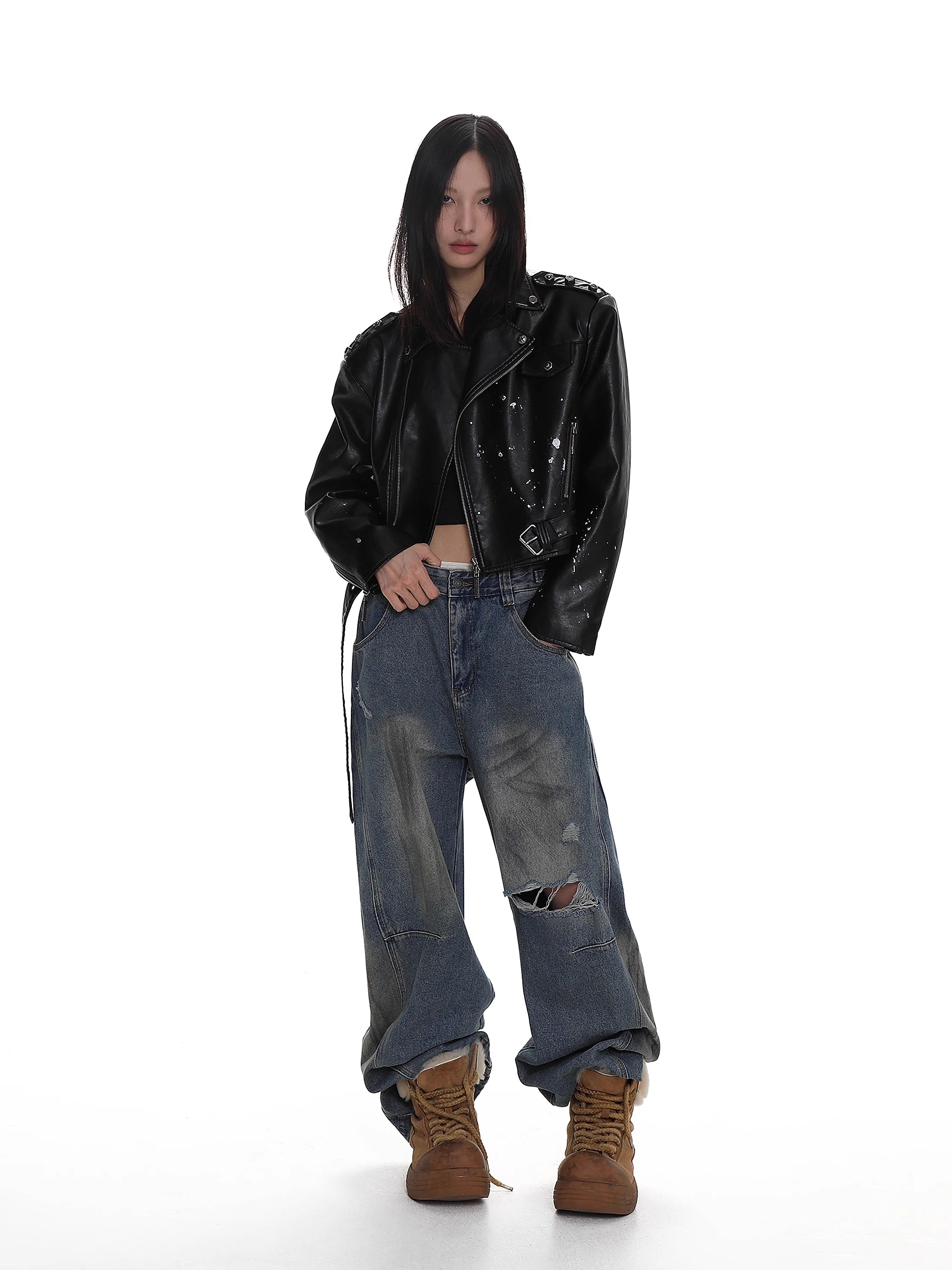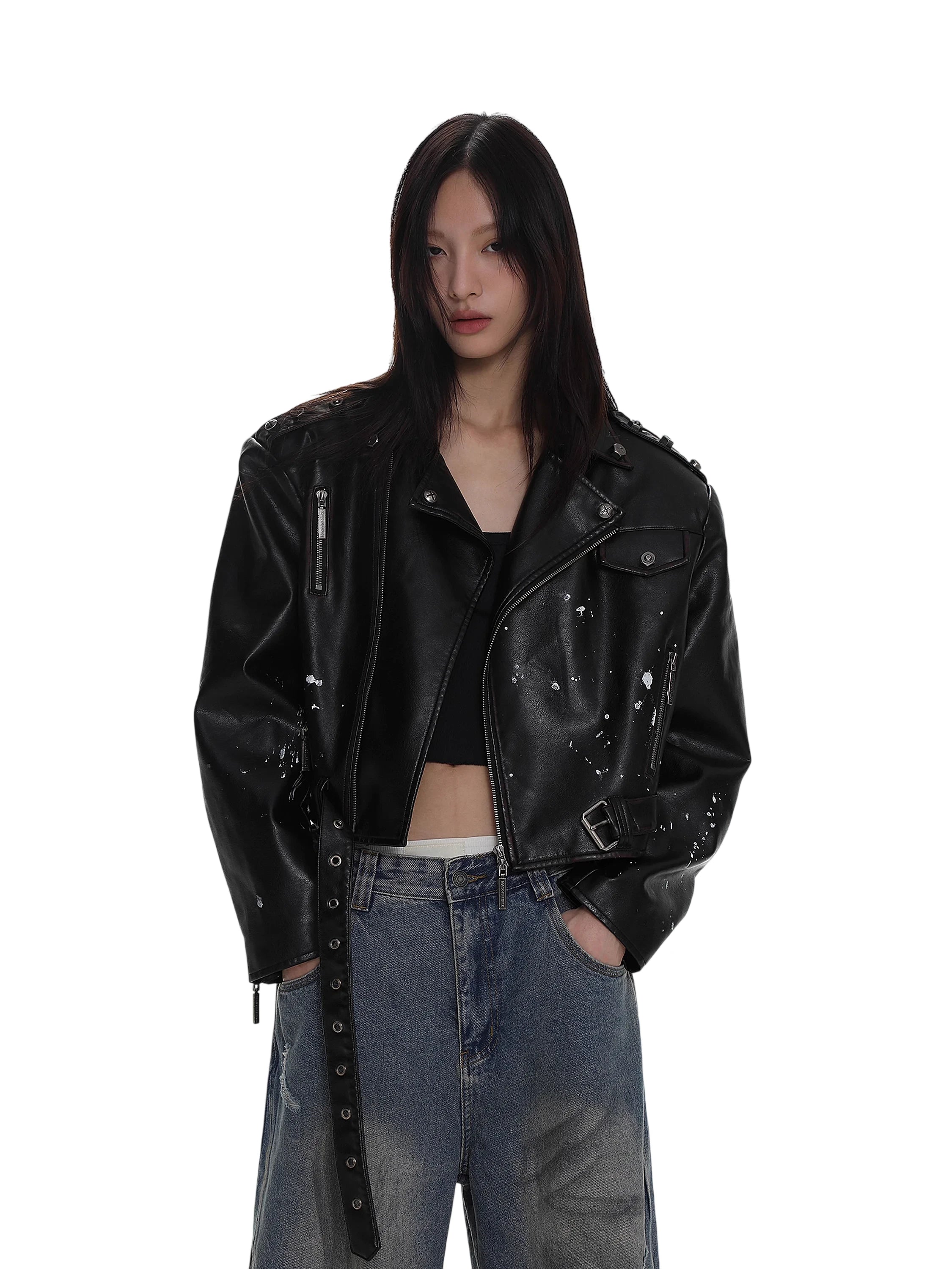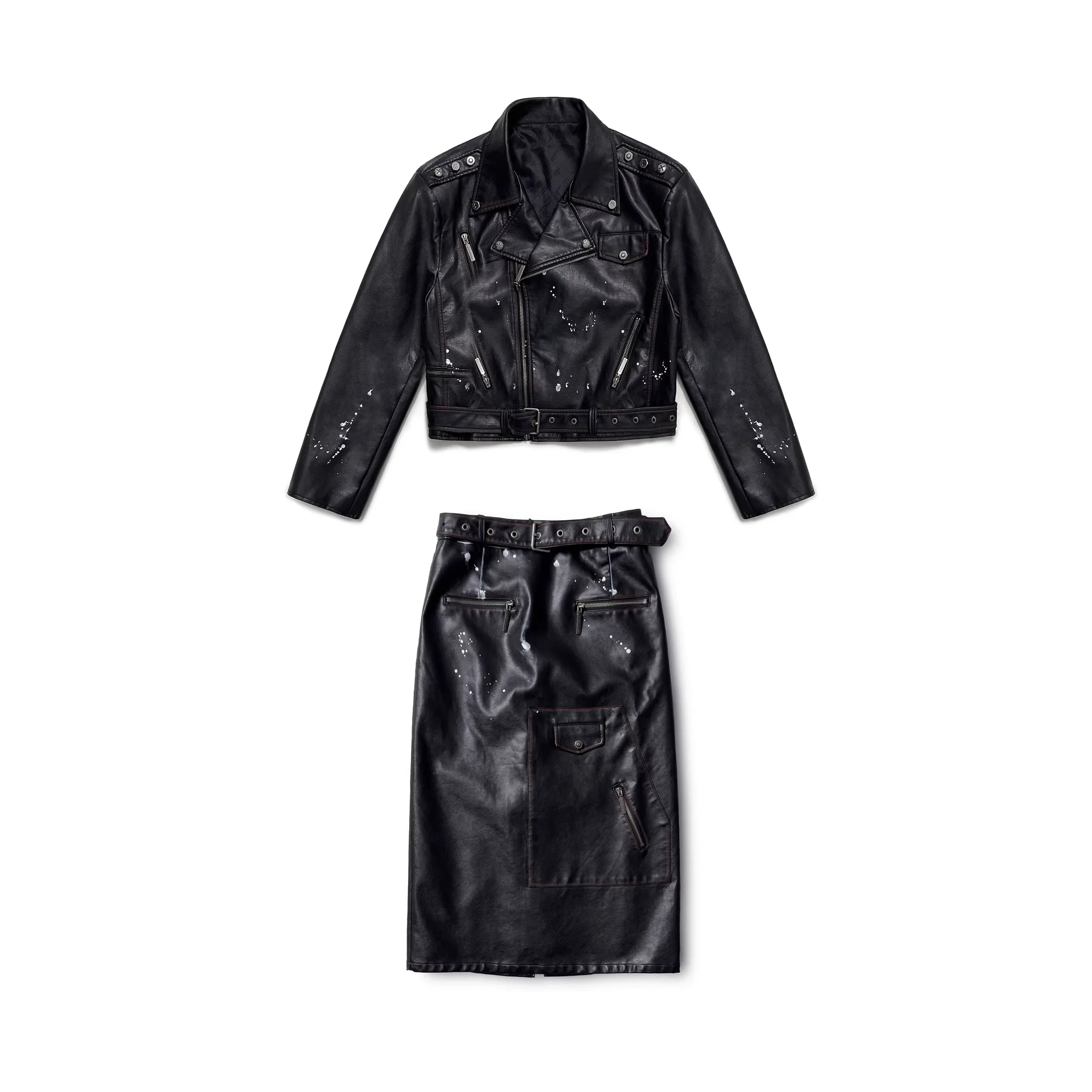 The biker-style jacket is designed with asymmetrical zip closure, metallic snap buttons, belted hem, and multiple zippered pockets. Subtle distressed white splatter effects add a vintage, worn-in look. Paired with a coordinating skirt boasting a belted waist, front zip, and flap compartments, the set delivers an effortlessly cool aesthetic perfect for fashion-forward wardrobes.
