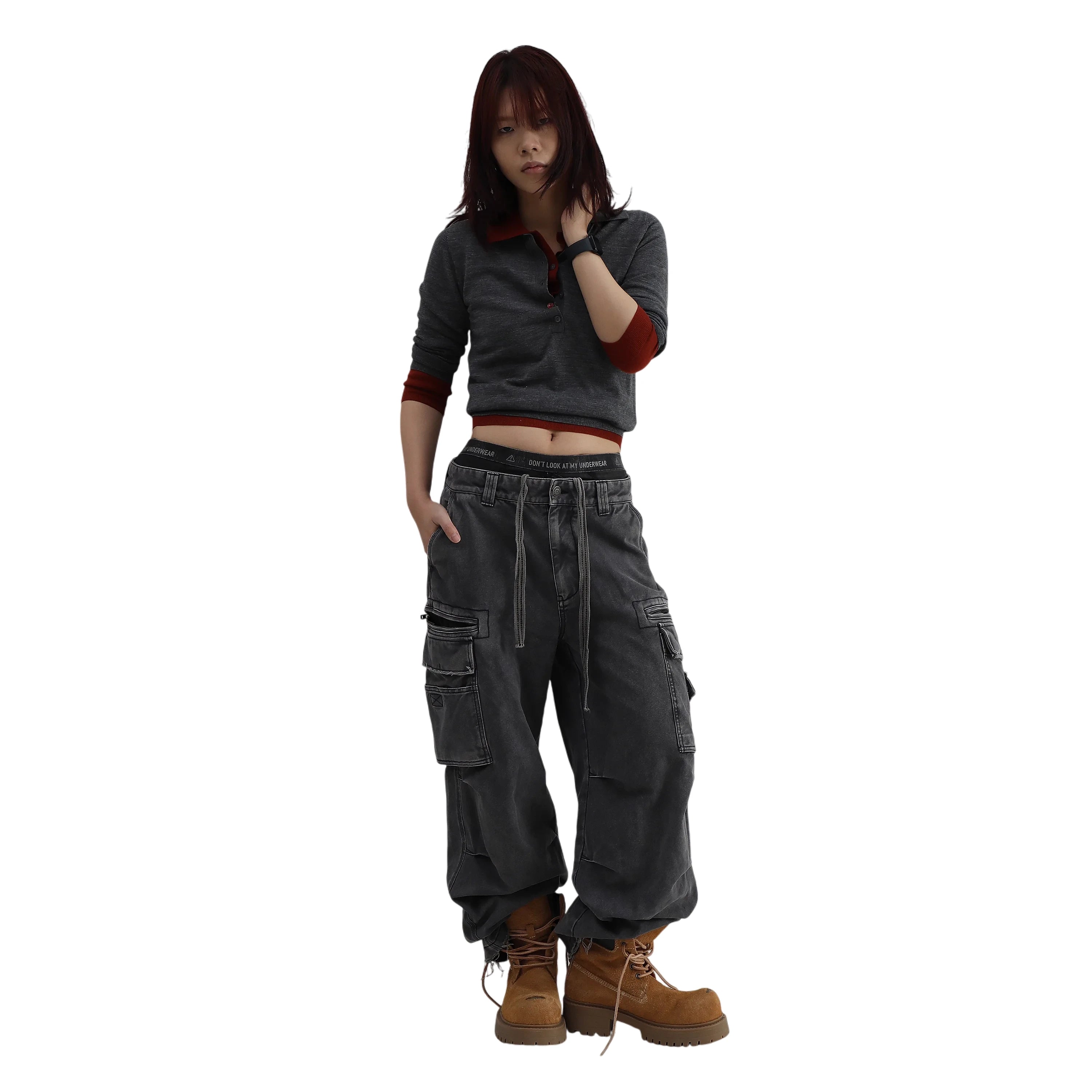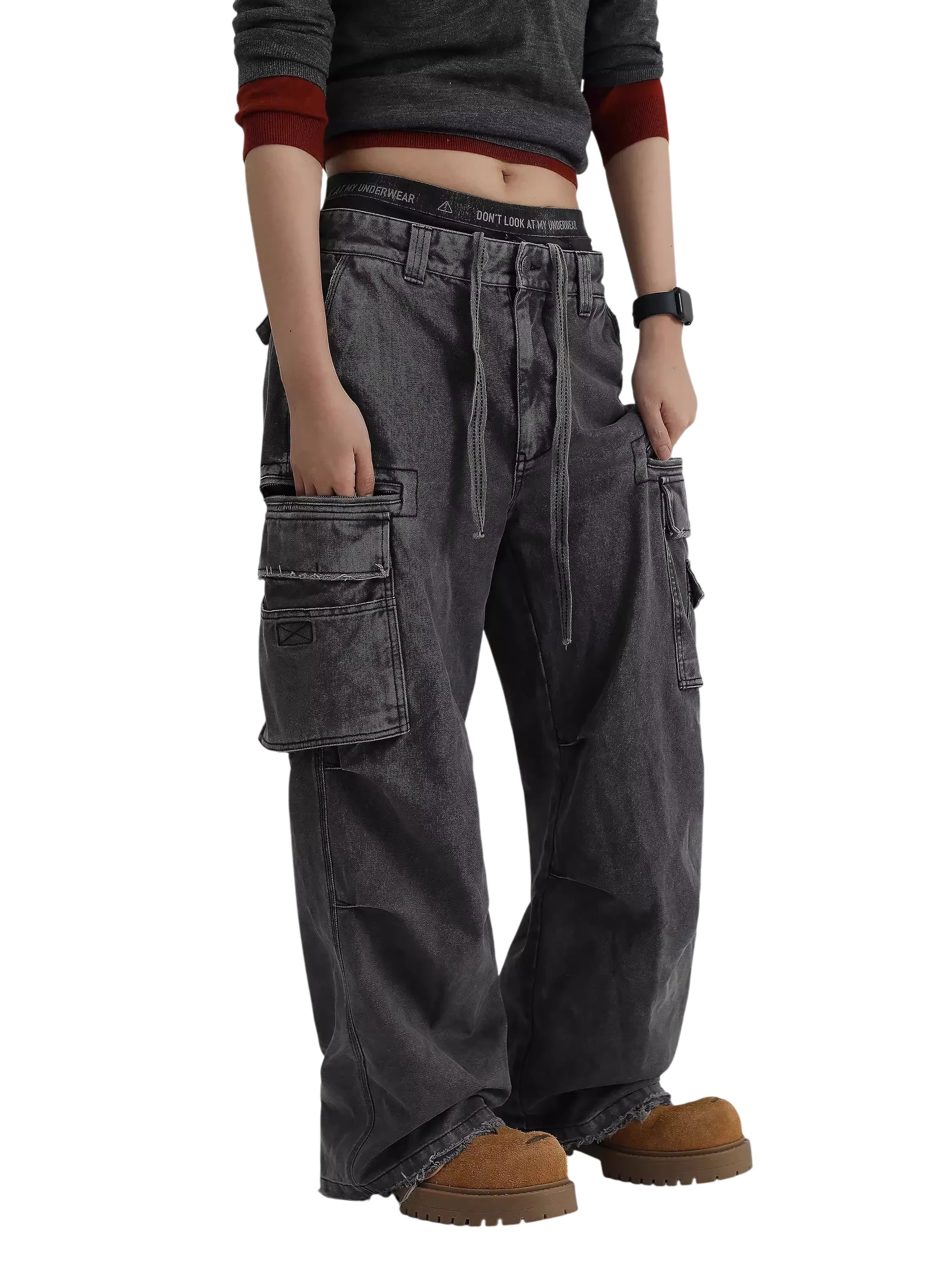 Multiple large cargo pockets and prominent stitching details offer both functionality and style. The elastic drawstring waistband ensures all-day comfort and secure fit. Whether paired with boots or sneakers, these cargo pants make a bold fashion statement.