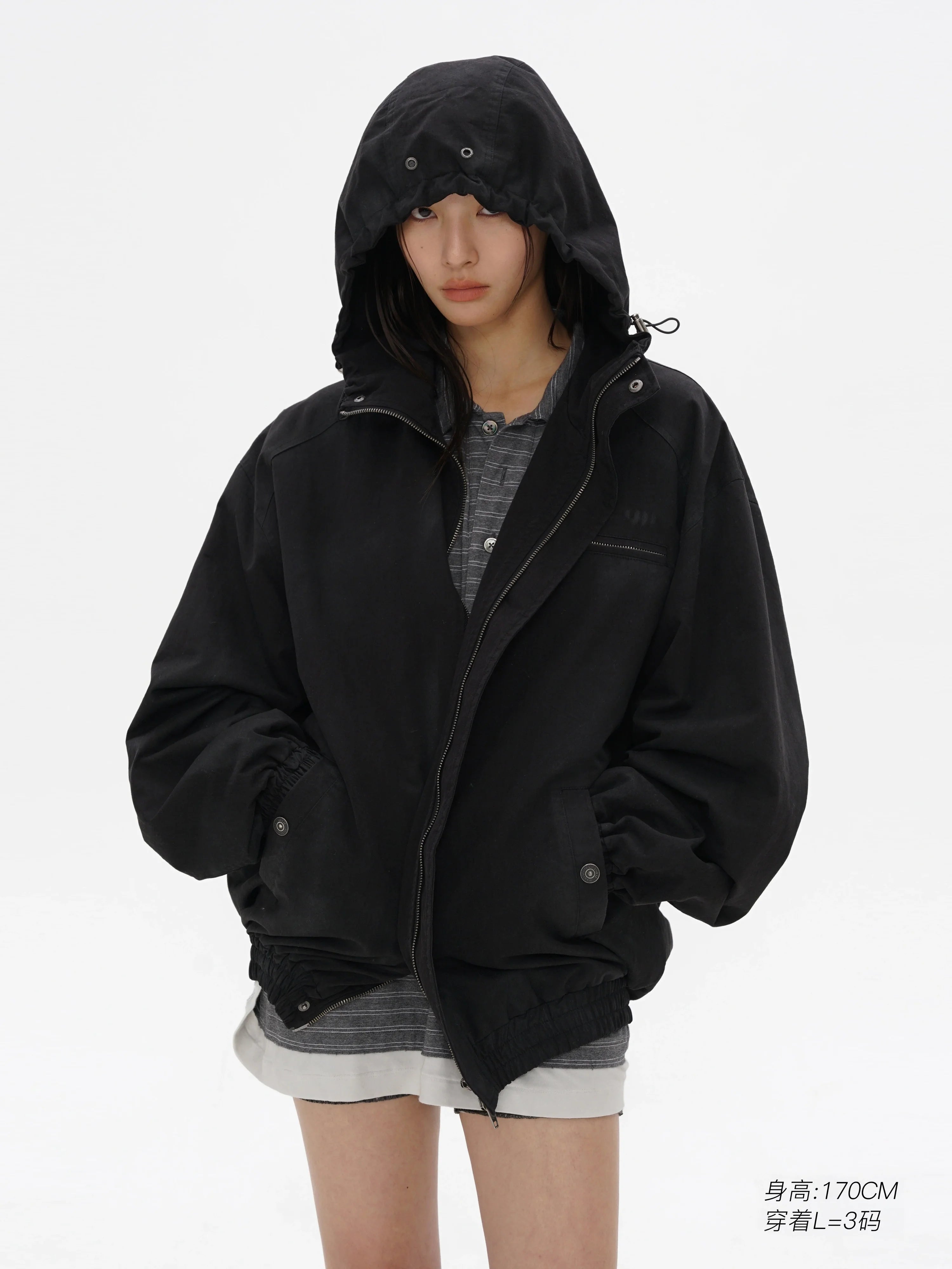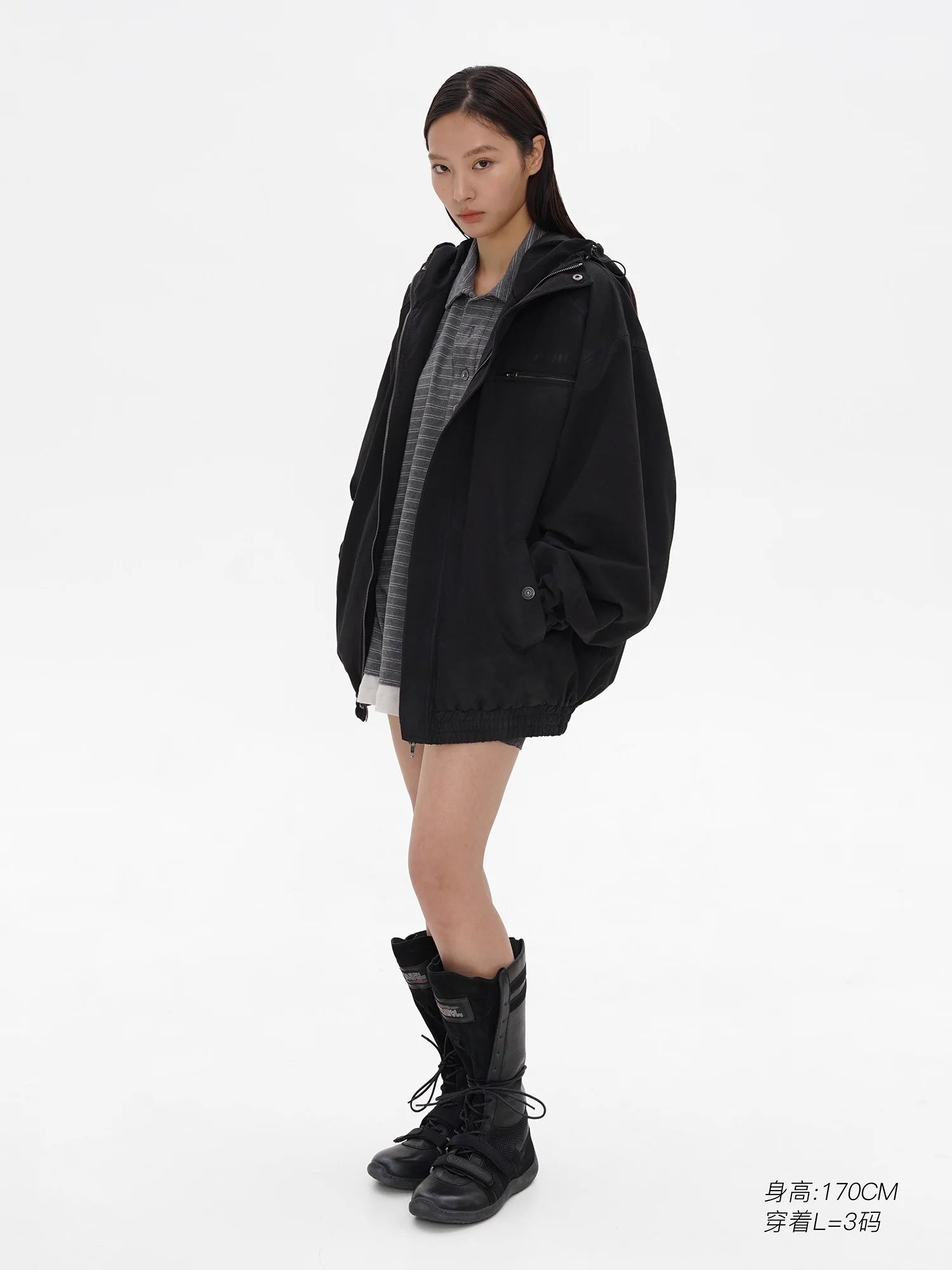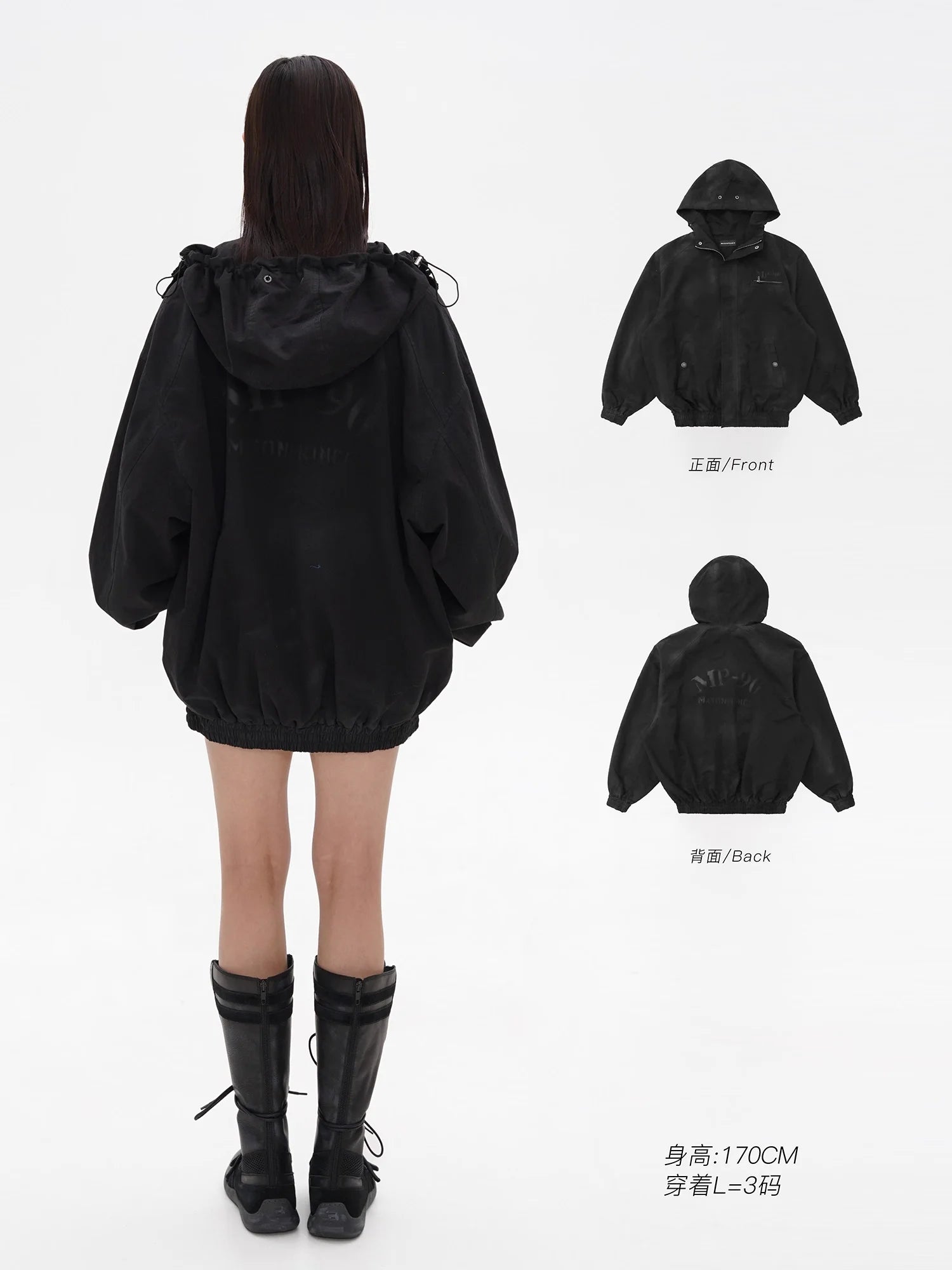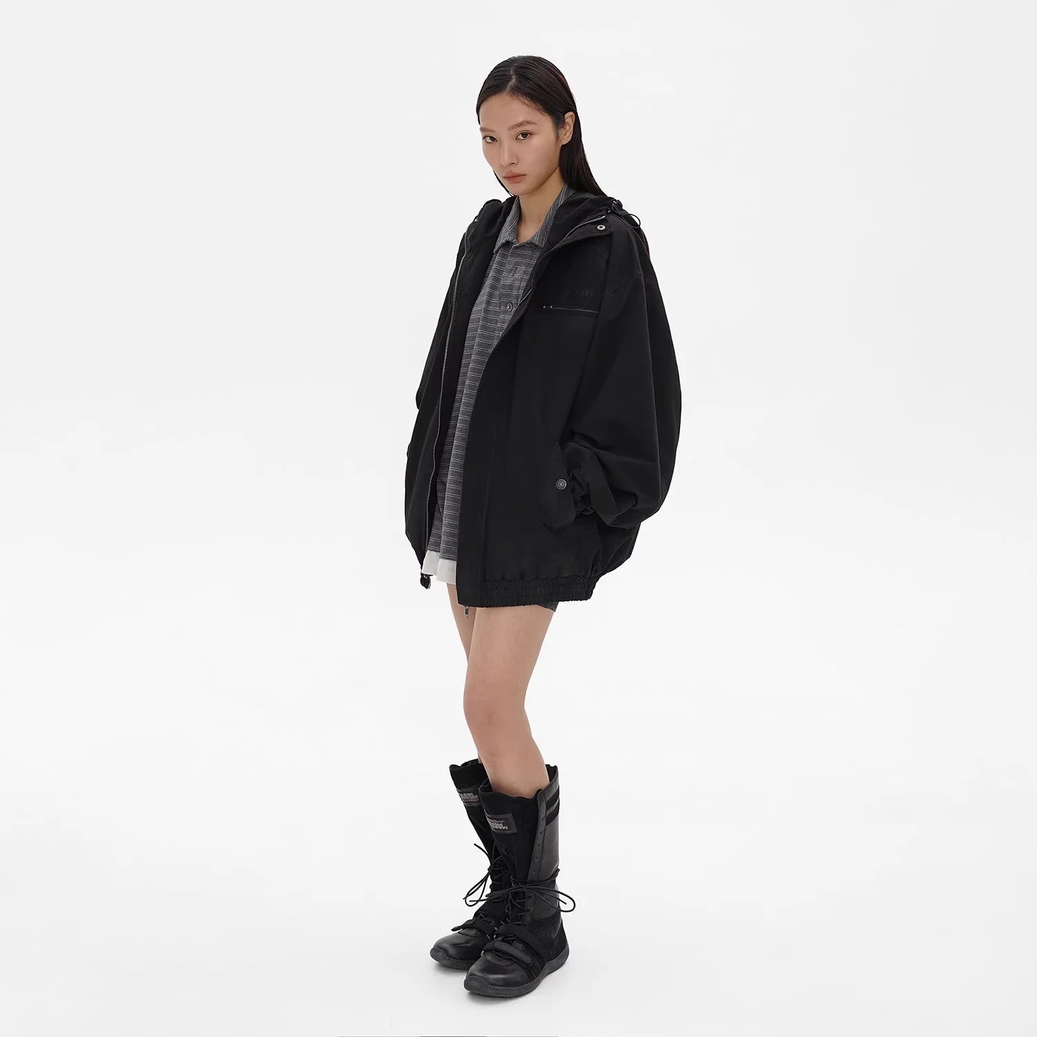 Elevate your streetwear look with this oversized black military-style jacket designed for both style and utility. Made for women, it features a high neckline with an adjustable hood, buttoned cuffs, and a zip front closure for added wind protection. A visible chest pocket enhances its functional design, while the overall distressed finish and relaxed silhouette lend an edgy, urban appeal. Perfect for layering over casual outfits, this jacket pairs effortlessly with boots and plaid shirts for a bold, modern ensemble.