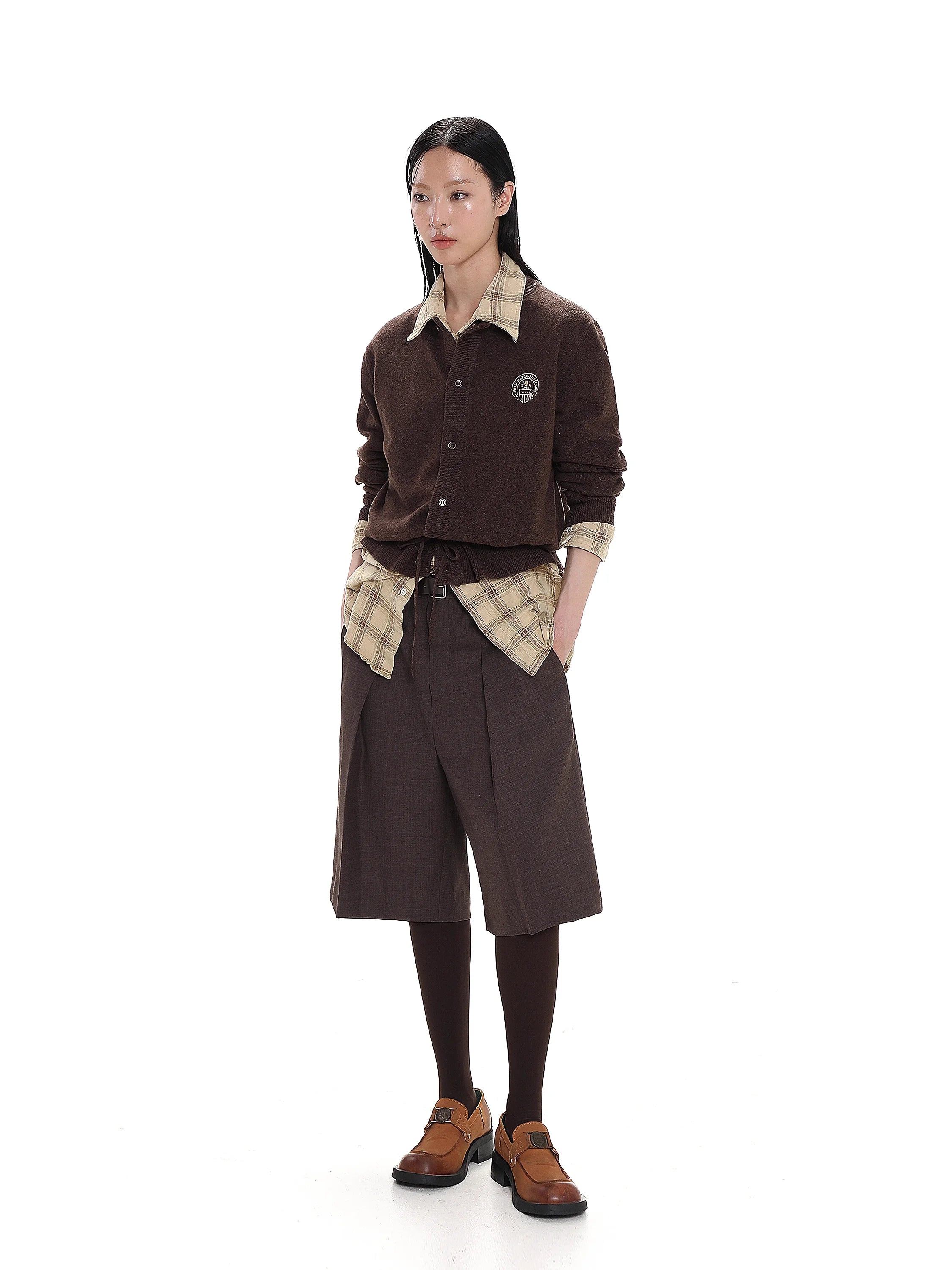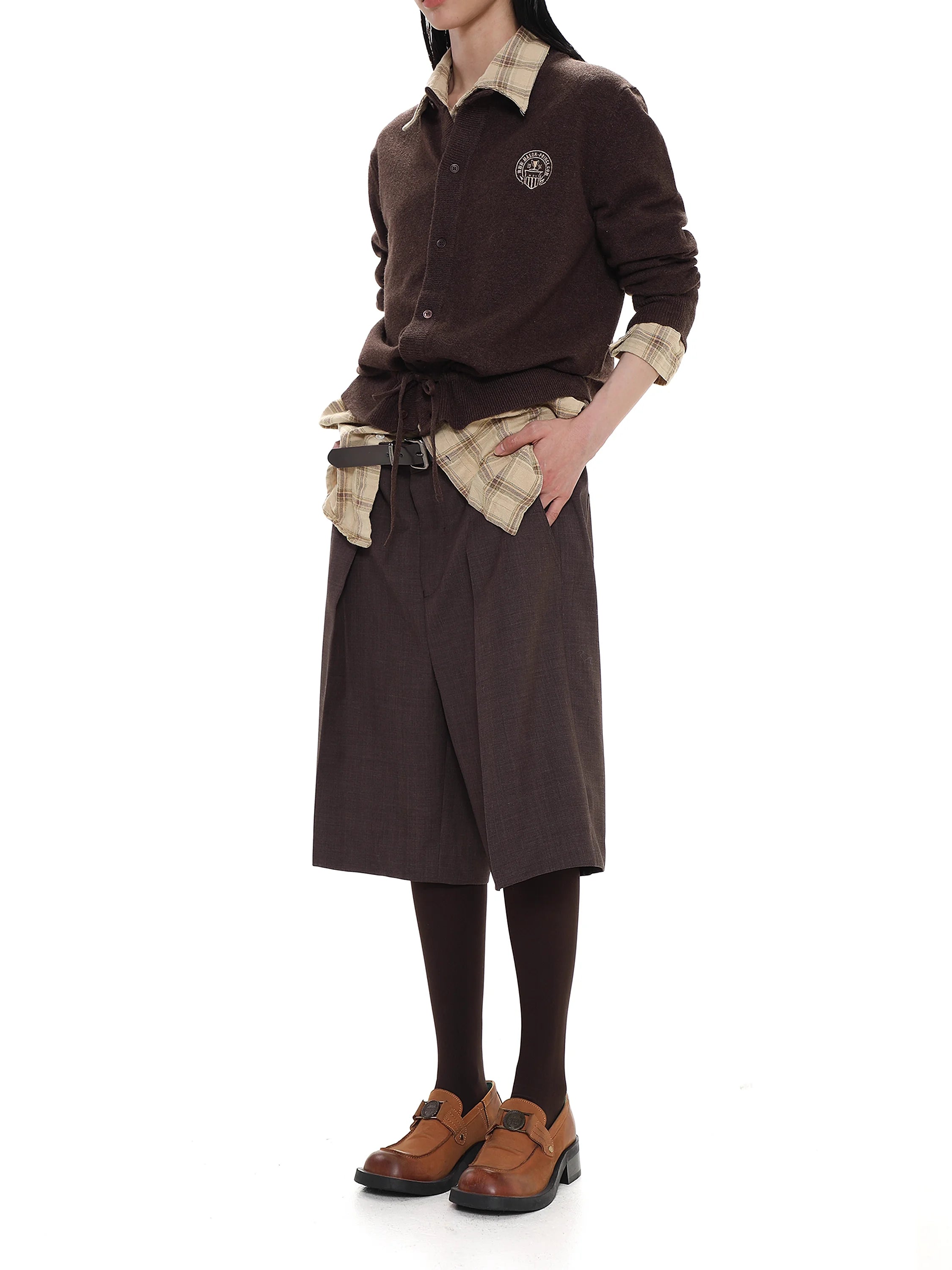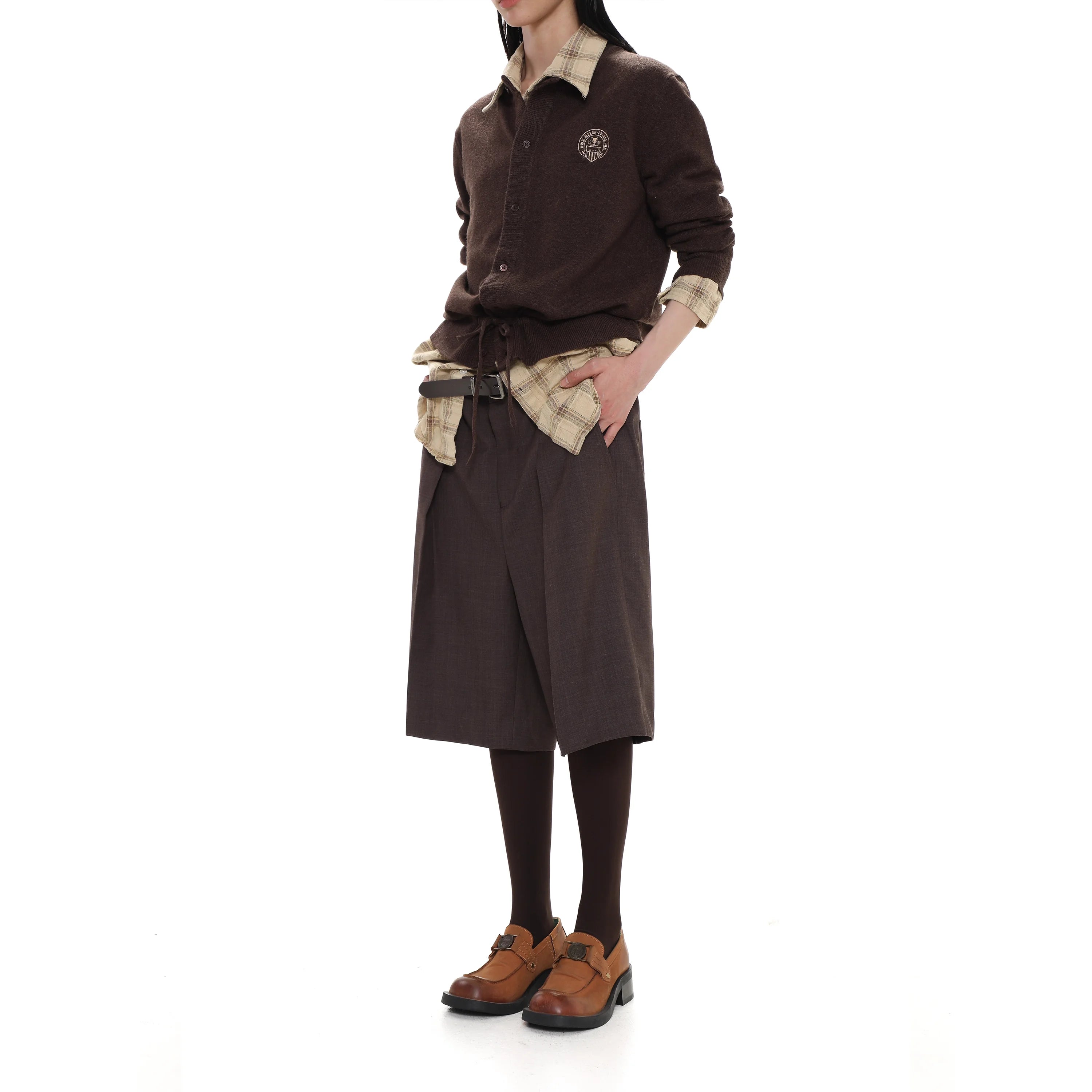 These women's high-waisted shorts are crafted from a wool-blend fabric, offering a structured drape and a double-pleated front for a refined silhouette. Designed in a rich brown tone, they feature a knee-length wide-leg cut and come complete with a coordinating belt. The tailored look adds a sophisticated touch, ideal for layering with seasonal pieces.