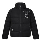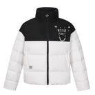 Stay warm in style with this women's winter puffer jacket featuring a bold football-style colorblock design. Crafted with 90% white duck down, the jacket is lightweight, soft, and offers excellent heat retention. Decorative pearl-like embellishments on the shoulders add a fashionable edge to the sporty silhouette. The stand collar enhances warmth and coverage, making it perfect for cold-weather wear.