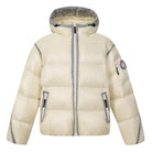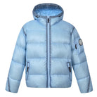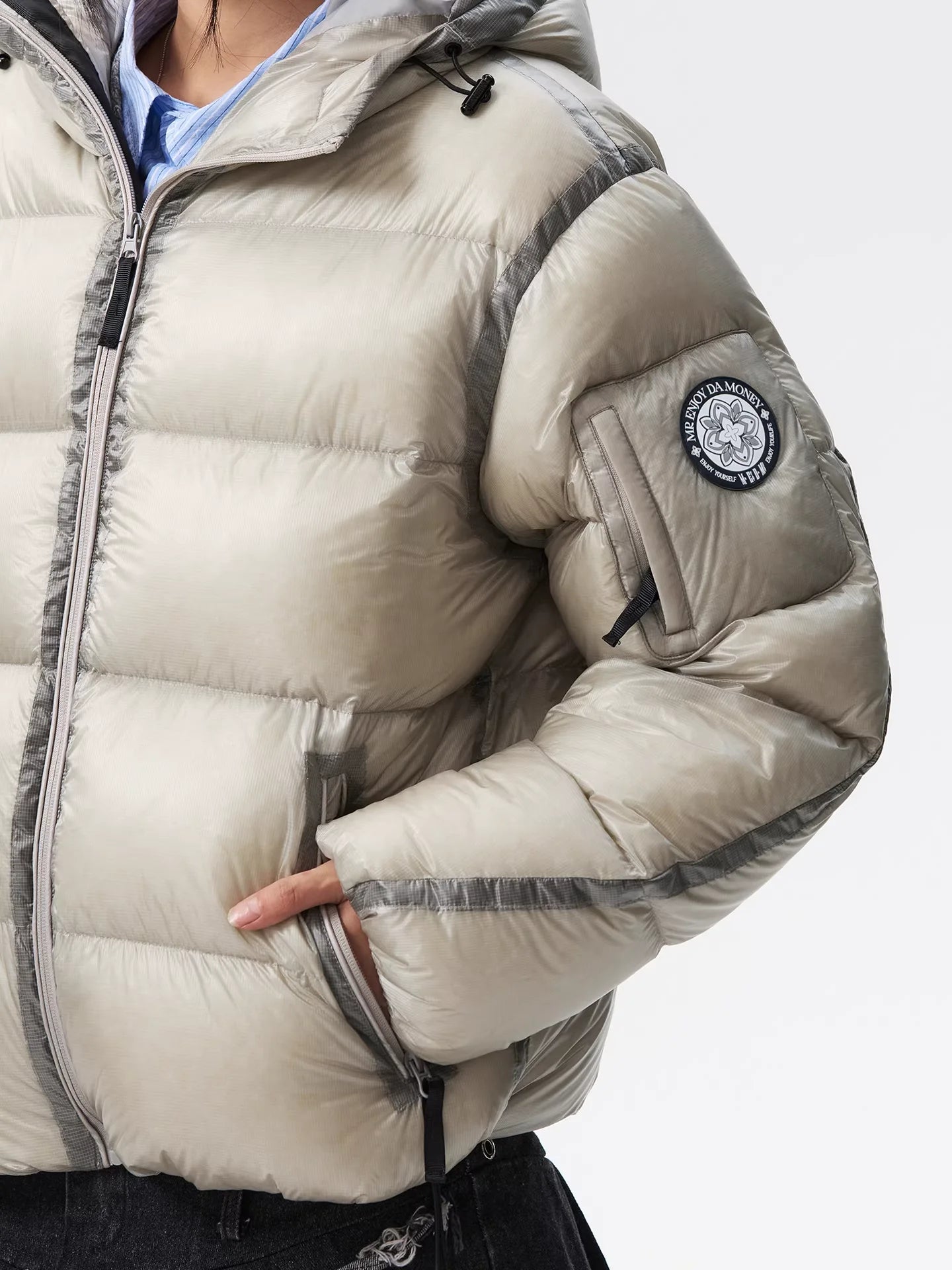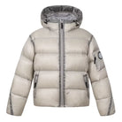 Stay warm and stylish with this lightweight women's puffer jacket, filled with 90% white duck down for superior insulation. Designed with a high collar, attached hood, and front zipper closure, this jacket offers both comfort and protection against the cold. Featured in a trendy metallic silver-grey finish, it also includes a badge detail on the upper sleeve for added style.