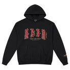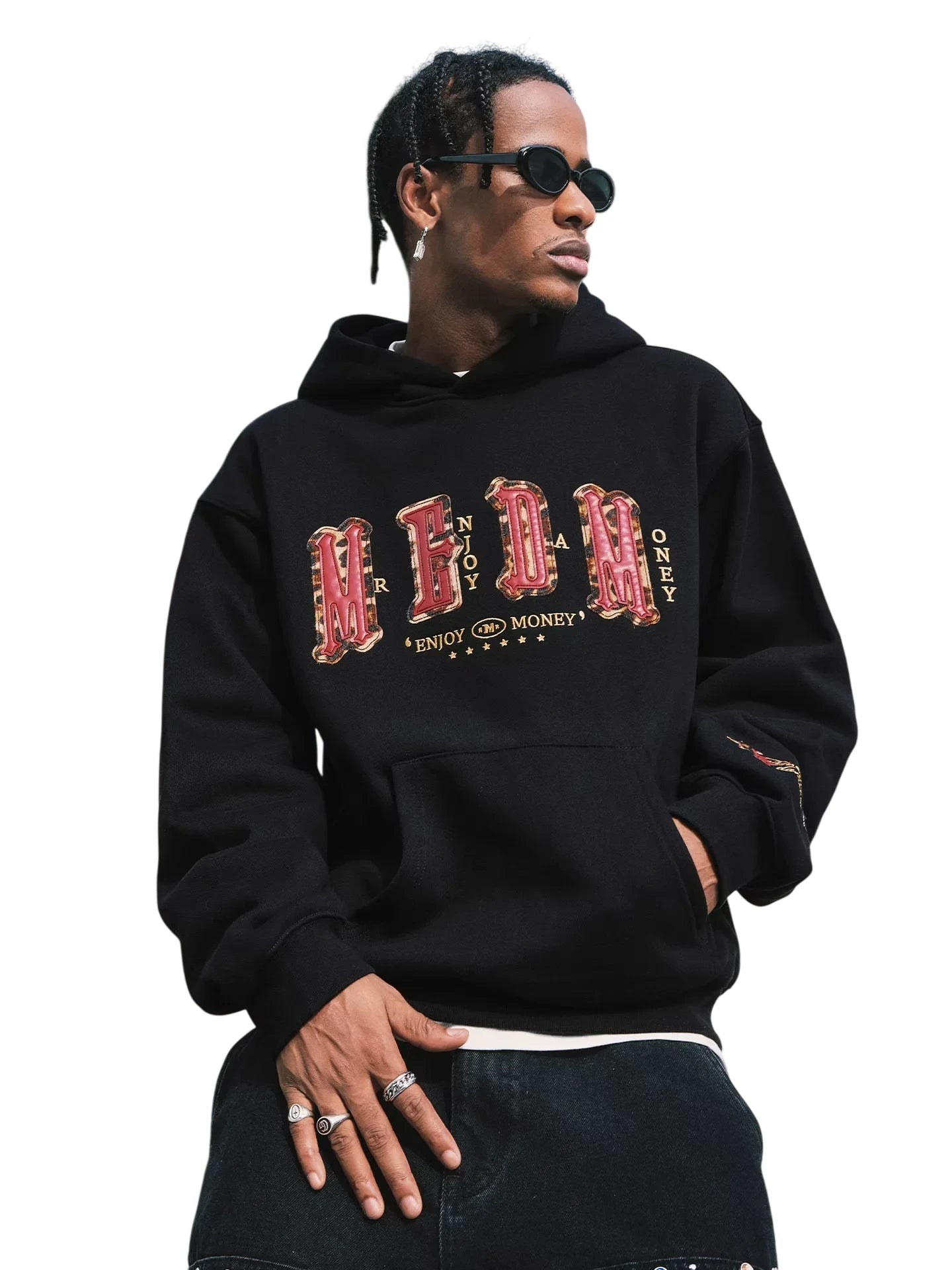 This men's oversized hooded sweatshirt features bold embroidered lettering across the chest, showcasing a striking four-letter design with intricate embellishments and gold star accents. Designed in a loose fit for casual comfort, it includes ribbed cuffs and a front kangaroo pocket. Ideal for streetwear enthusiasts, this hoodie is perfect for spring and autumn wardrobe rotations.