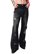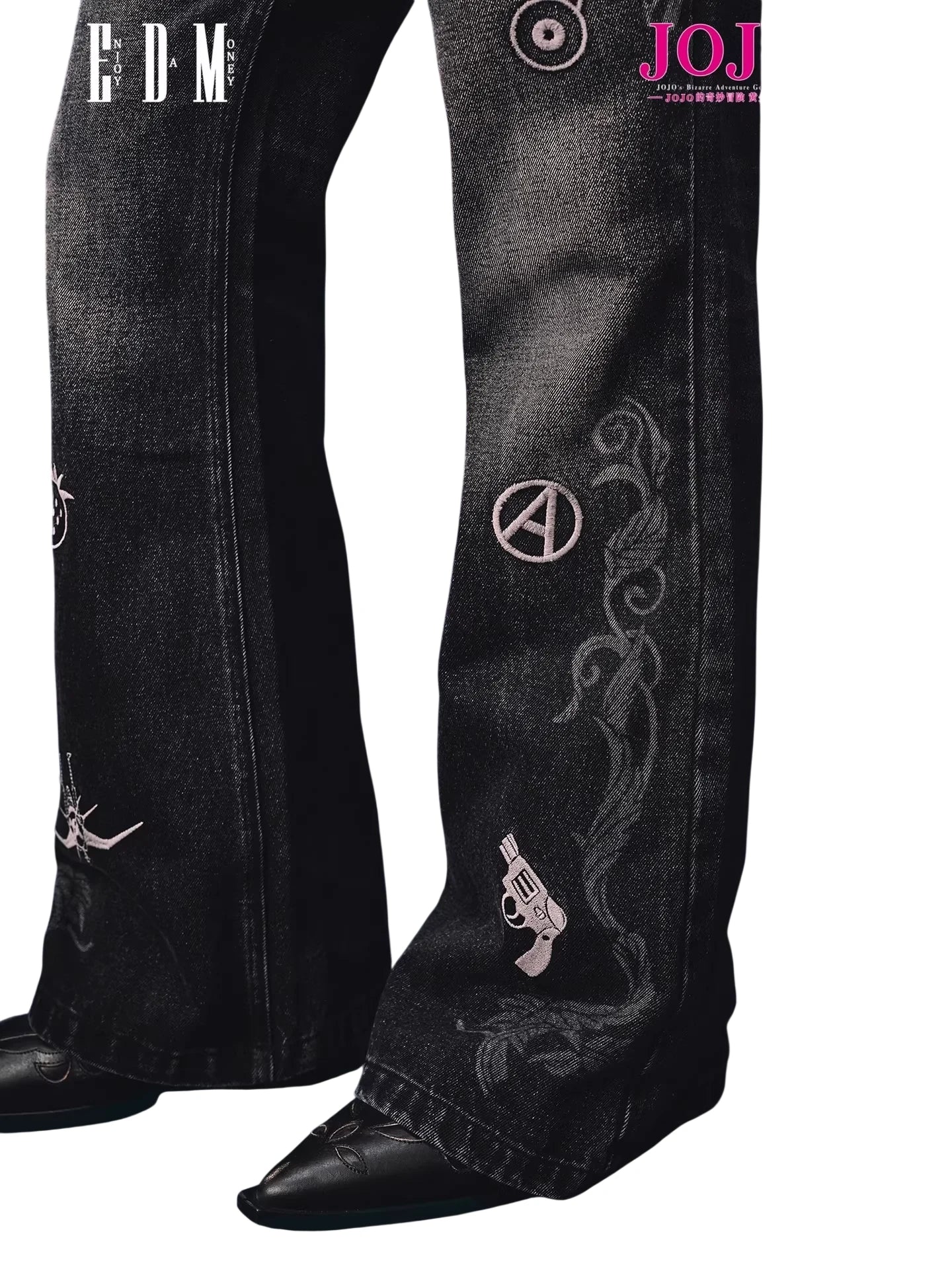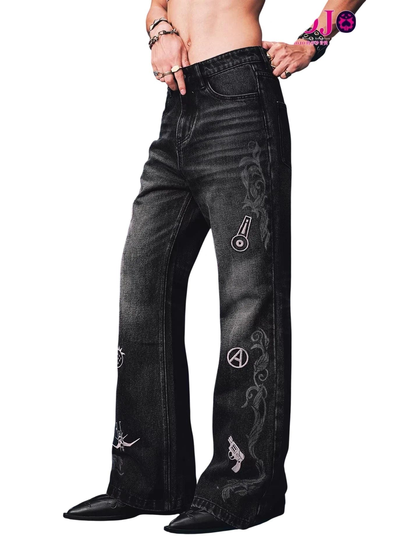 Step into bold style with these relaxed fit distressed denim jeans for men, featuring unique embroidered motifs inspired by iconic symbols. The black washed denim offers a vintage, streetwear aesthetic enhanced by detailed embroidery such as ladybugs, strawberries, and revolvers. A relaxed or subtly flared silhouette ensures comfortable, fashion-forward wear, perfect for fans of distinctive, character-driven design.