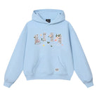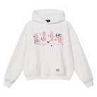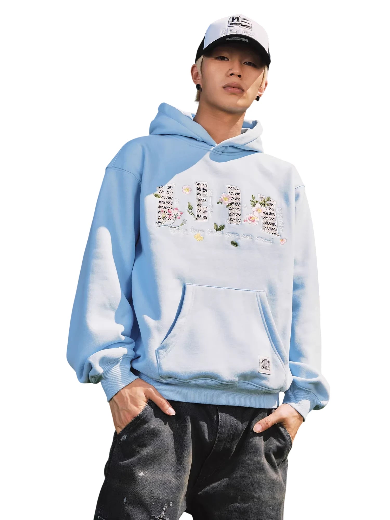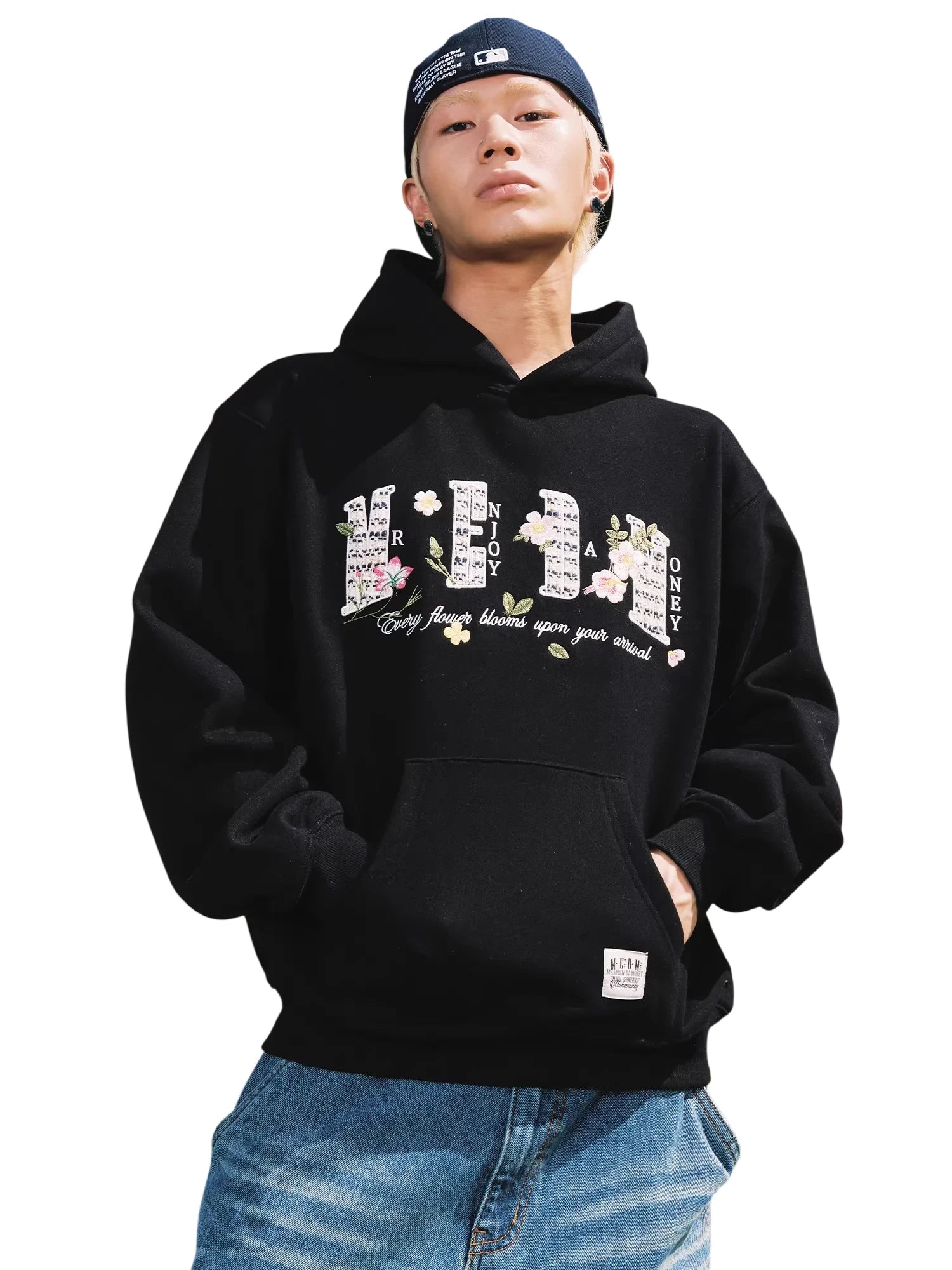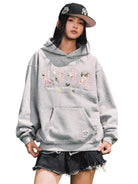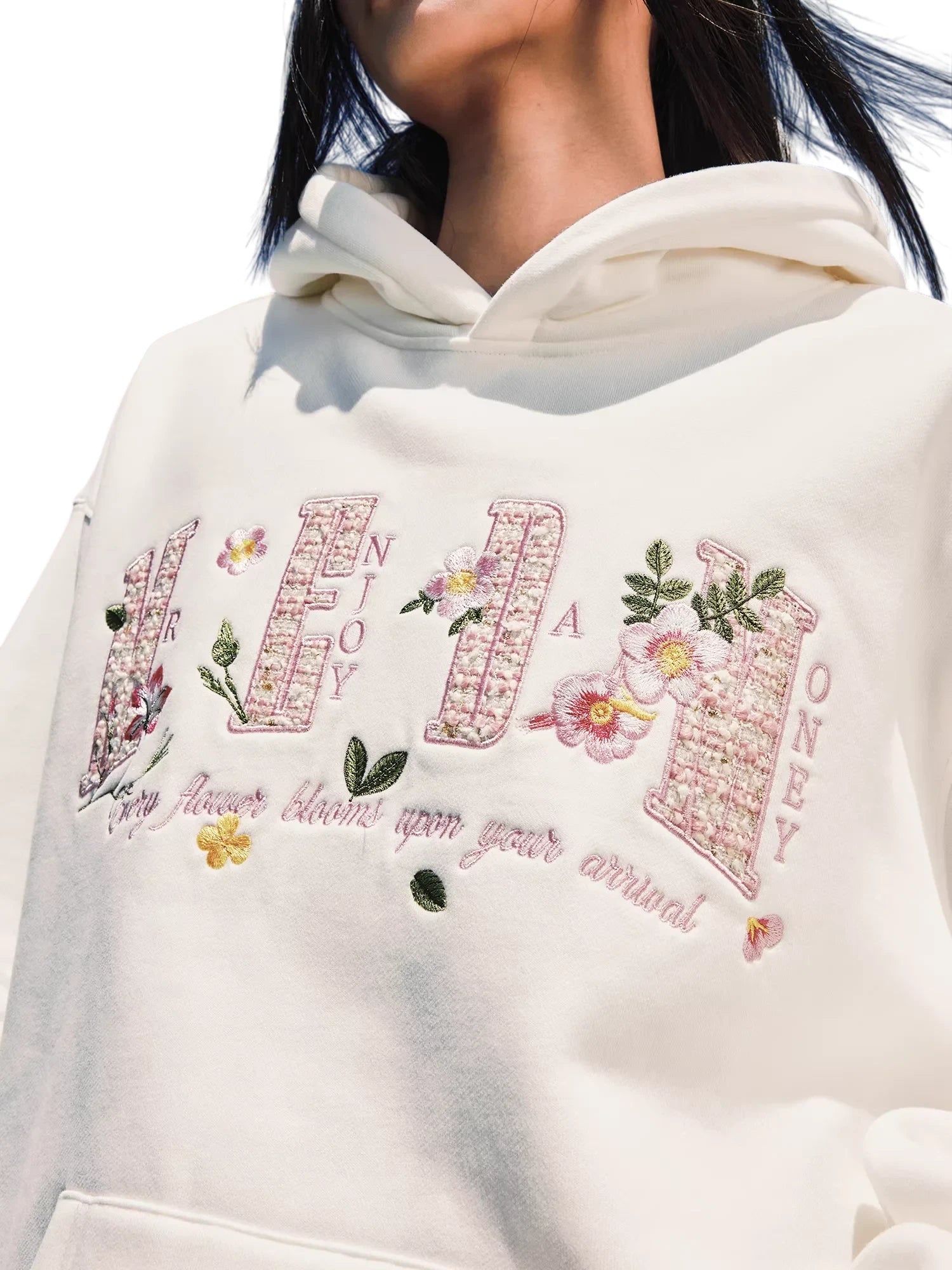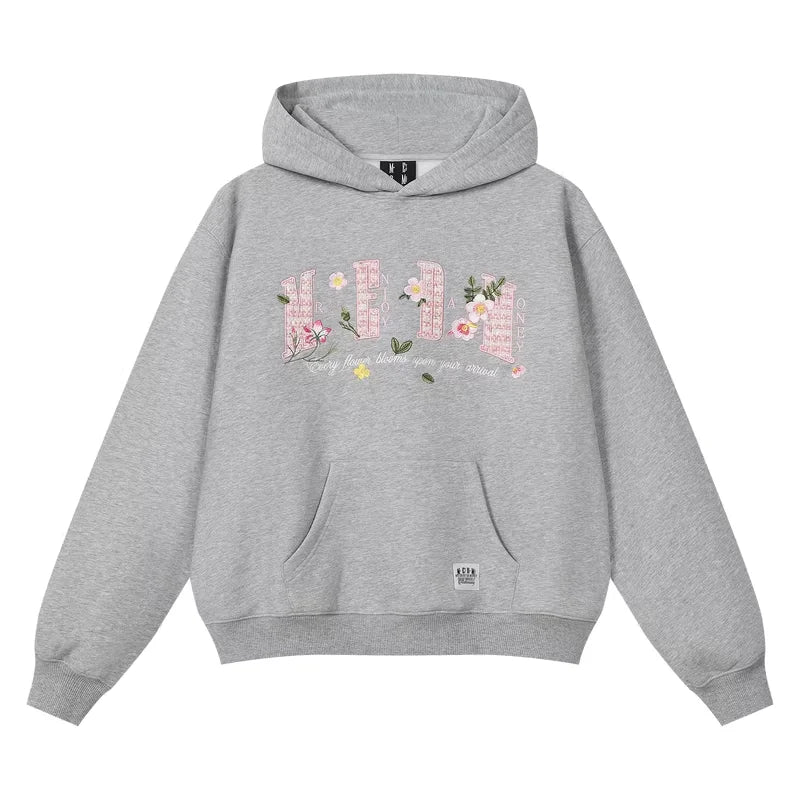 This women's loose fit pullover hoodie features delicate floral and butterfly embroidery along with stylized text that reads “HONEY ENJOY” and “Every flower blooms upon your arrival.” Designed for a casual and relaxed look, the hoodie includes a large kangaroo pocket and a comfortable hood. Perfect for commuting or everyday wear, it pairs effortlessly with jeans for a laid-back yet stylish outfit.