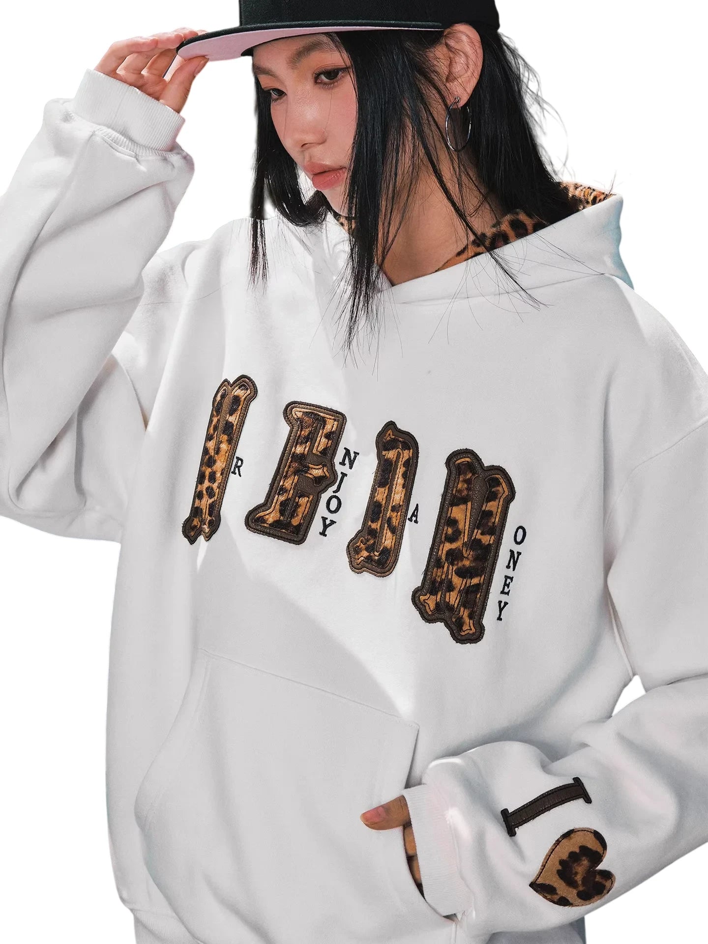 This stylish men's pullover hoodie combines comfort with a bold streetwear vibe. Featuring a double-layer faux fur design and a distinctive leopard-lined hood, it’s perfect for casual wear. The front showcases a striking graphic print that spells "ENJOY MONEY," adding a trendy urban touch. Additional features include a kangaroo pocket, ribbed cuffs, and a warm, relaxed fit suitable for everyday commutes or fashion-forward outings.