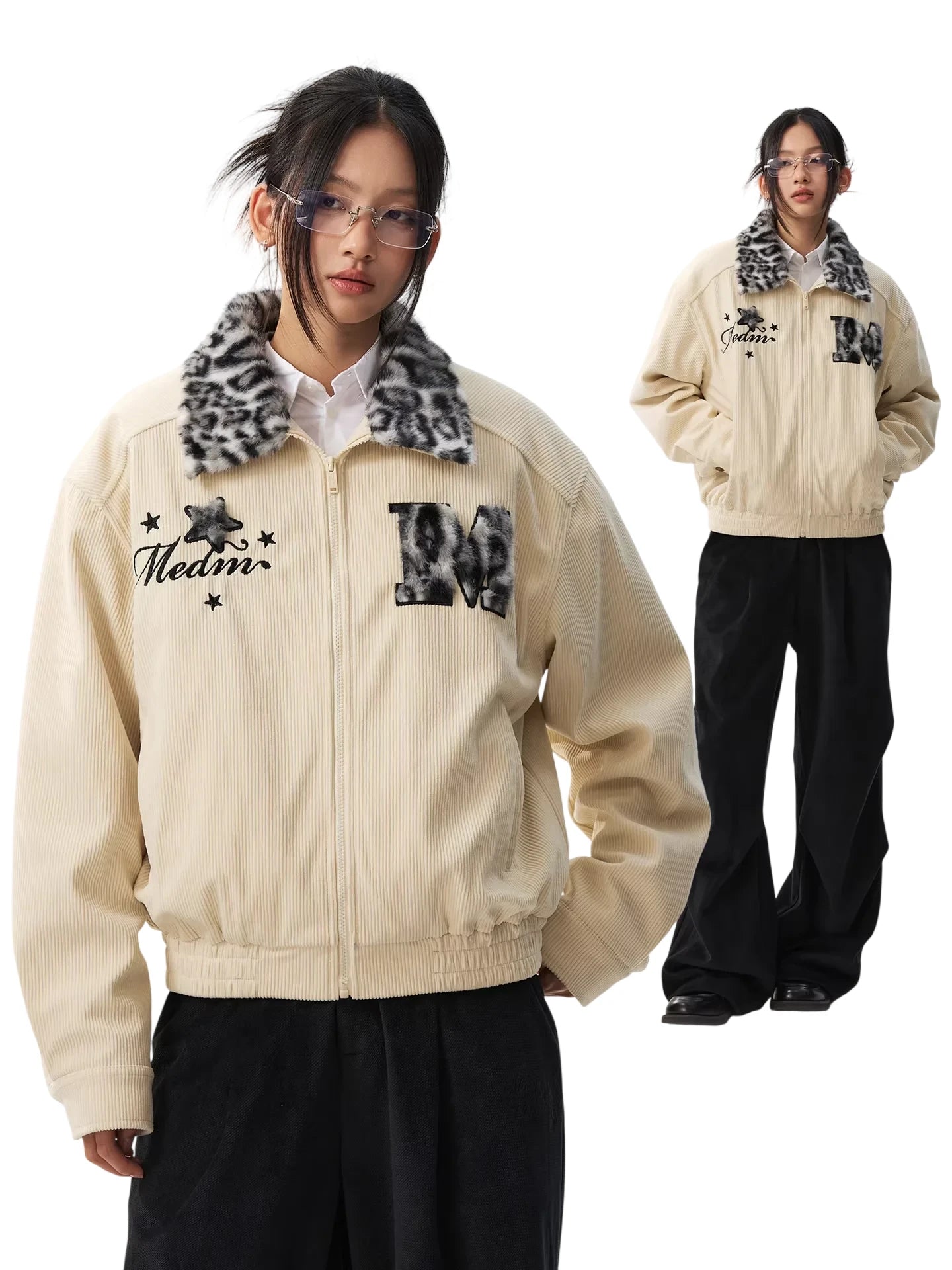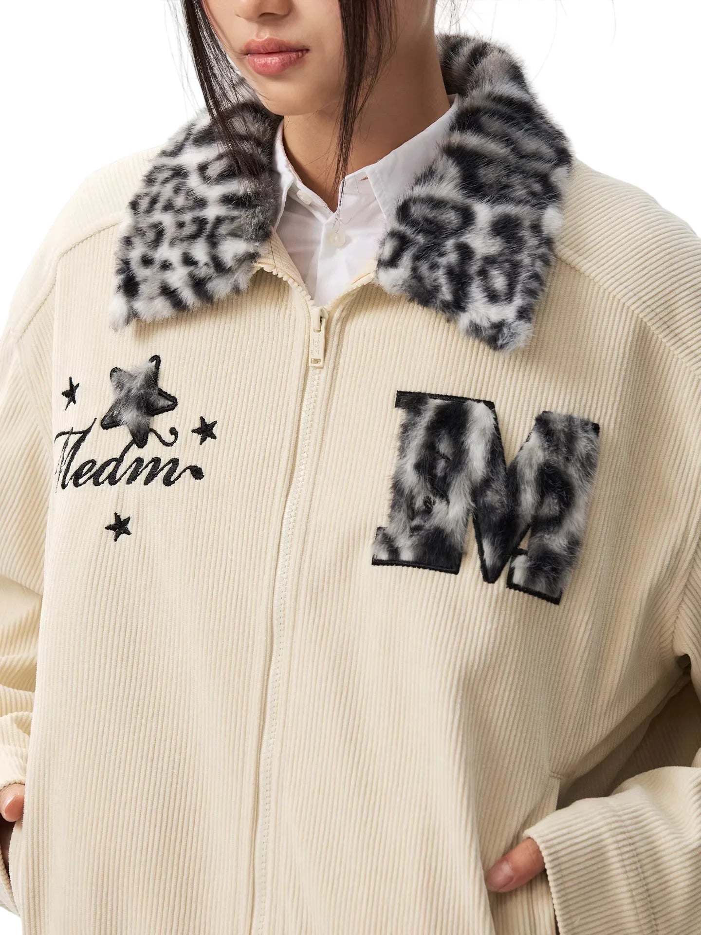 The jacket includes a full front zipper, elastic cuffs and waistband for a snug fit, and unique embroidered details on the chest. One side displays star motifs and text accents, while the other side features a bold textured 'M' patch in matching faux leopard print, tying the design together beautifully. Perfect for adding an urban edge to your winter wardrobe.