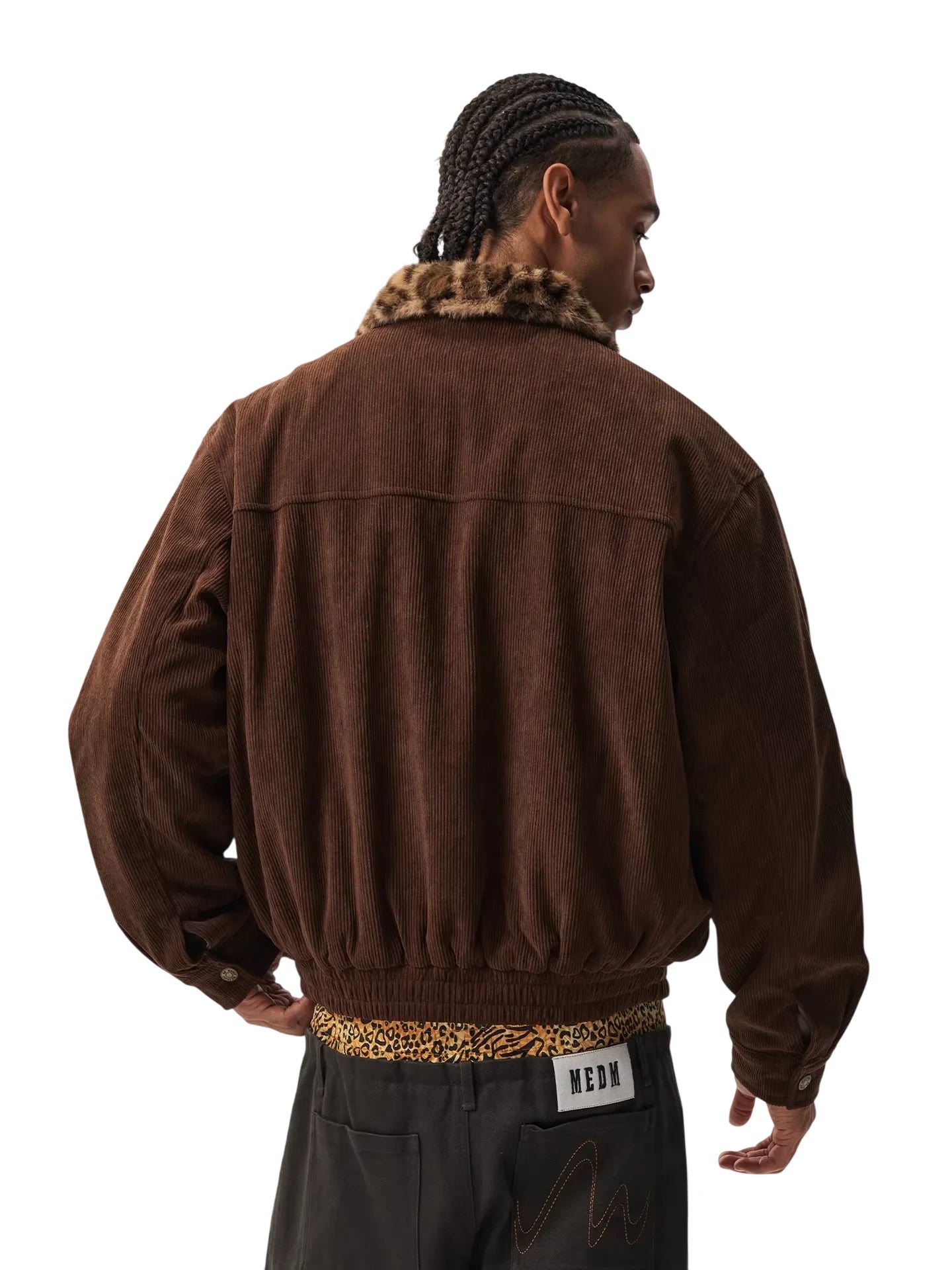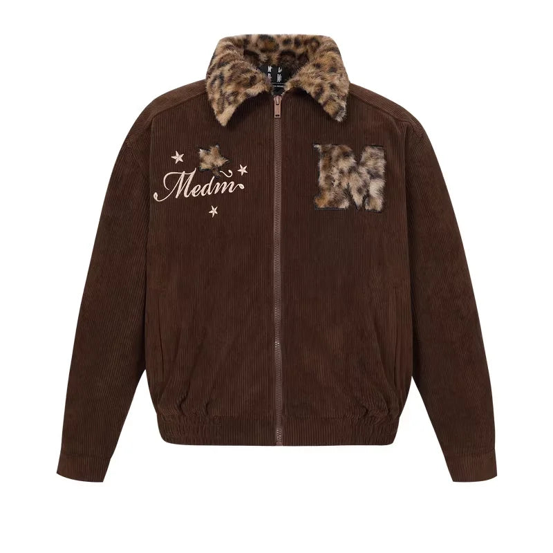 Stay warm and stylish with this vintage-inspired cotton-padded jacket designed for both men and women. Made from rich chocolate brown corduroy, it features a standout faux fur leopard-print collar for a bold yet cozy touch.
