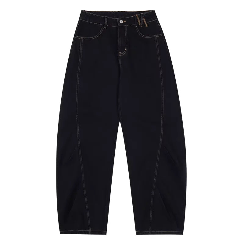 These men's wide-leg jeans feature bold contrast stitching along the seams, adding a unique touch to their relaxed, retro design. Crafted for comfort and style, they offer a loose draped fit with a mid-rise waist, making them ideal for casual wear during spring and autumn. Functional side pockets enhance their practicality, while the laid-back silhouette makes them a standout addition to any modern streetwear wardrobe.