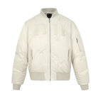 Details include a full front zipper closure, classic bomber silhouette, and a zippered sleeve pocket on the left arm. Ideal for cold-weather urban wear, this off-white jacket layers well over hoodies for a versatile street-style appearance.
