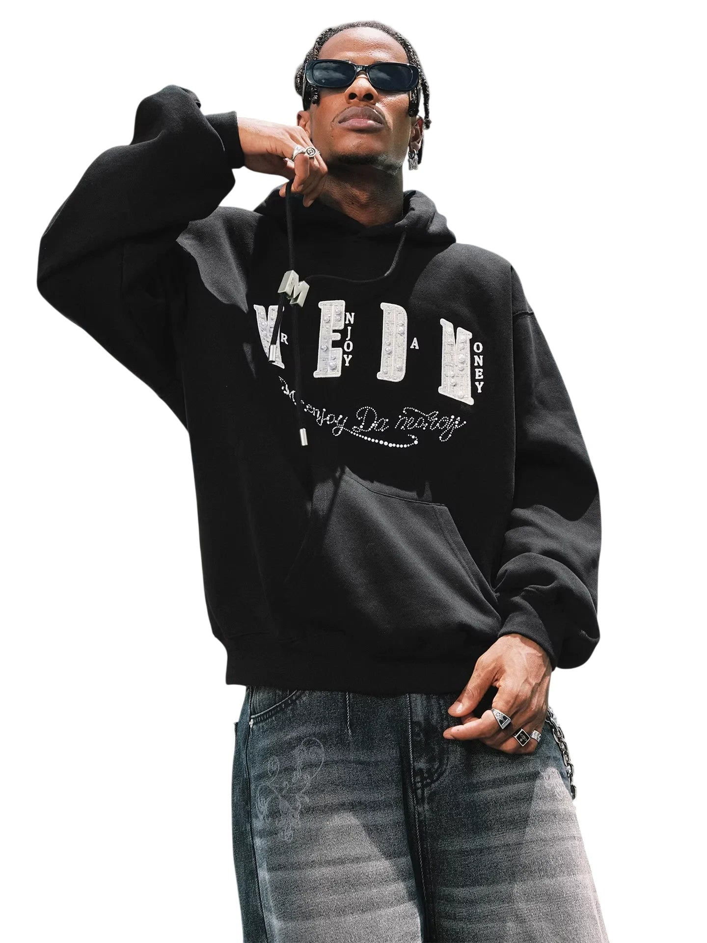 Elevate your streetwear style with this casual pullover hoodie, designed for both men and women. Perfect for spring and autumn, this long sleeve sweatshirt features a bold sequined chest logo that reads “M.D.M” with decorative cursive detail. Made with comfort in mind, it includes a drawstring hood and a relaxed fit ideal for everyday wear. Pair it with jeans or shorts for a fashionable urban look.