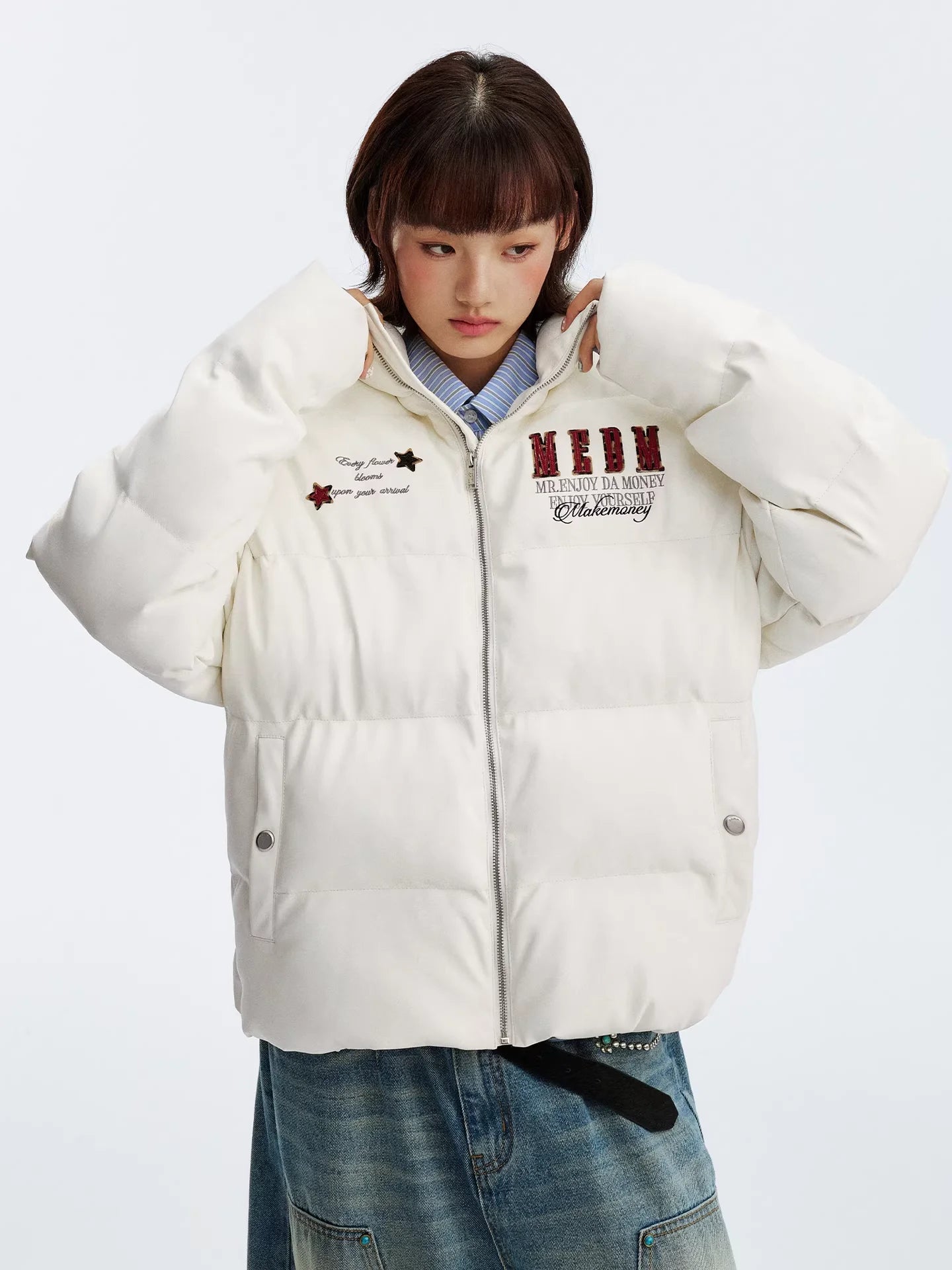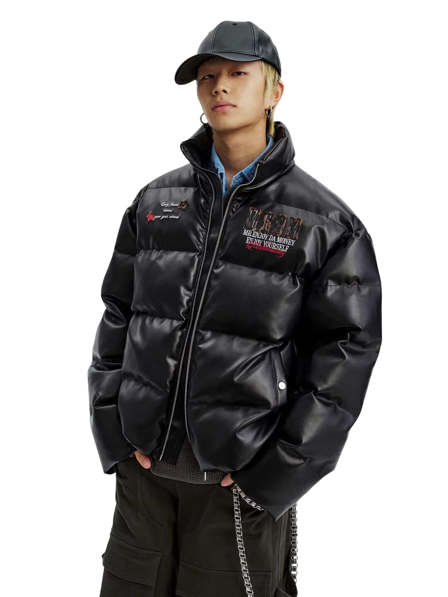 Stay cozy and stylish during the colder months with this thickened cotton jacket. Designed for both men and women, this casual winter jacket features a high stand collar for added warmth and a front zipper closure for easy wear. The jacket is made from wear-resistant PU-coated material and features decorative embroidery on the front, including star motifs and text accents. Perfect for outdoor activities or everyday use, this jacket combines comfort and durability in a fashionable package.
