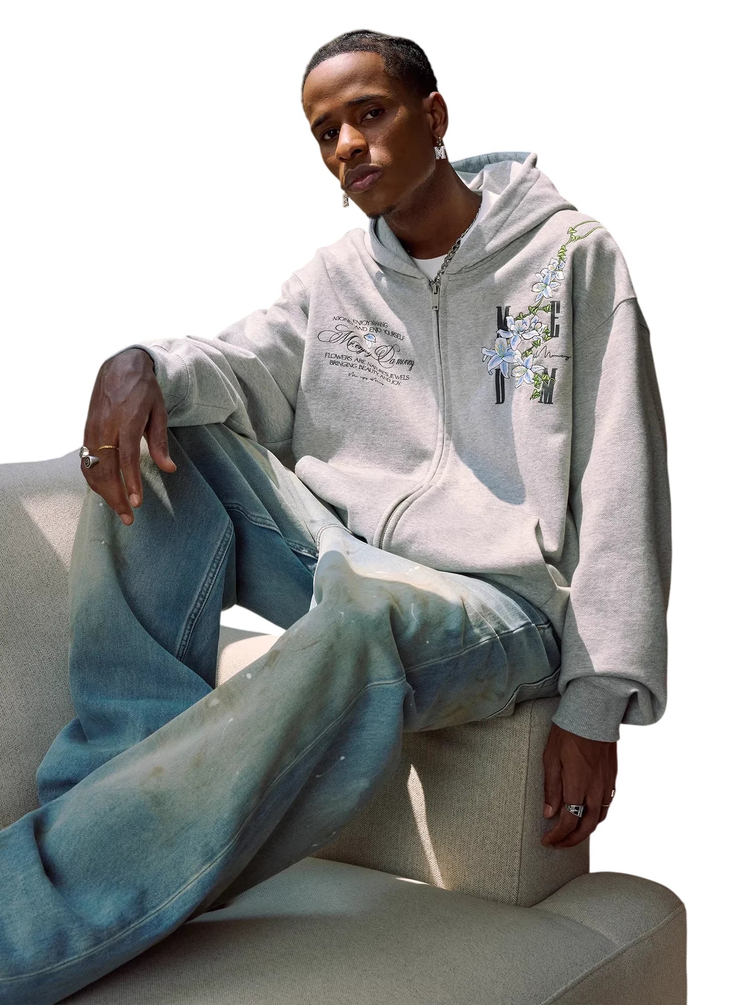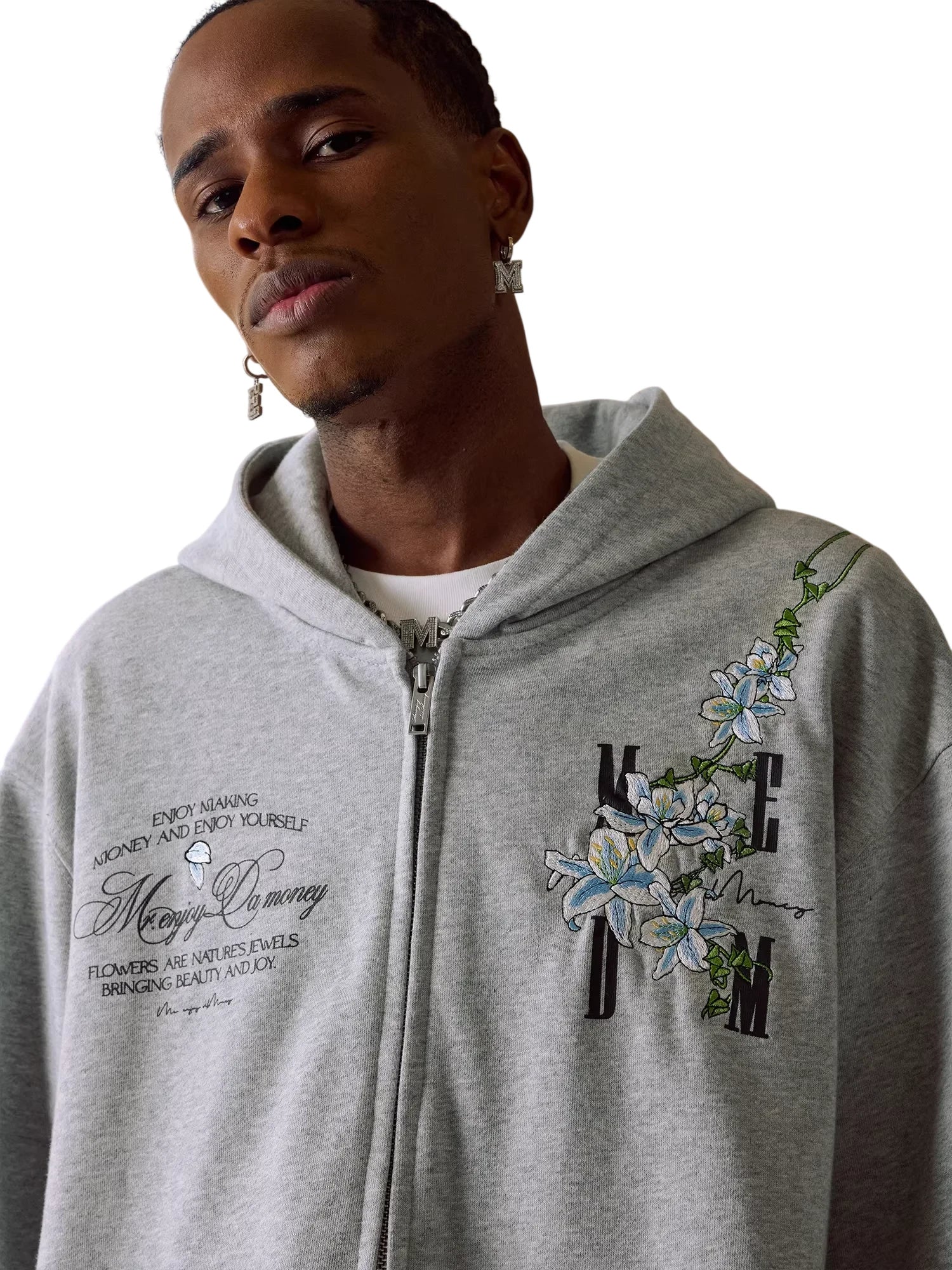 MEDM Unisex Floral Embroidered Zip Hoodie - Casual Loose Fit