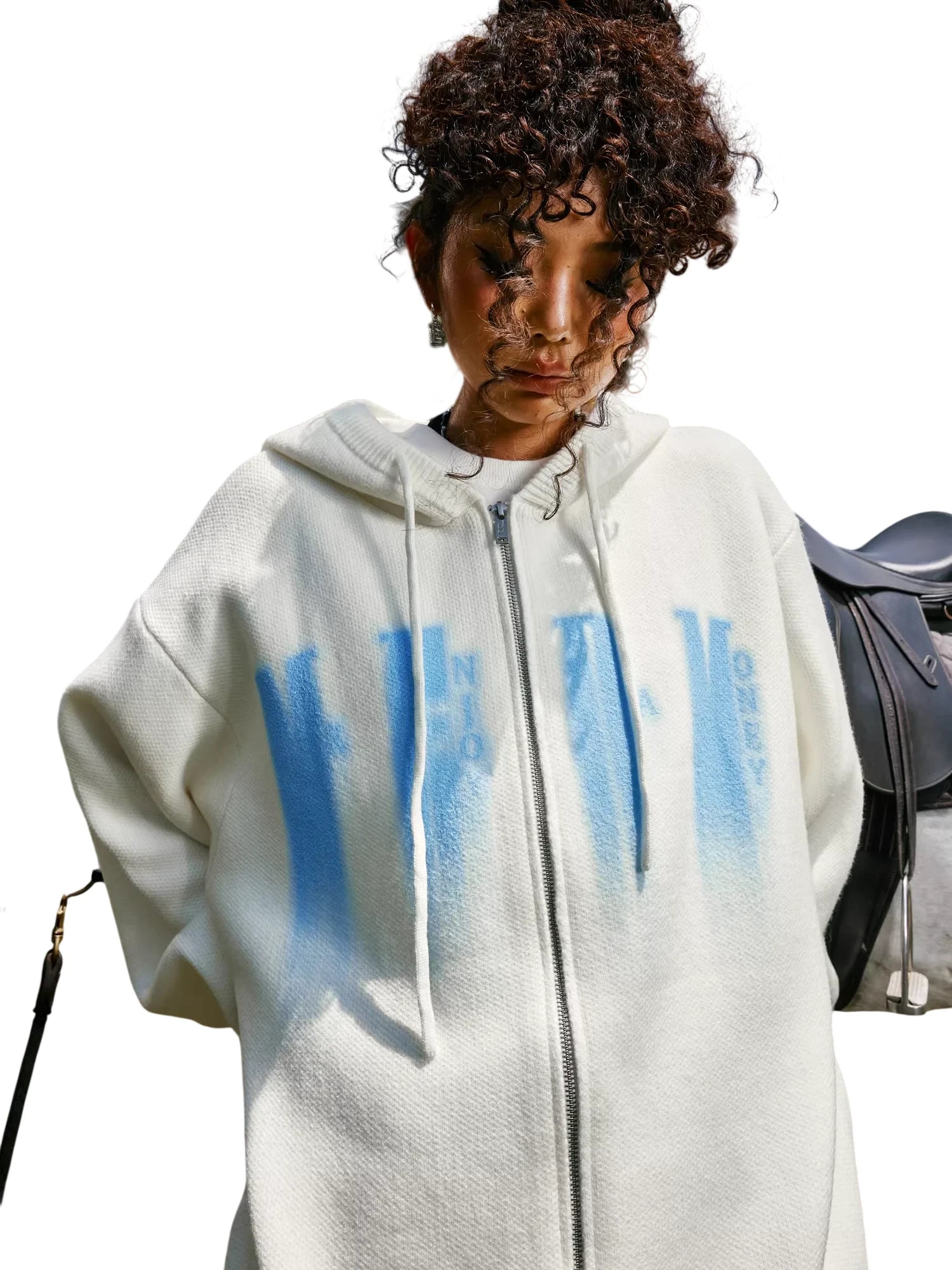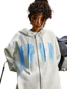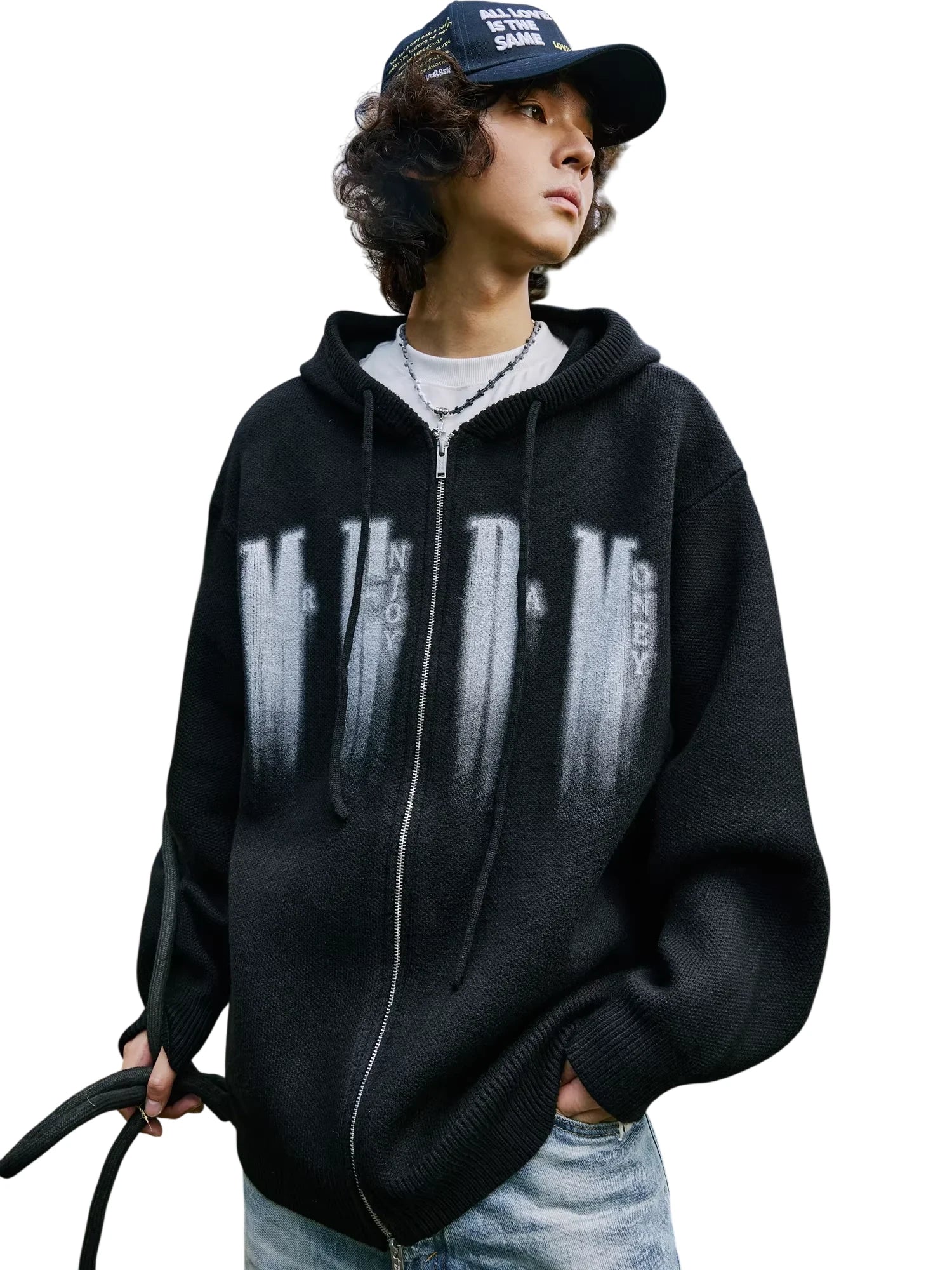 Stay comfortable and stylish with this unisex knit zip-up hoodie, designed for casual autumn wear. Made from a medium to heavy-weight fabric, it offers warmth and durability. The hoodie features a full front zipper, adjustable drawstring hood, and bold vertical graphic text that adds an urban edge to the look. Suitable for both men and women, it is perfect for layering and pairing with your favorite basics.