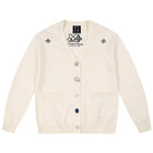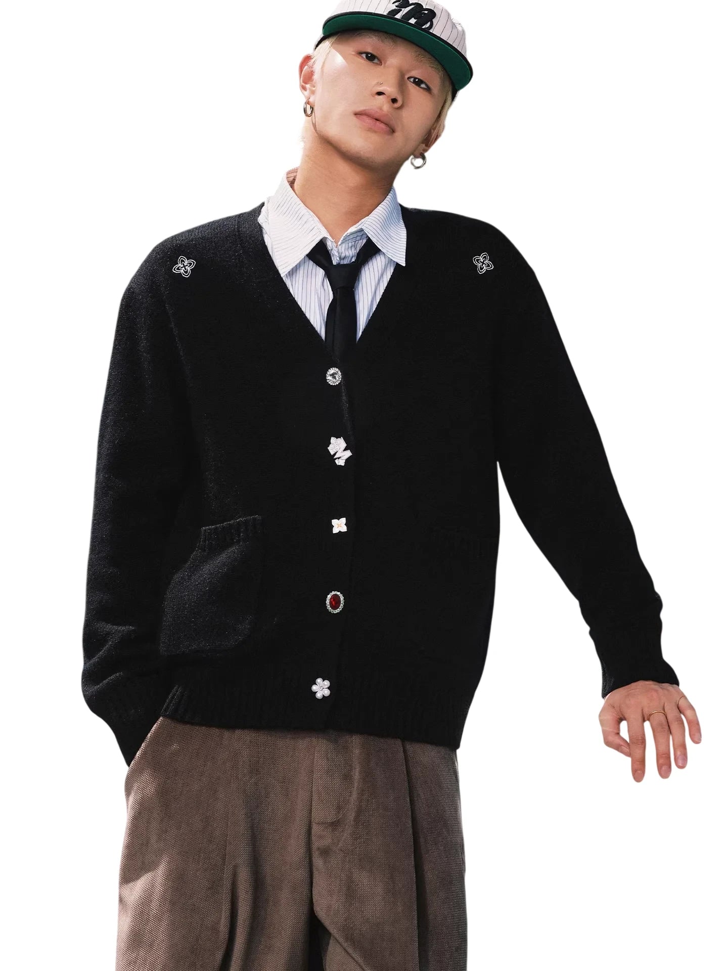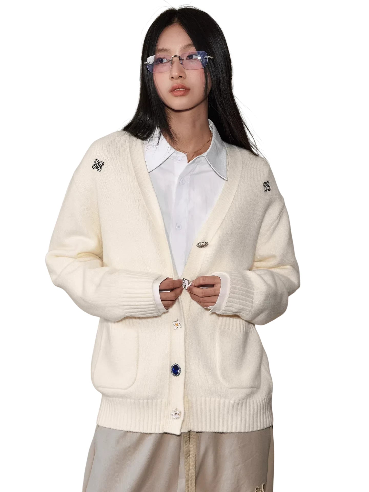 This unisex cardigan sweater features a relaxed loose fit and a stylish V-neck design, ideal for casual autumn wear. The cream-colored knit is accented with unique decorative buttons and small ornamental badges, including butterfly and floral motifs on the chest. Equipped with two front pockets, this cardigan offers both style and functionality. Layered over a crisp white collared shirt, it provides a clean, sophisticated look. Suitable for both men and women, it's a versatile piece for any wardrobe.