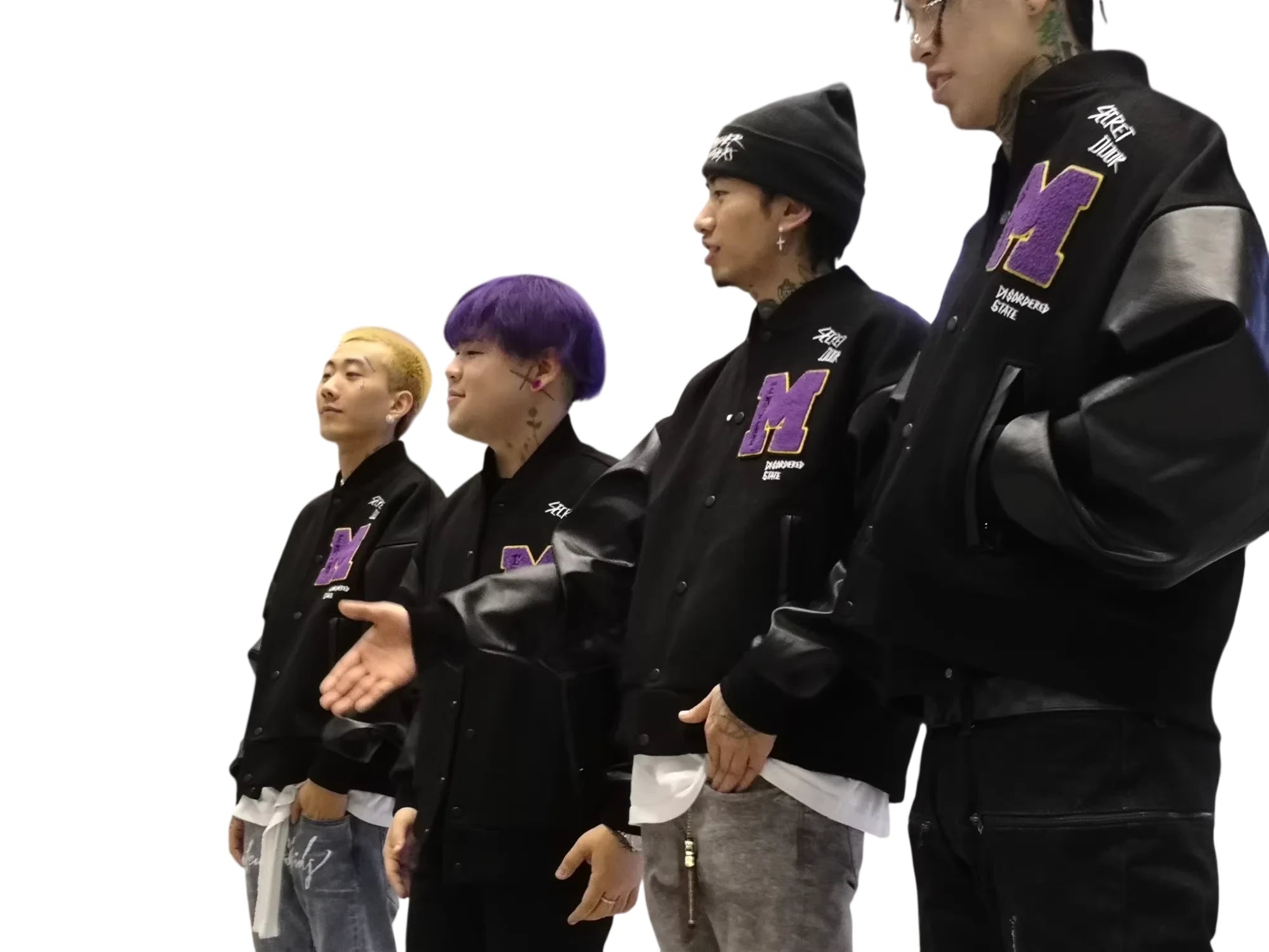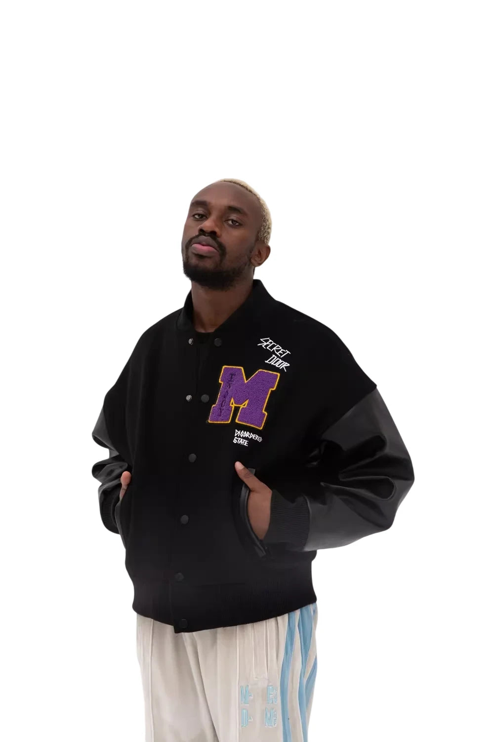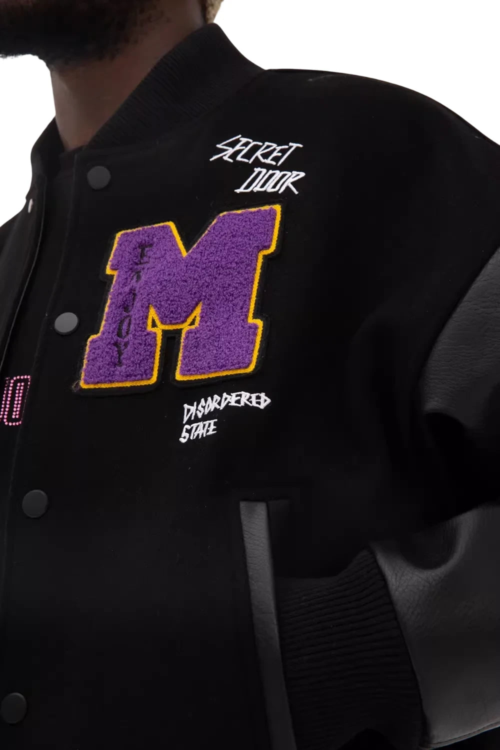 The jacket showcases varsity elements like bold letter patches and text embellishments, making it a standout piece ideal for layering. Suitable for both men and women, it blends casual comfort with fashionable edge.