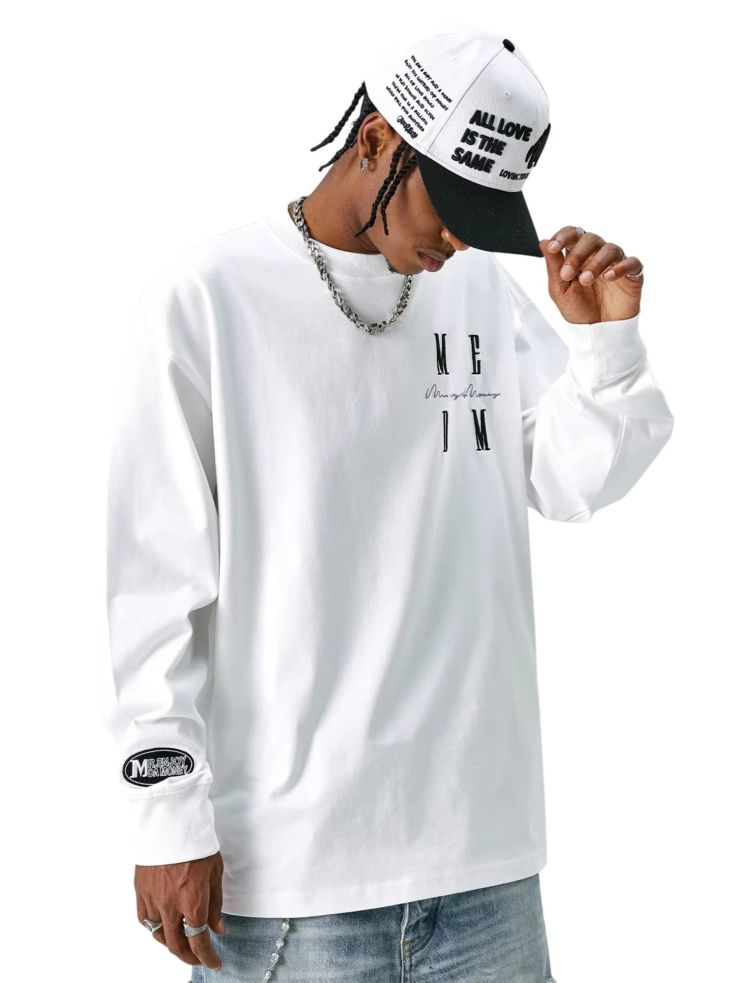 This unisex oversized long sleeve sweatshirt is perfect for spring and autumn wear. Designed with a relaxed, loose fit, it features dropped shoulder seams for a laid-back look. The front displays minimalist black typography reading "ME DM," adding a subtle and stylish detail to the overall clean design. Ideal for casual outfits, this sweatshirt pairs effortlessly with a variety of bottoms.