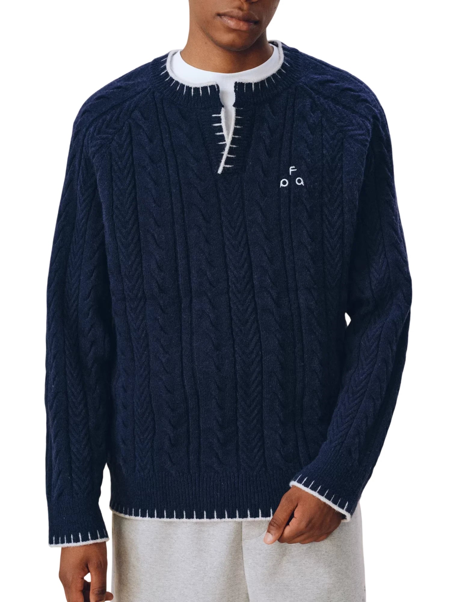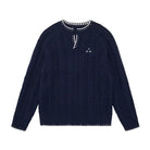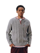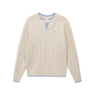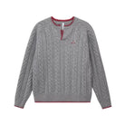 Elevate your seasonal wardrobe with this men's vintage-inspired pullover sweater, perfect for spring and autumn. Featuring a classic Henley collar and V-neck design, this high-end knit sweater offers timeless cable-knit texture with distinctive contrast stitching at the collar, hem, and cuffs. An embroidered chest logo adds a subtle touch of style, while the relaxed fit ensures casual comfort. Layer it easily over a T-shirt for a laid-back, refined look.