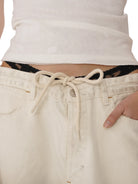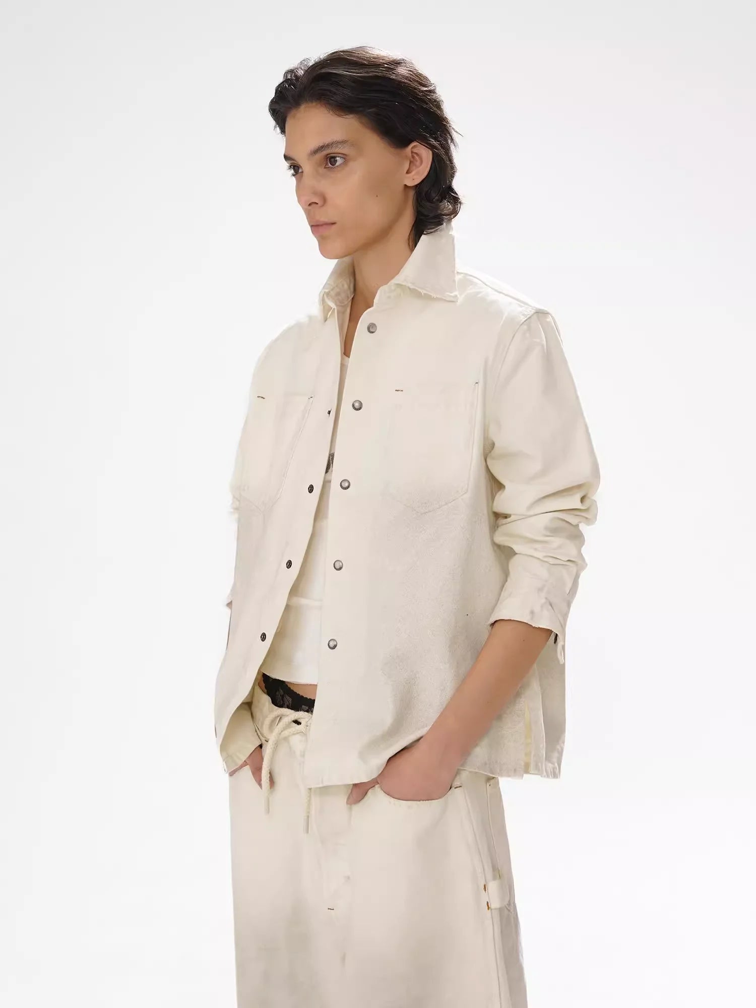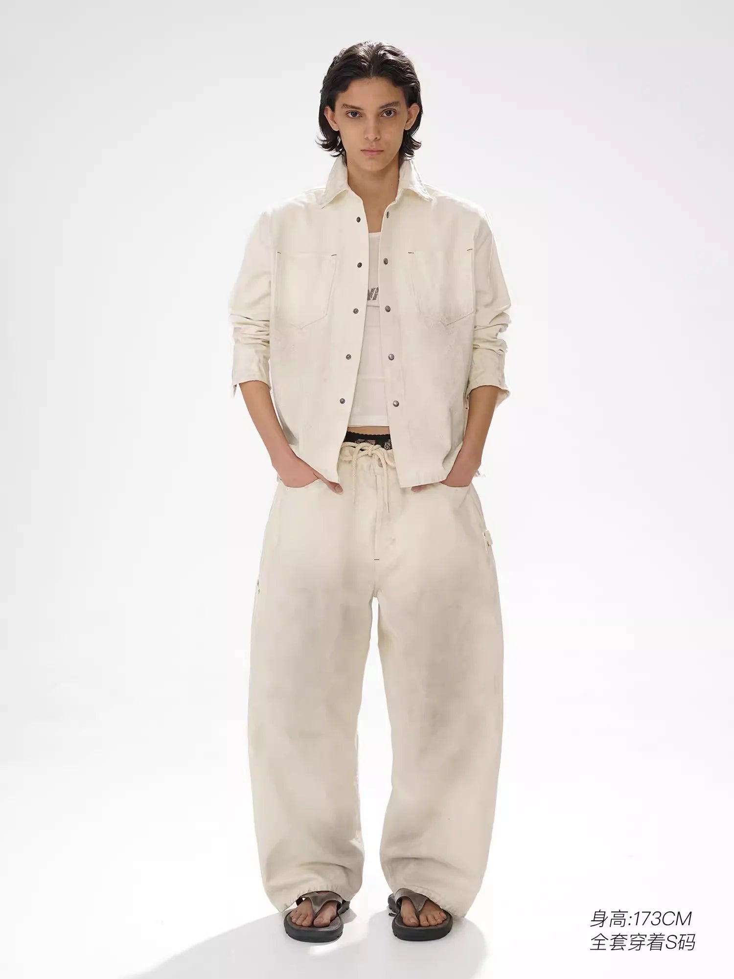 The wide-legged drawstring trousers offer a soft, faded dye effect and are designed with side pockets and visible seam detailing for an urban, laid-back aesthetic. The entire look is clean, casual, and perfect for effortless styling.