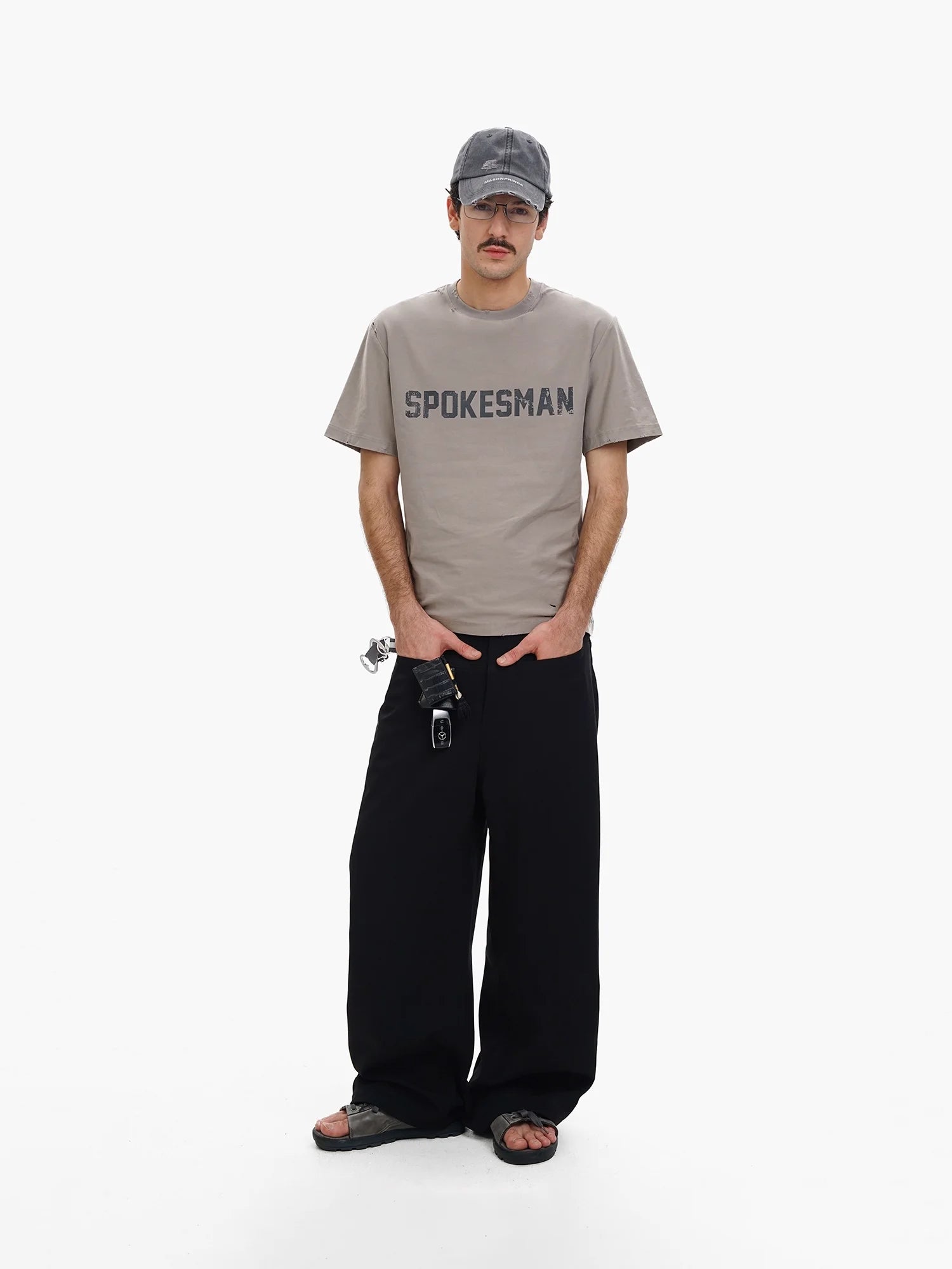 This men's short-sleeve T-shirt features a bold, distressed "SPOKESMAN" graphic across the chest, adding a vintage-inspired look to casual wear. Designed with a regular fit and classic crew neckline, it is crafted from a soft, comfortable cotton fabric in a grayish-tan hue. Ideal for everyday wear, this tee pairs effortlessly with jeans or shorts for a laid-back, stylish outfit.
