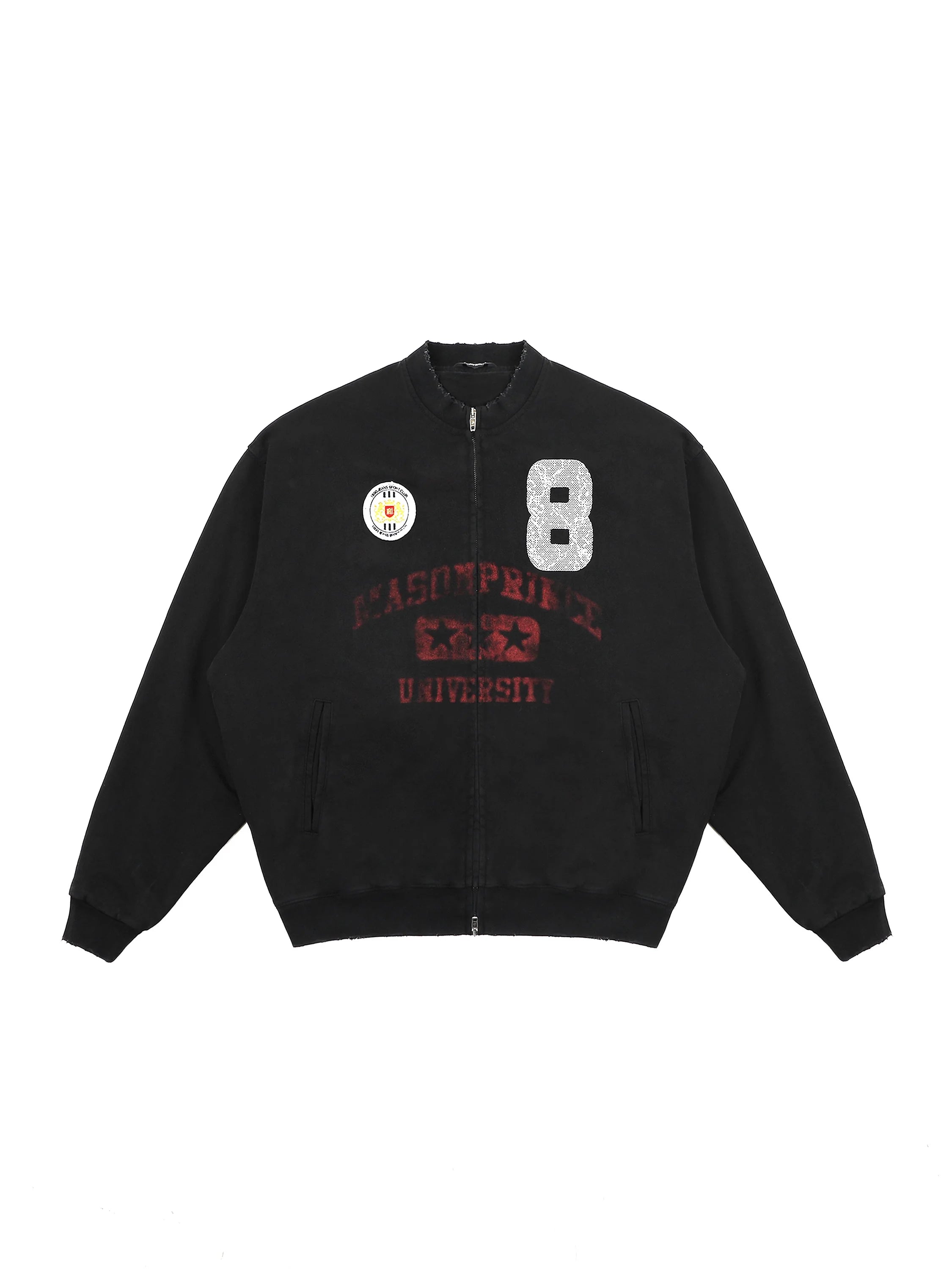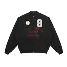 This men's varsity-style jacket features a sleek black exterior with distinctive embroidered and printed details. Standout elements include a sparkling silver number "8" on the right chest, a colorful round patch on the left chest, and faded red collegiate lettering across the front reading "MASONPRINCE UNIVERSITY" with accompanying stars and varsity-inspired graphics. Designed with a premium double-layer construction, it offers warmth and structure. Ribbed cuffs and hem add comfort and style, while side pockets provide practical storage. Perfect for a sporty yet street-ready look.