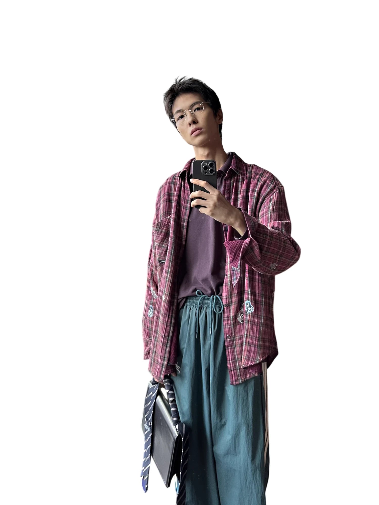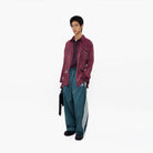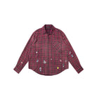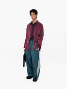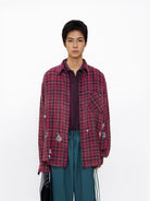 This men's casual flannel shirt showcases a gradient plaid pattern in rich dragon fruit-inspired maroon tones, perfect for early autumn styling. The loose-fitting design allows for effortless layering, as demonstrated over a plum polo shirt. Featuring a relaxed silhouette, this piece blends comfort with modern streetwear appeal, making it ideal for everyday wear during transitional seasons.