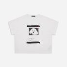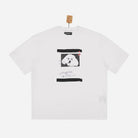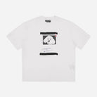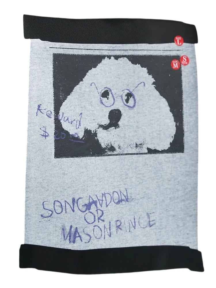 This men's short-sleeve crew neck t-shirt features a distinctive graffiti-inspired graphic on the chest. The central design showcases an illustrated fluffy white dog framed by bold black bars, accented with artistic handwritten elements and red stamp-like marks. Beneath the artwork, collaborative text adds a creative touch. Crafted from lightweight fabric, the shirt offers a relaxed fit for everyday comfort.