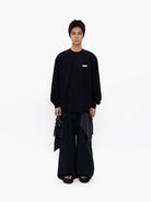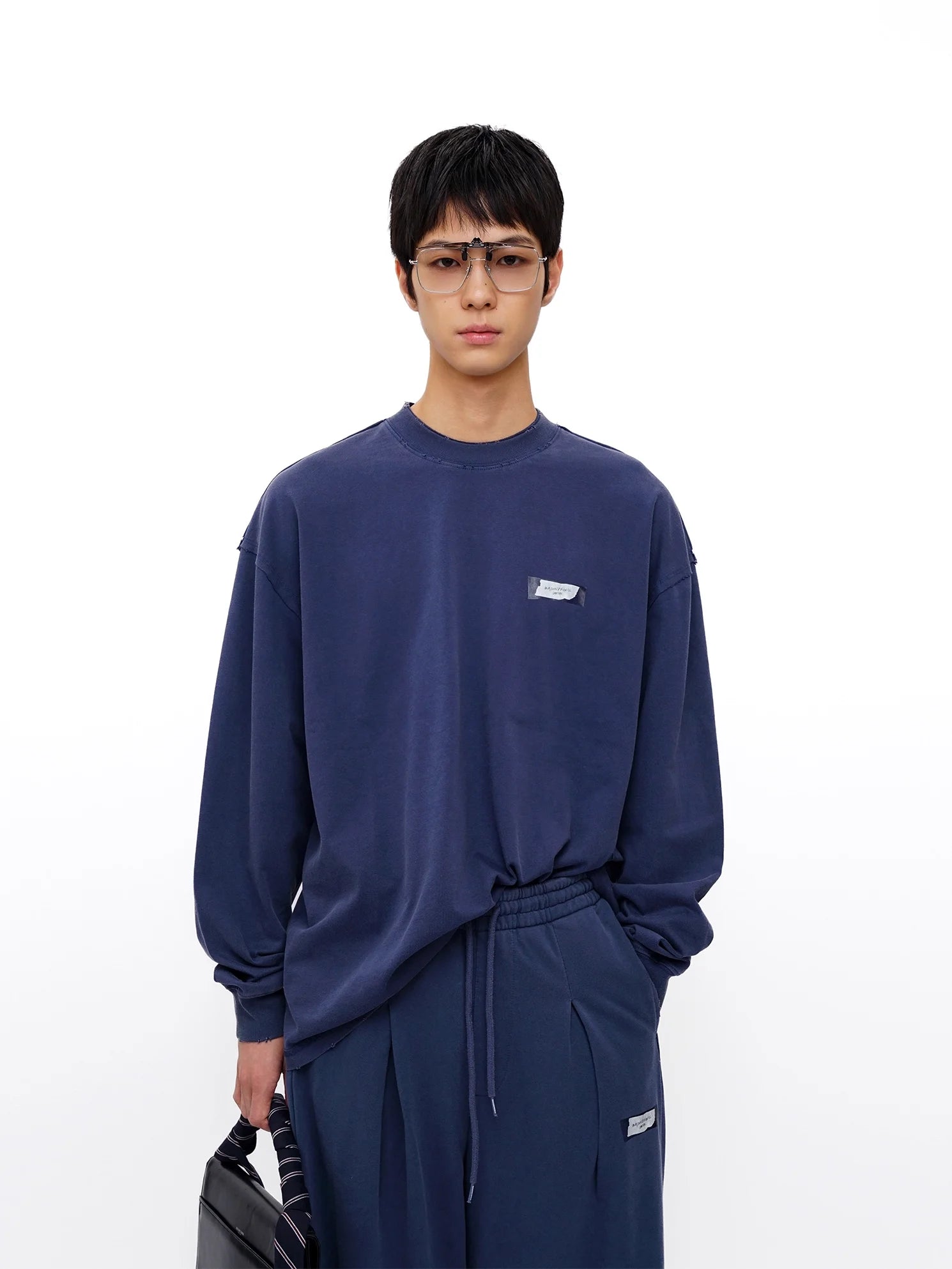 This coordinated men's outfit features a heavyweight cotton long sleeve tee paired with matching drawstring pants. Designed with a relaxed fit and dropped shoulders, the tee includes a subtle rectangular label on the chest for a minimalist touch. The pants feature pleated details and a coordinating label near the pocket, completing the cohesive look. Ideal for early autumn, this casual set combines comfort and style effortlessly.