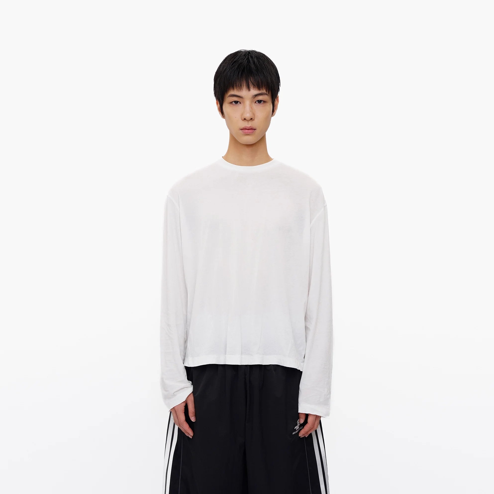 Designed for early autumn comfort, this men's long sleeve tee is crafted from lightweight cotton for a breathable and airy fit. Featuring a relaxed silhouette with slightly dropped shoulders and a classic crew neckline, it offers effortless style and versatility. The sheer white fabric adds to its casual appeal, making it an ideal layering piece or standalone staple for transitional weather.